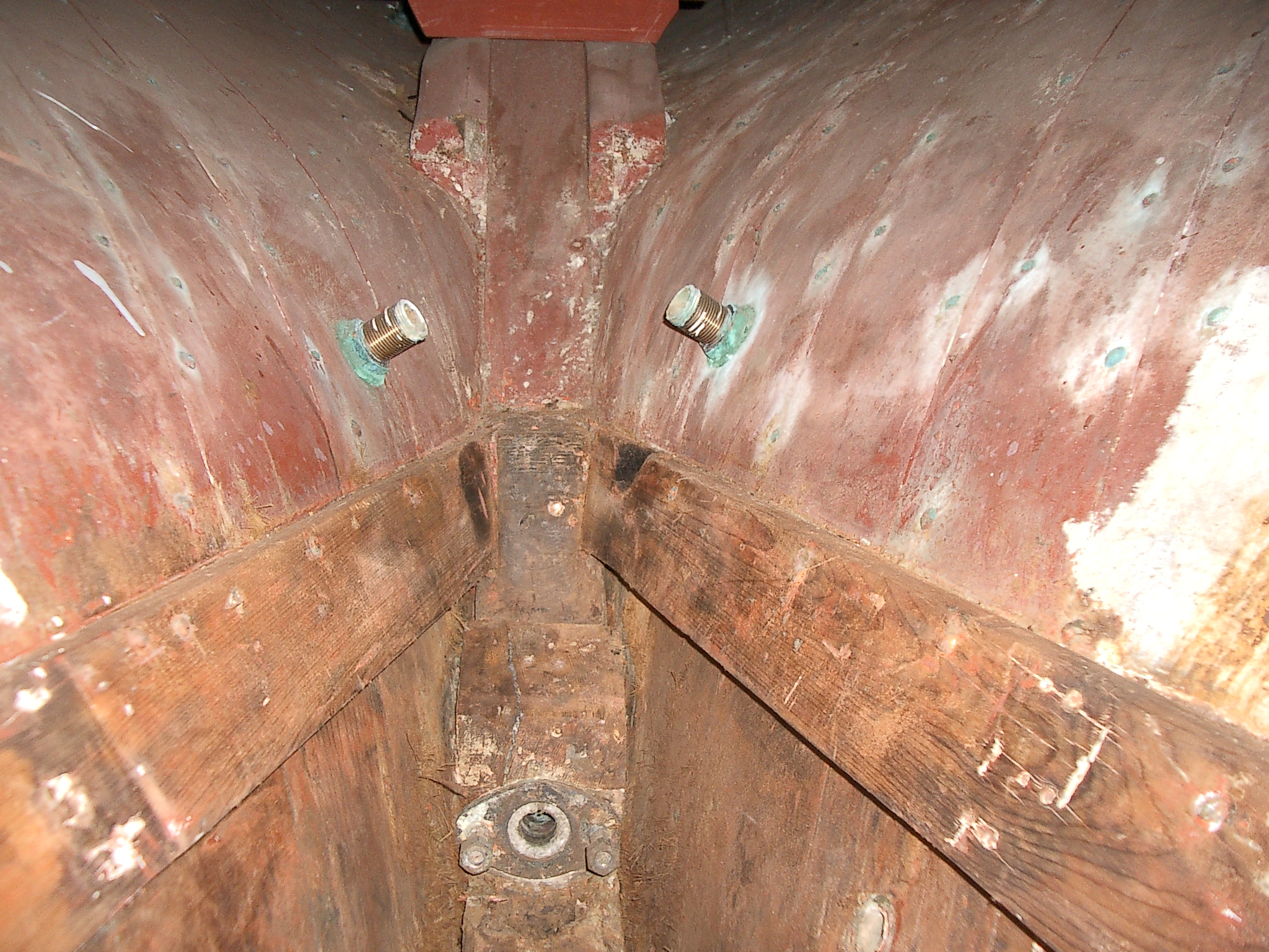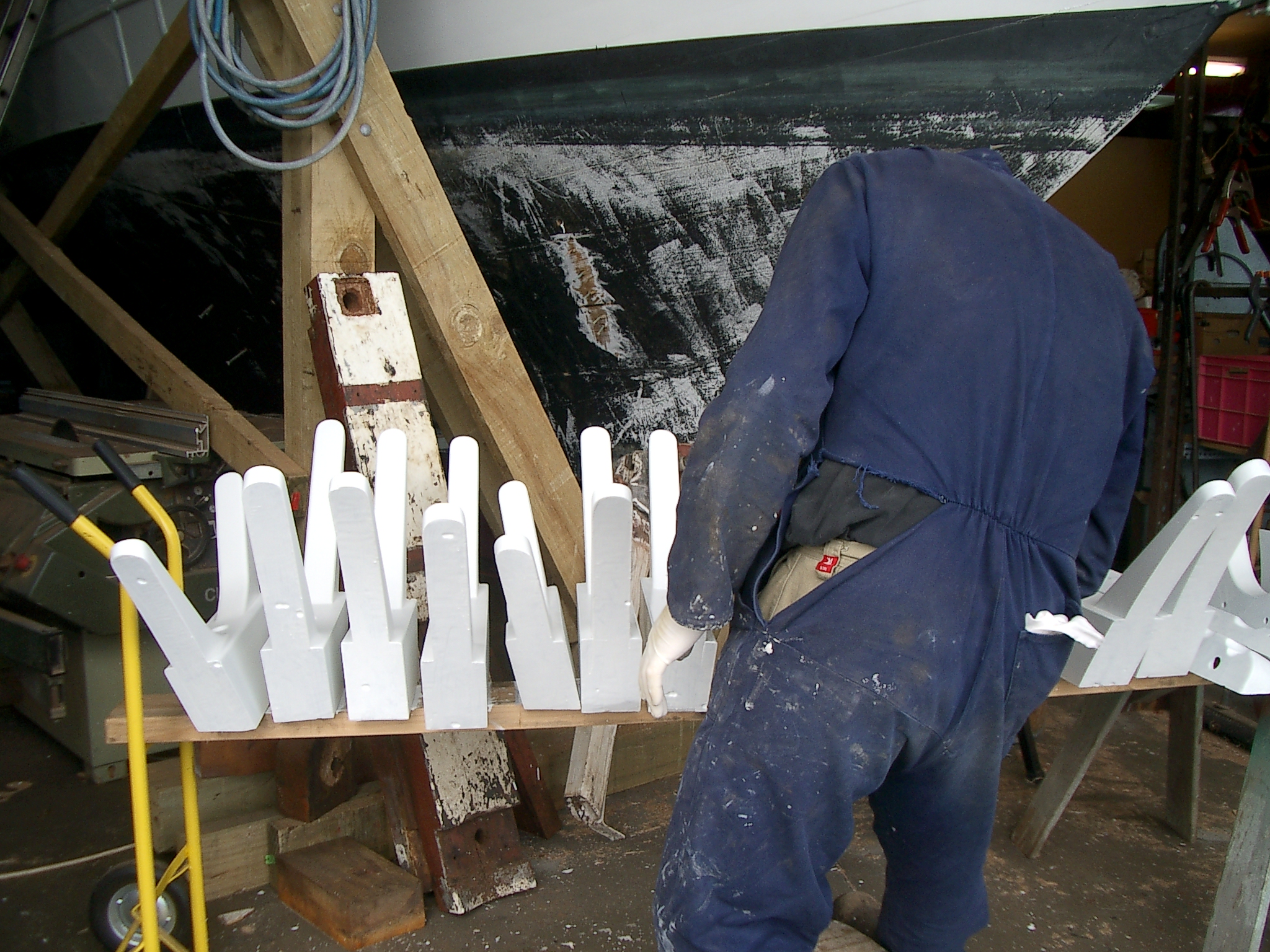 Cut off protruding bolts. Solvent scrub engine bay and clean out bilges. Epoxy seal below stringer. Sand back timber furriness and re-epoxy seal. Prime bilges x 1 coat. Undercoat bilges x 2 coats.