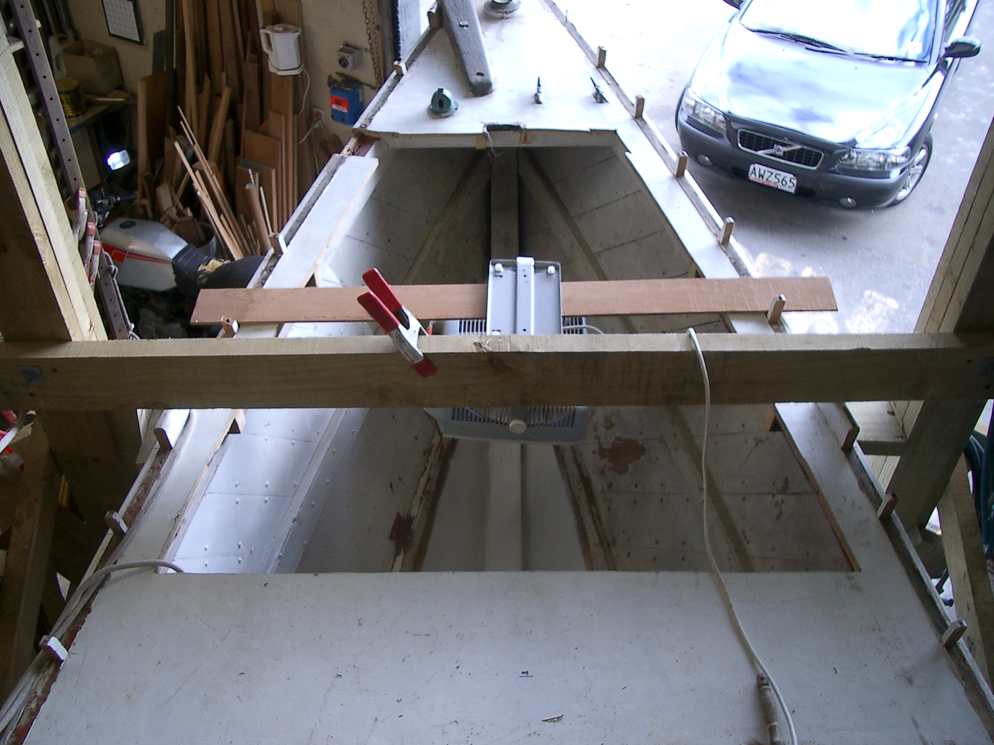 Remove toe rails, for and side decks back to cockpit. Remove cabin. Brace hull.