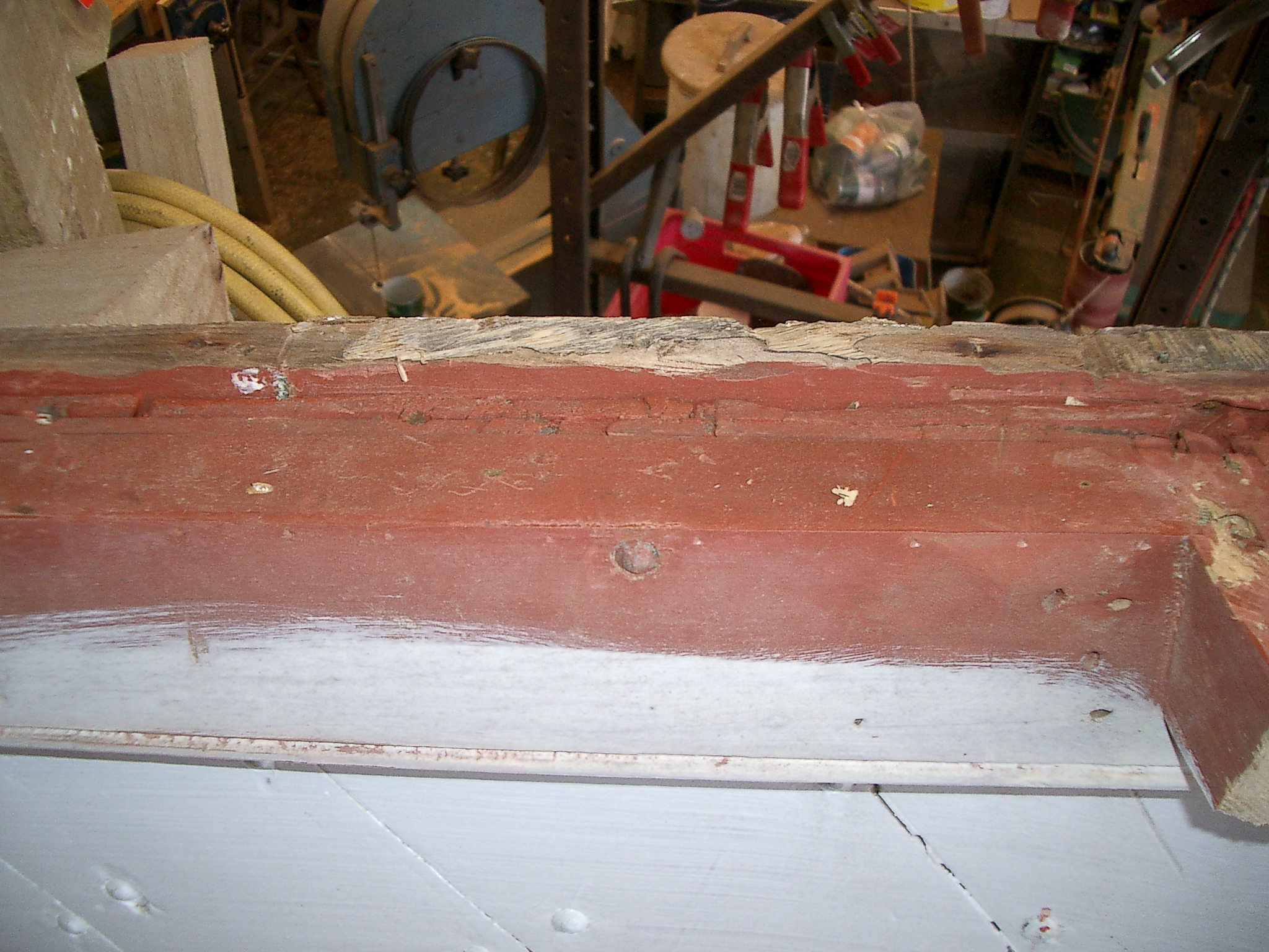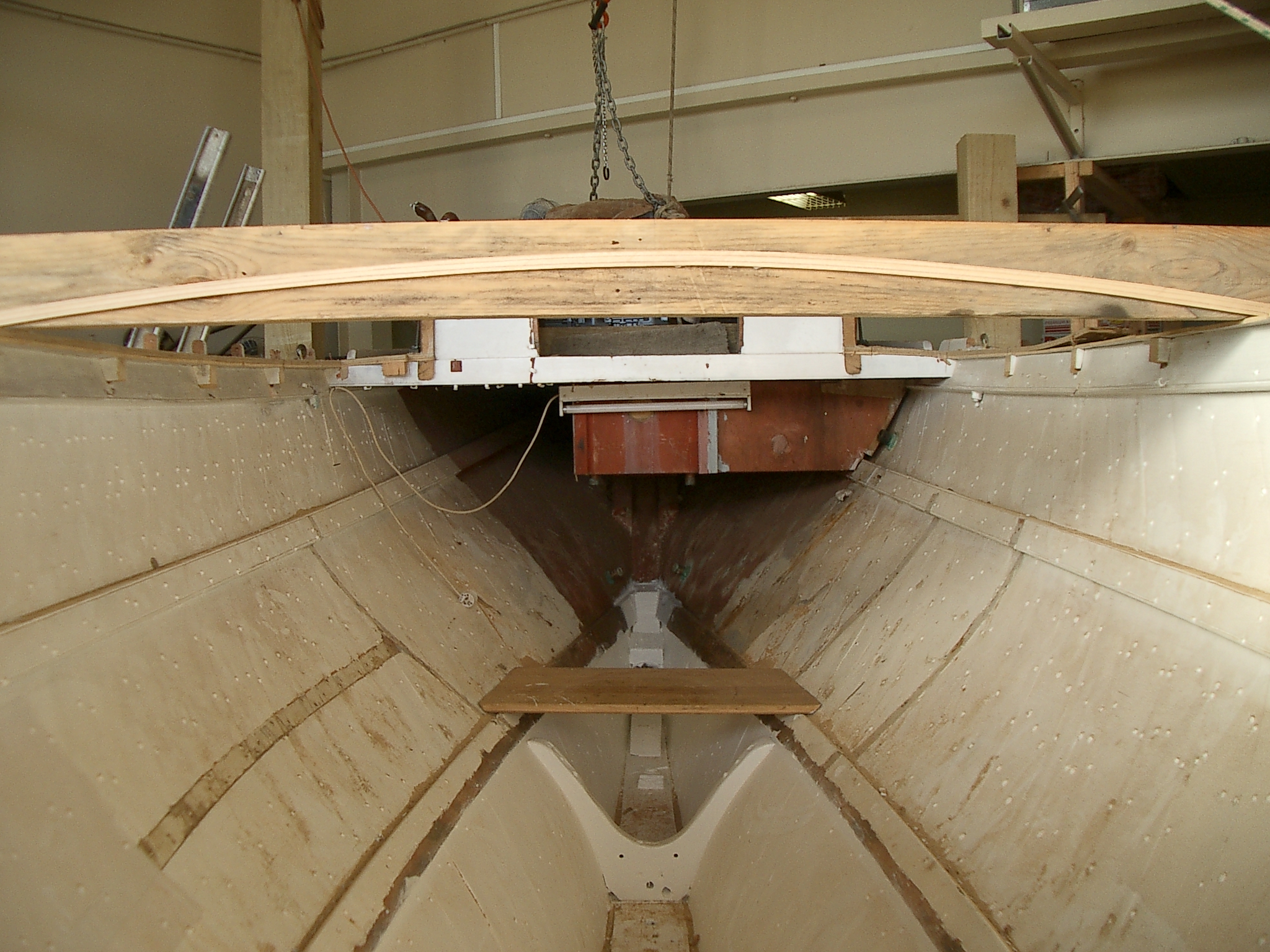 Remove foredeck. Plane plank ends flush with sheer clamp top and remove red lead. Trim back stem top and drifts.