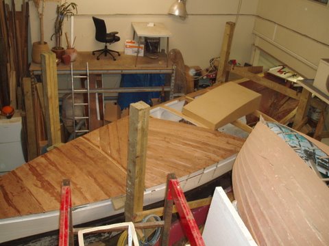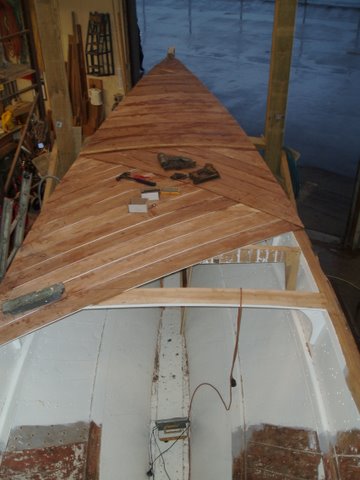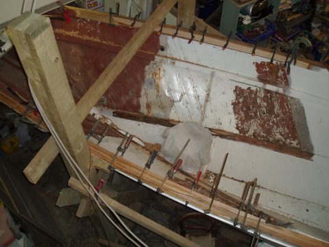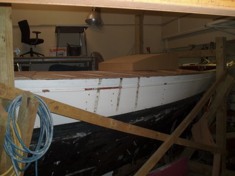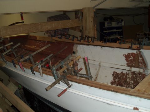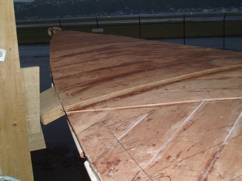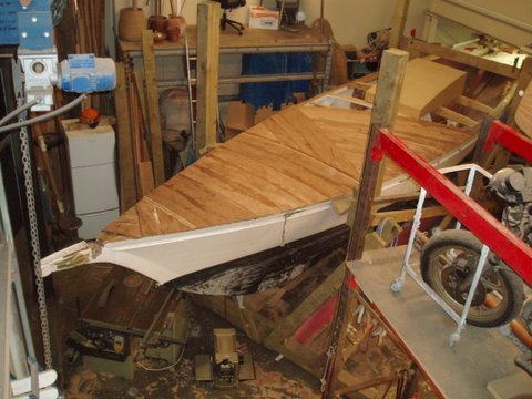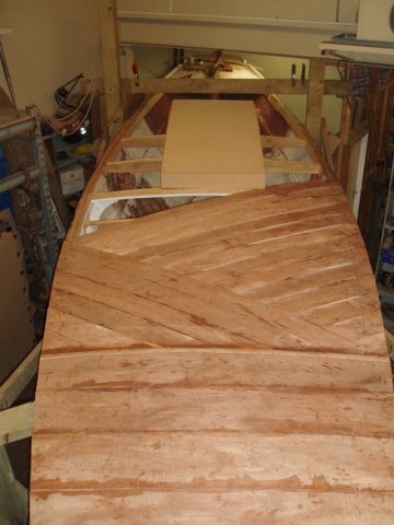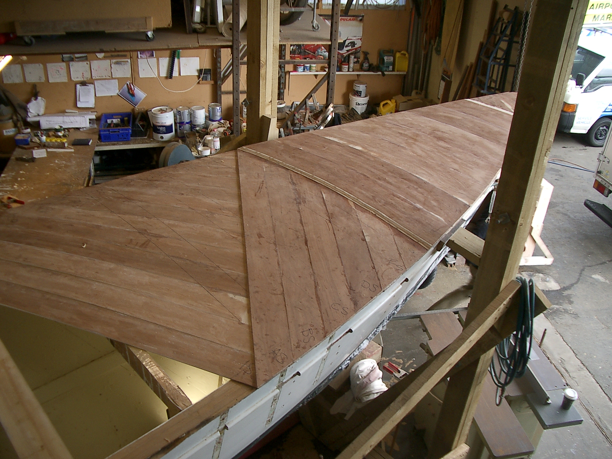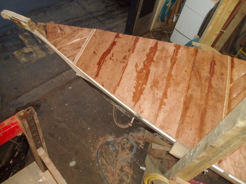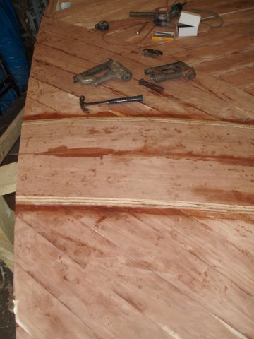 Fit and scarf planking. Glue and staple down. Grind and fair third layer.
