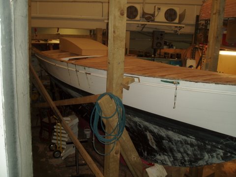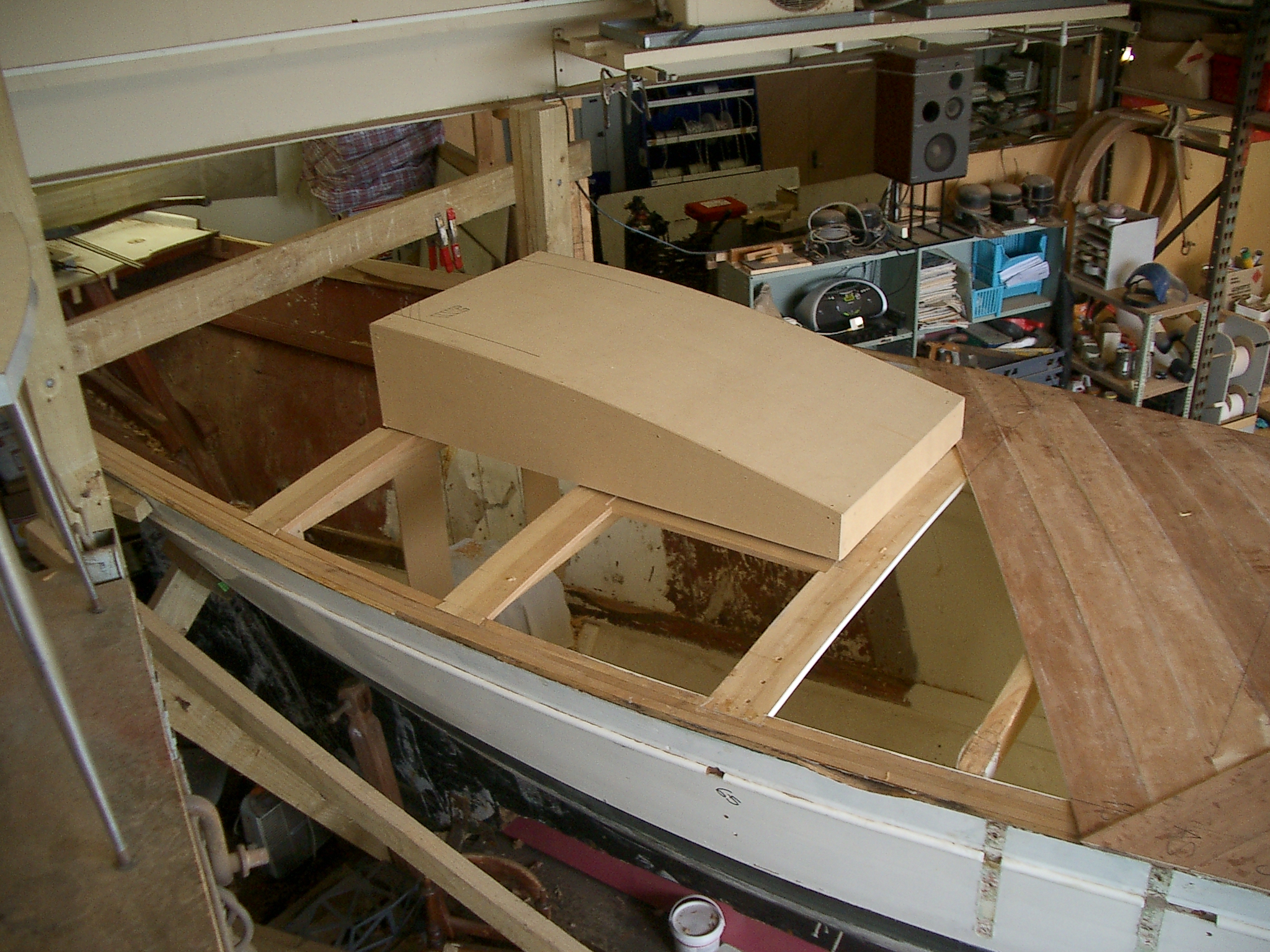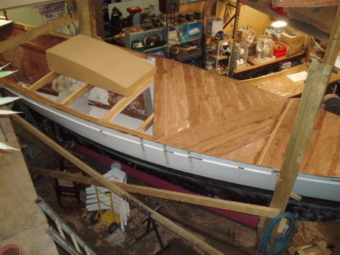 Scrape back clamps. Make, fit and clean up repairs to sheer clamps and diagonal plank ends. Machine and make aft beam shelves and sheer packers. Glue in clamp packers and fair to clamps. Glue on beam shelves. Fair sheer and plane clamp packers and beam shelves to deck camber.Make and fit temporary deck beams and mock up of booby hatch and posts. Check out beam shelves. Cut and fit deck beams to shelves, Make and fit fore and aft deck beams.