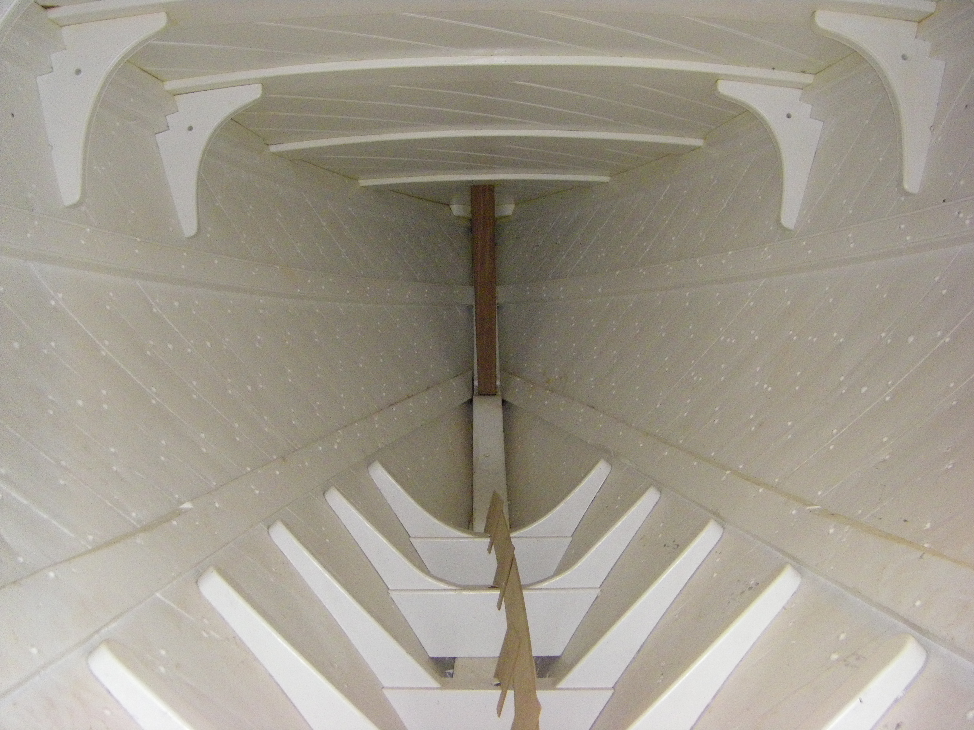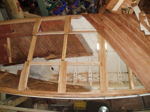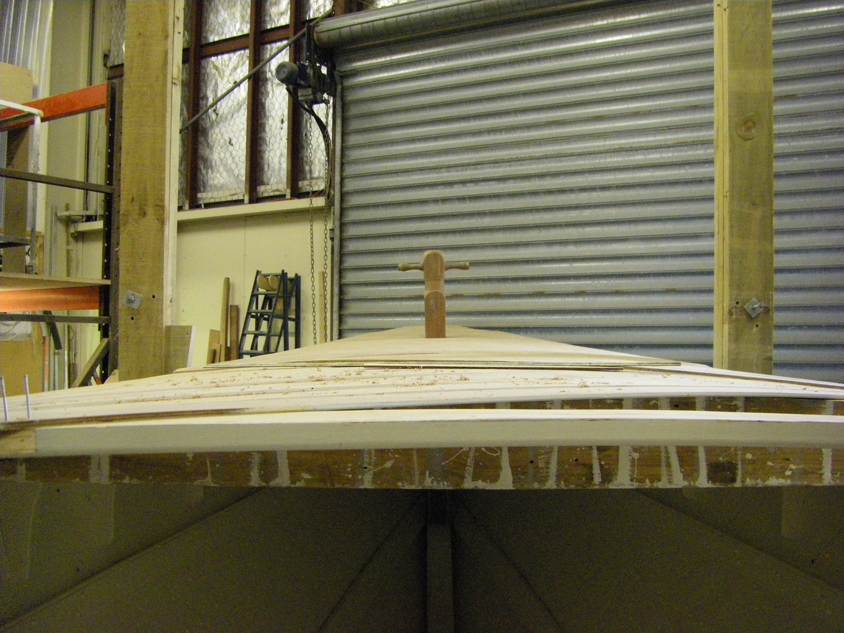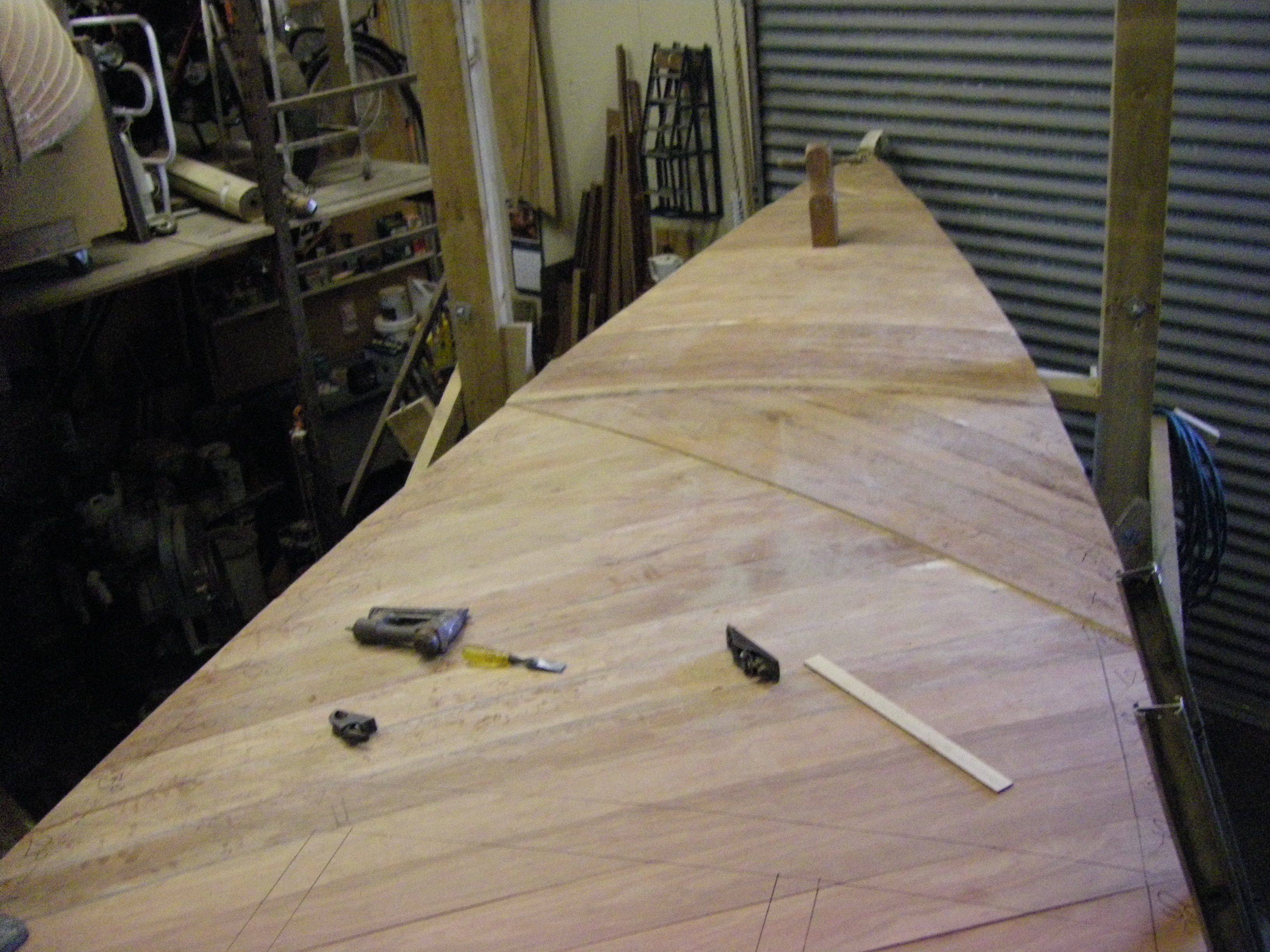 Spile, dry fit, mark, trim and remove first layer. Cut in coves and arrises. Remove small deck beams. Everdure, prime, undercoat, and topcoat all. Sand and re-topcoat. Glue in all small beams. Grind and prepare all decking. Glue in and fair small deckbeams. Glue down first layer decking. Tom as required, spile second layer decking, and glue on. Rip and scarf third layer decking. Begin fairing second layer decking.