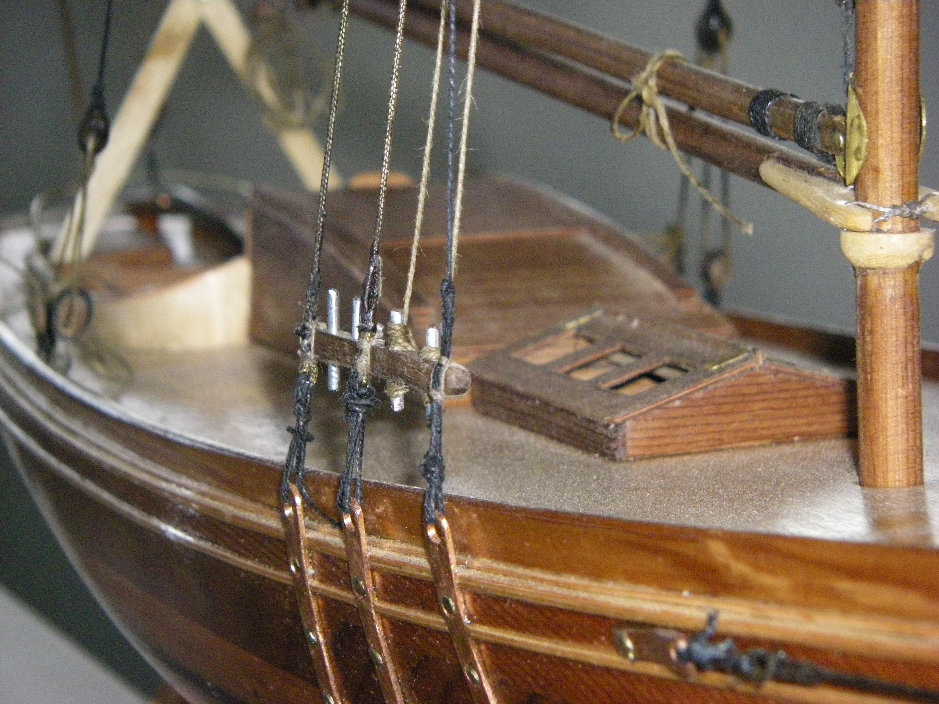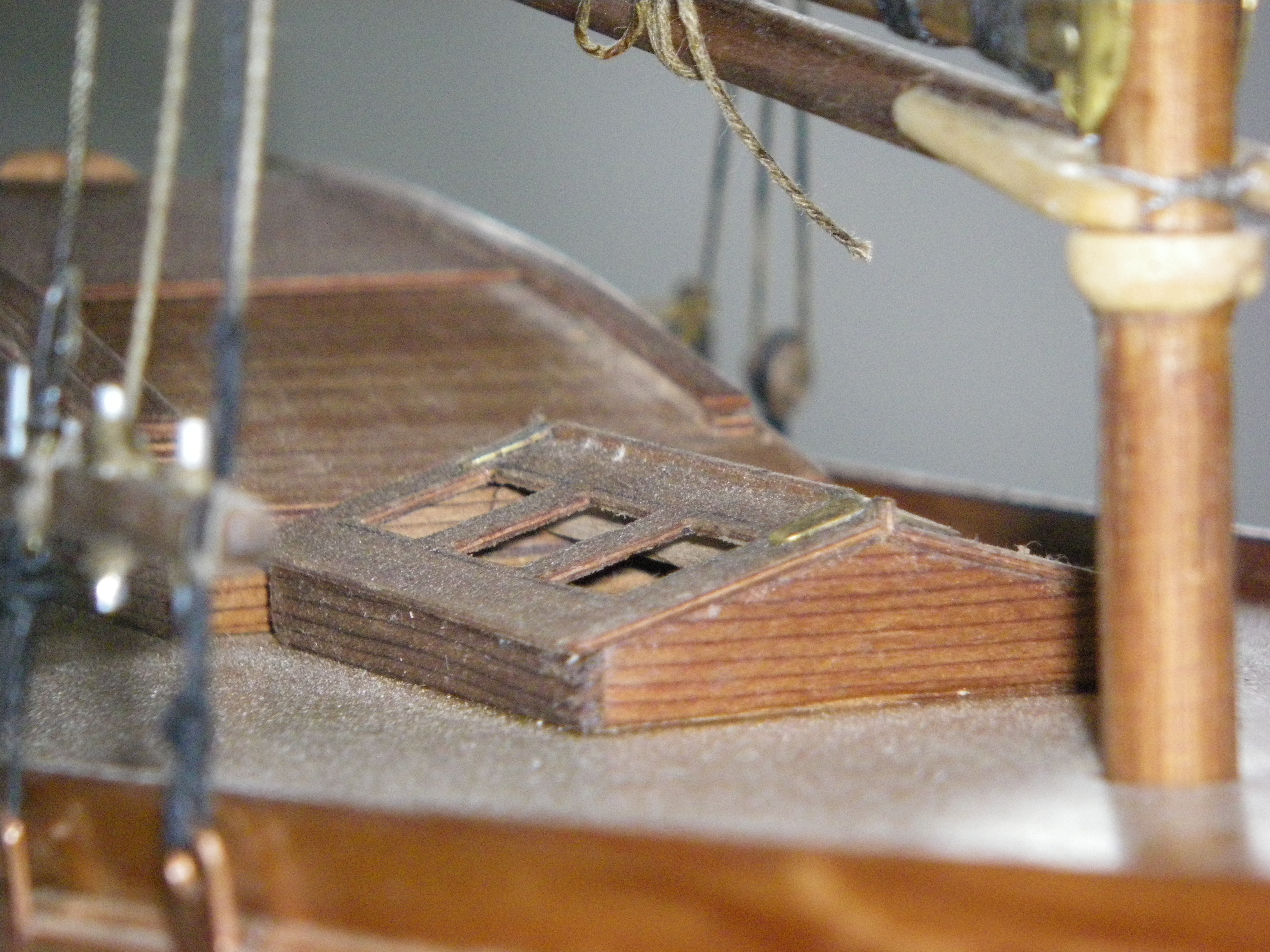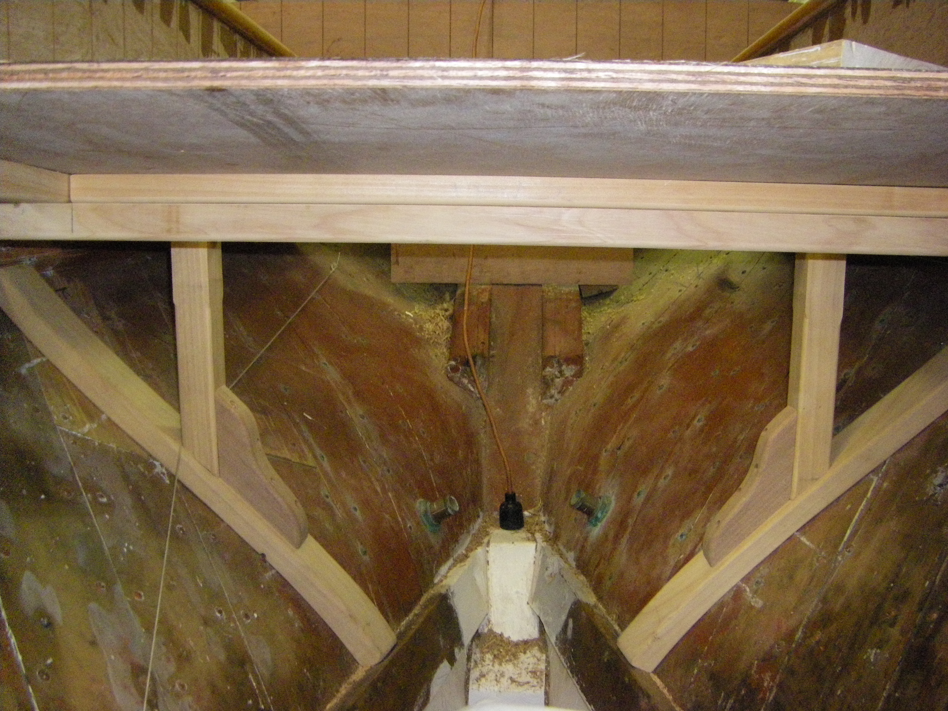 Spile, dry fit, mark, trim and remove first layer. Cut in coves and arrises. Remove small deck beams. Everdure, prime, undercoat, and topcoat all. Sand and re-topcoat. Glue in all small beams. Grind and prepare all decking. Glue in and fair small deckbeams. Glue down first layer decking. Tom as required, spile second layer decking, and glue on. Rip and scarf third layer decking. Begin fairing second layer decking.