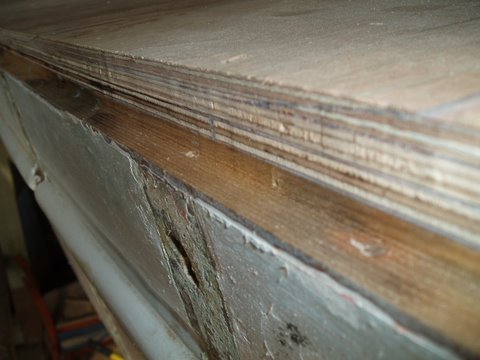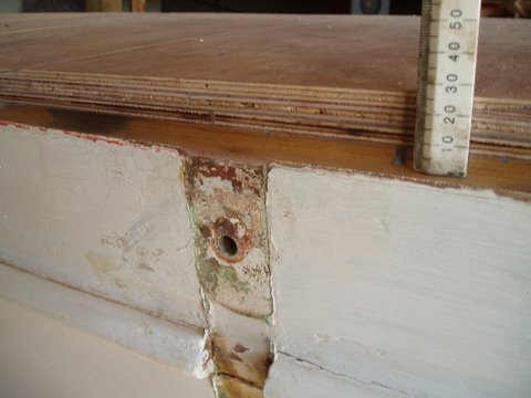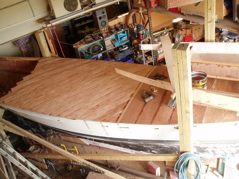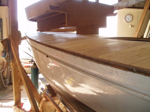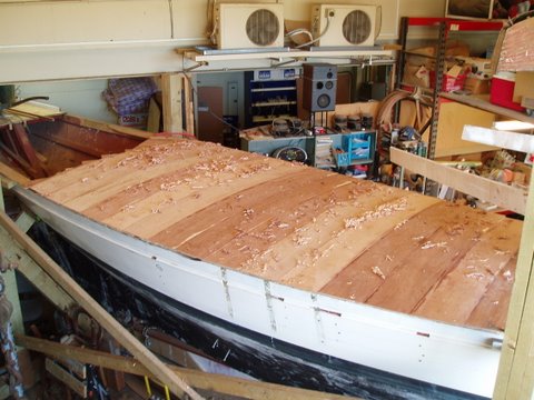 Fair second layer of decking. Fit, trim, and glue on third layer. Plane joins fair. Cut out panel for companionway. Trim deck edge flush and rout in rebate. Repair sheer plank by letting in new timber.Make deck edgings, scarf together and glue to deck edge. Fair back edging. Make and glue in infills behind and alongside billet head. Fair infill with deck, fit and glue on three layers of decking above. Fair and clean up forward decking. Make rebates and edging pieces around billet head. Glue in. Radius all edgings and sampson post hole. Fill all staple holes. Glass down hole. Shape billet head edgings. Fibreglass deck. Trim fibreglass from gunwale edges and scrape all joins.