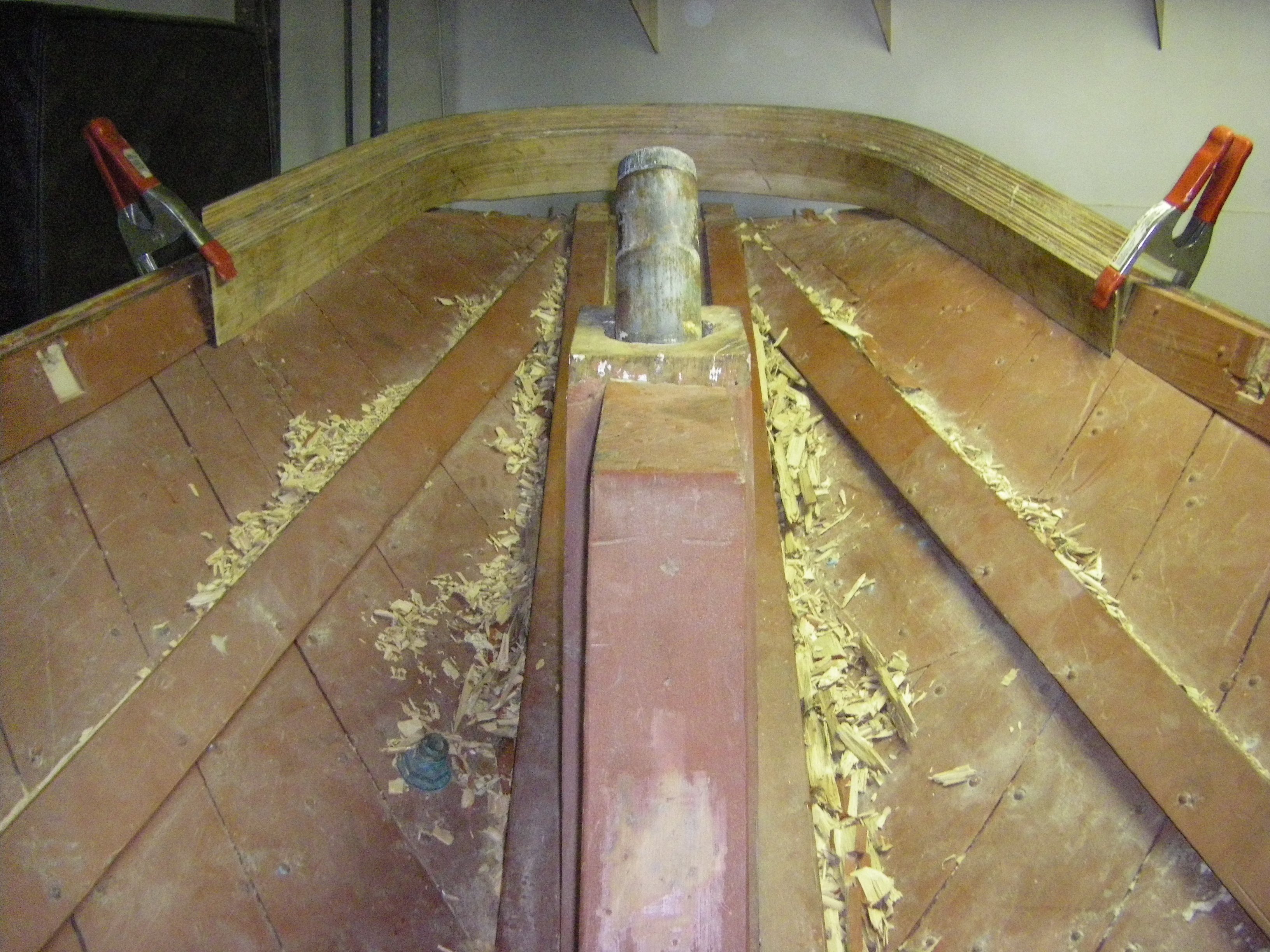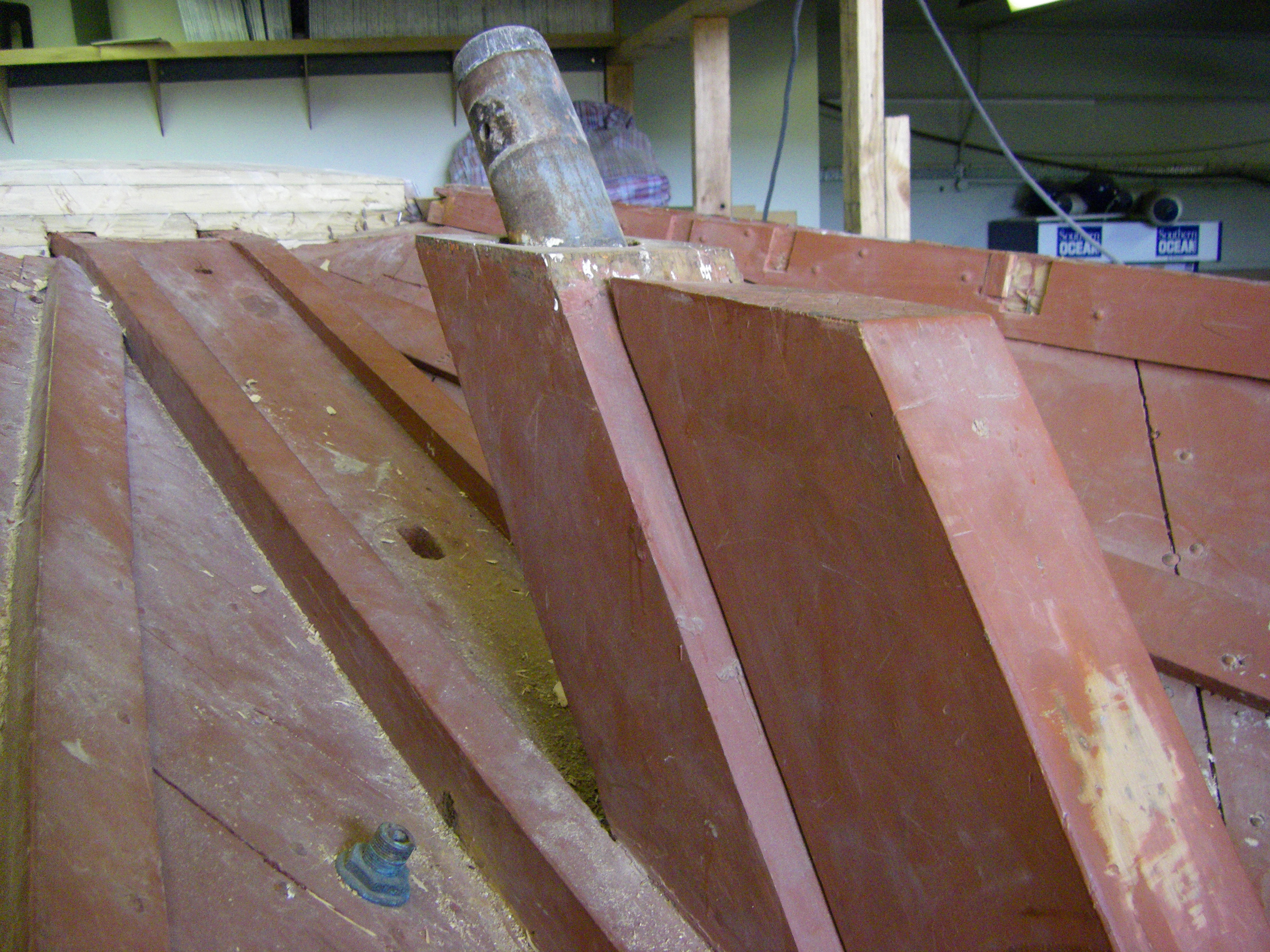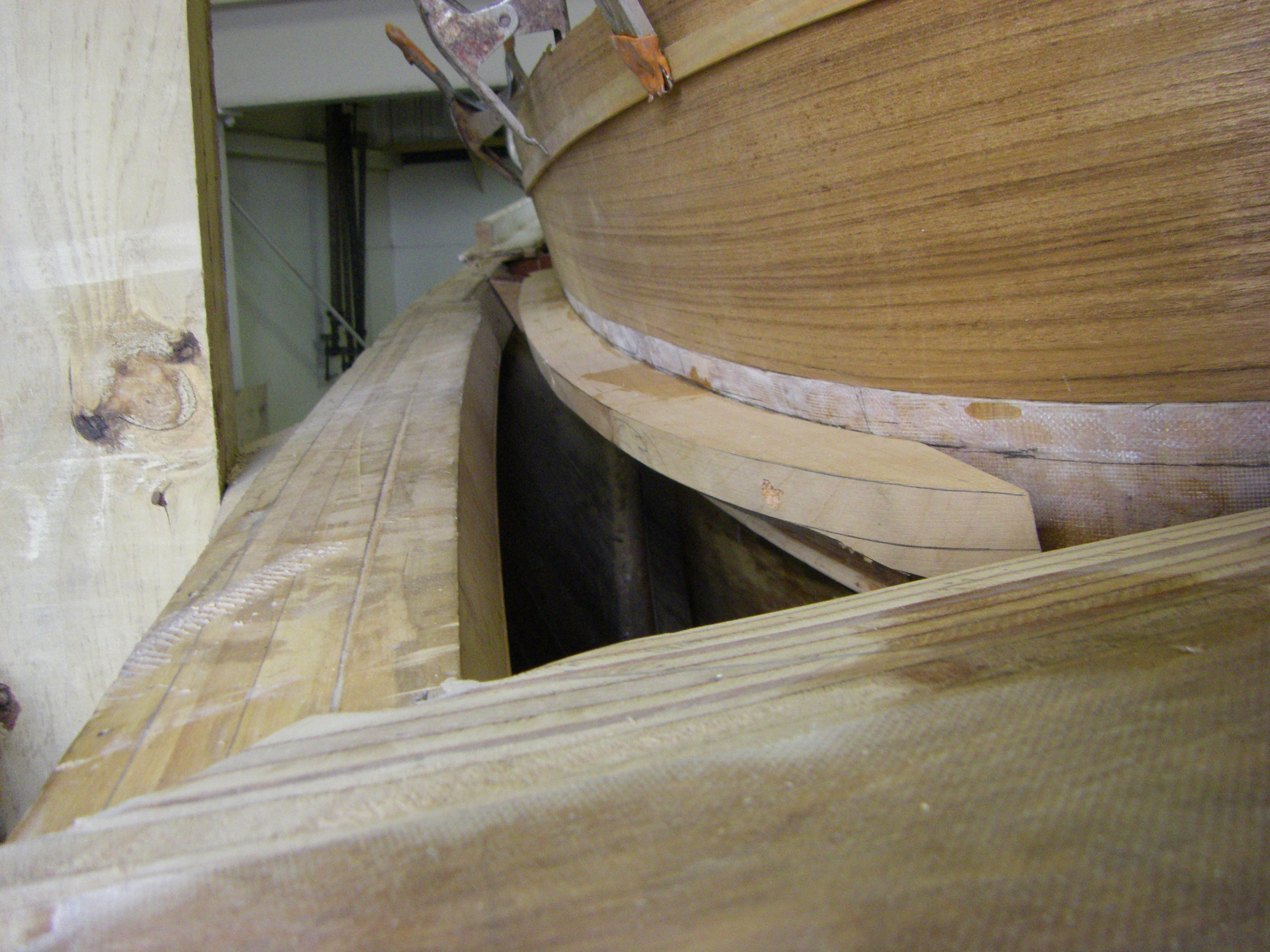 Remove cockpit. Fit and glue on sidedeck cleats. Remove aft deck and transom blocking. Make support cradle for aft planking. Make aft deck beams. Make templates and jog for transom hoop. Machine, laminate, clean up and fit transom hoop. Cut back and scarf sheer clamps. Cut back and scarf damaged inner planking. Make and fit plan repairs.