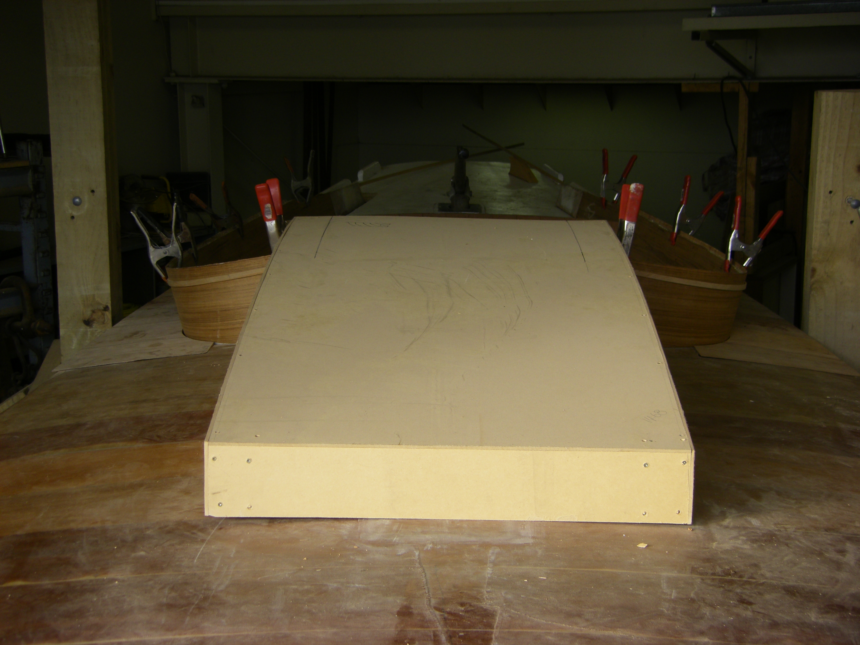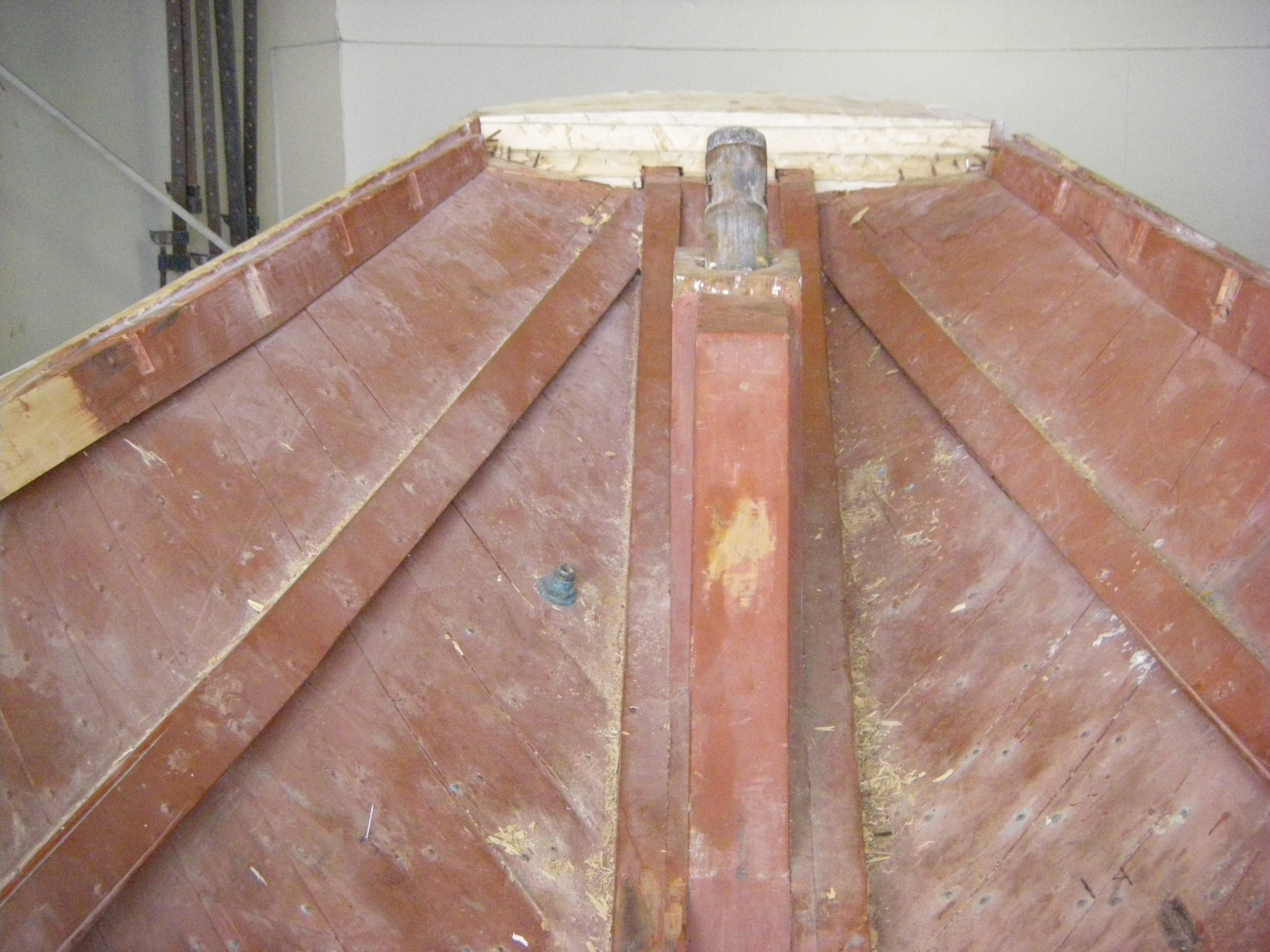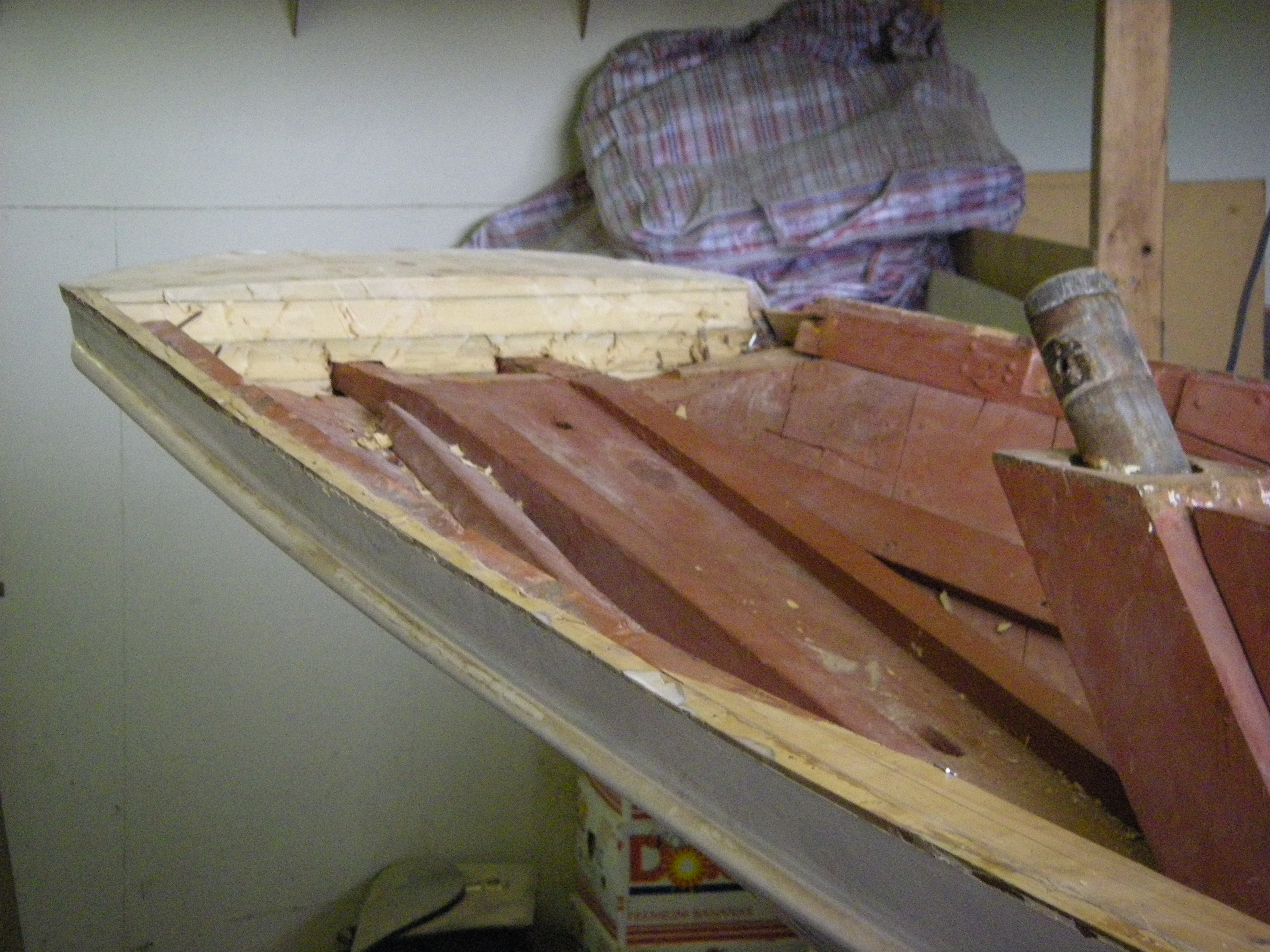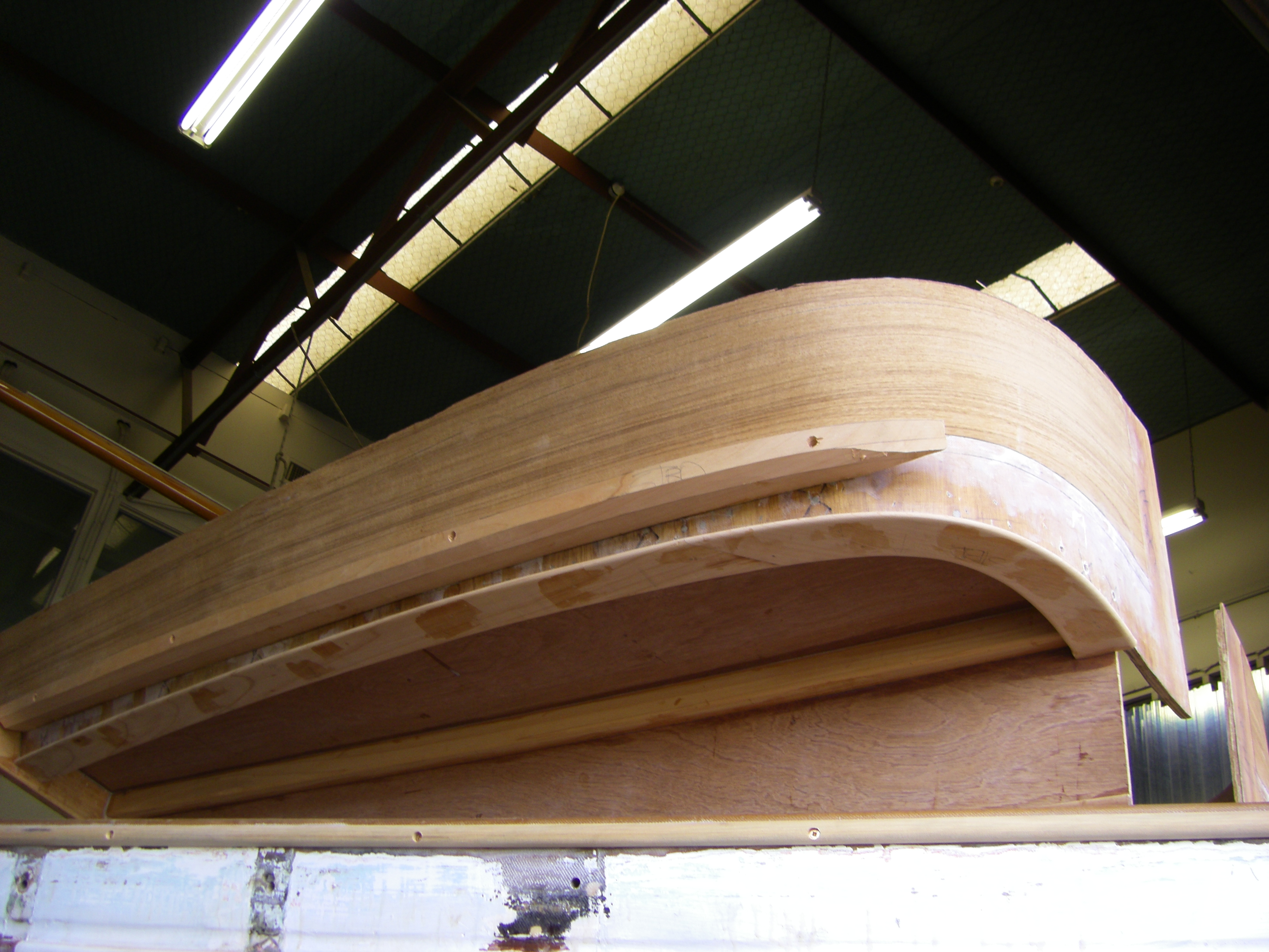 Remove cockpit. Fit and glue on sidedeck cleats. Remove aft deck and transom blocking. Make support cradle for aft planking. Make aft deck beams. Make templates and jog for transom hoop. Machine, laminate, clean up and fit transom hoop. Cut back and scarf sheer clamps. Cut back and scarf damaged inner planking. Make and fit plan repairs.