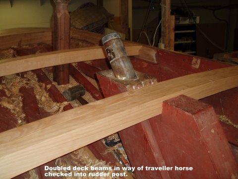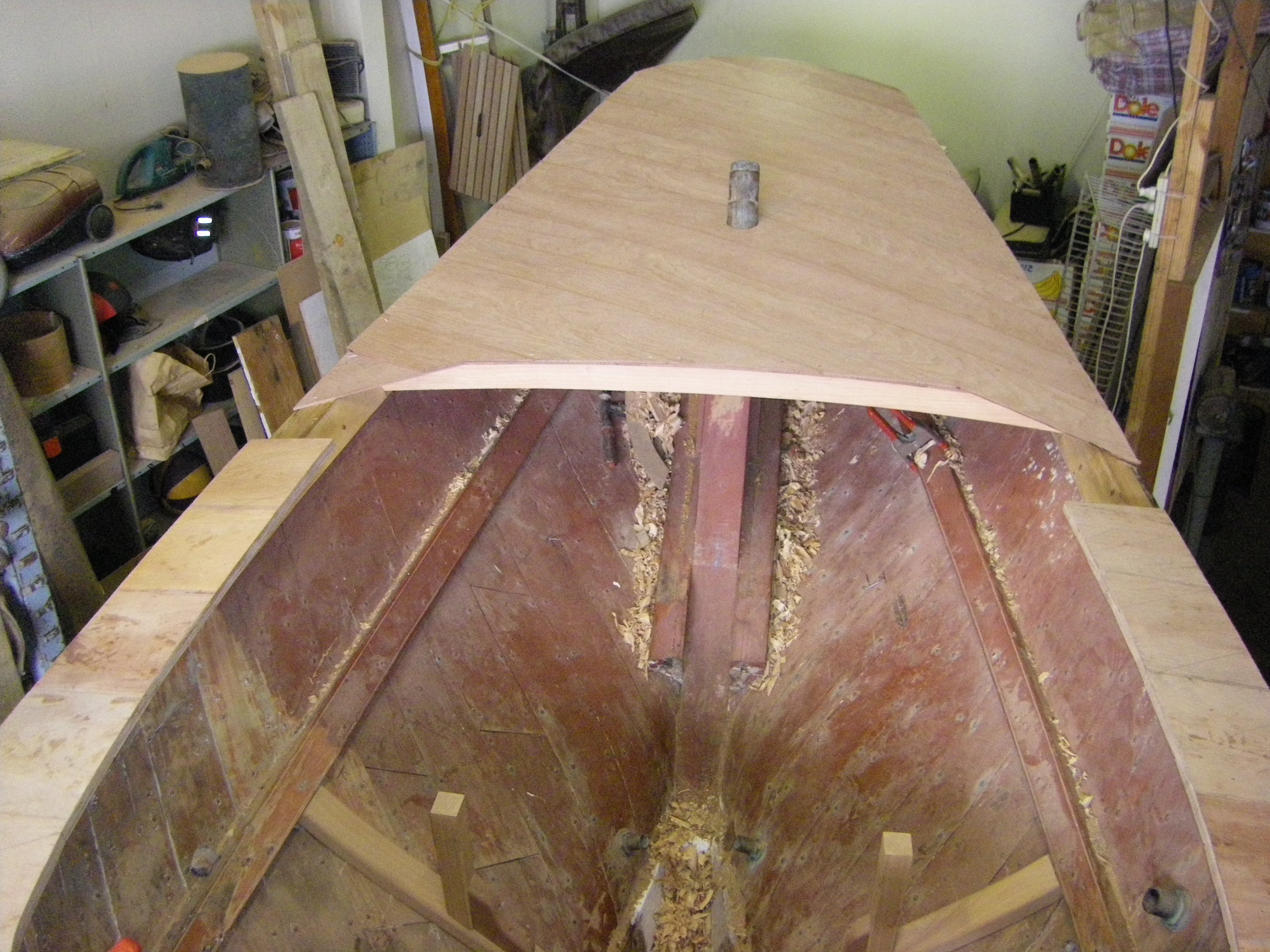 Rip, fit, mark out, and remove two layers of deck ply. Make and cut mortise and tenon on aft samson post. Fit to horn. Check post into deck beam. Make and glue in blocking and patches to sheer clamp, transom hoop, and horn. Repair inner hull planking. Everdure new timber.