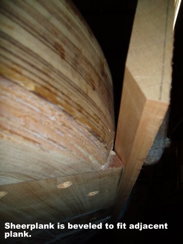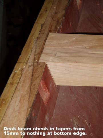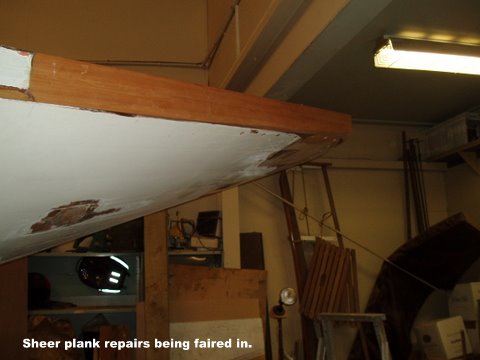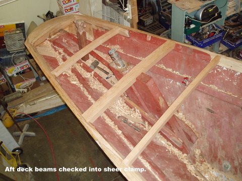 Clean up and fair inner planking edgings and refine second plank bevels. Cut scarfs into existing and new top planking. Cut bottom bevels and fit to hull. Trim corner blocking and fit and glue in blocking for bottom of sharp corners. Shape transom and fair into top planks. Cut back planking for hull repair. Fit and glue on sheer clamp packers. Fair sheer and plane on camber. Fair deck beams and check into sheer clamp and rudder post.