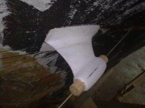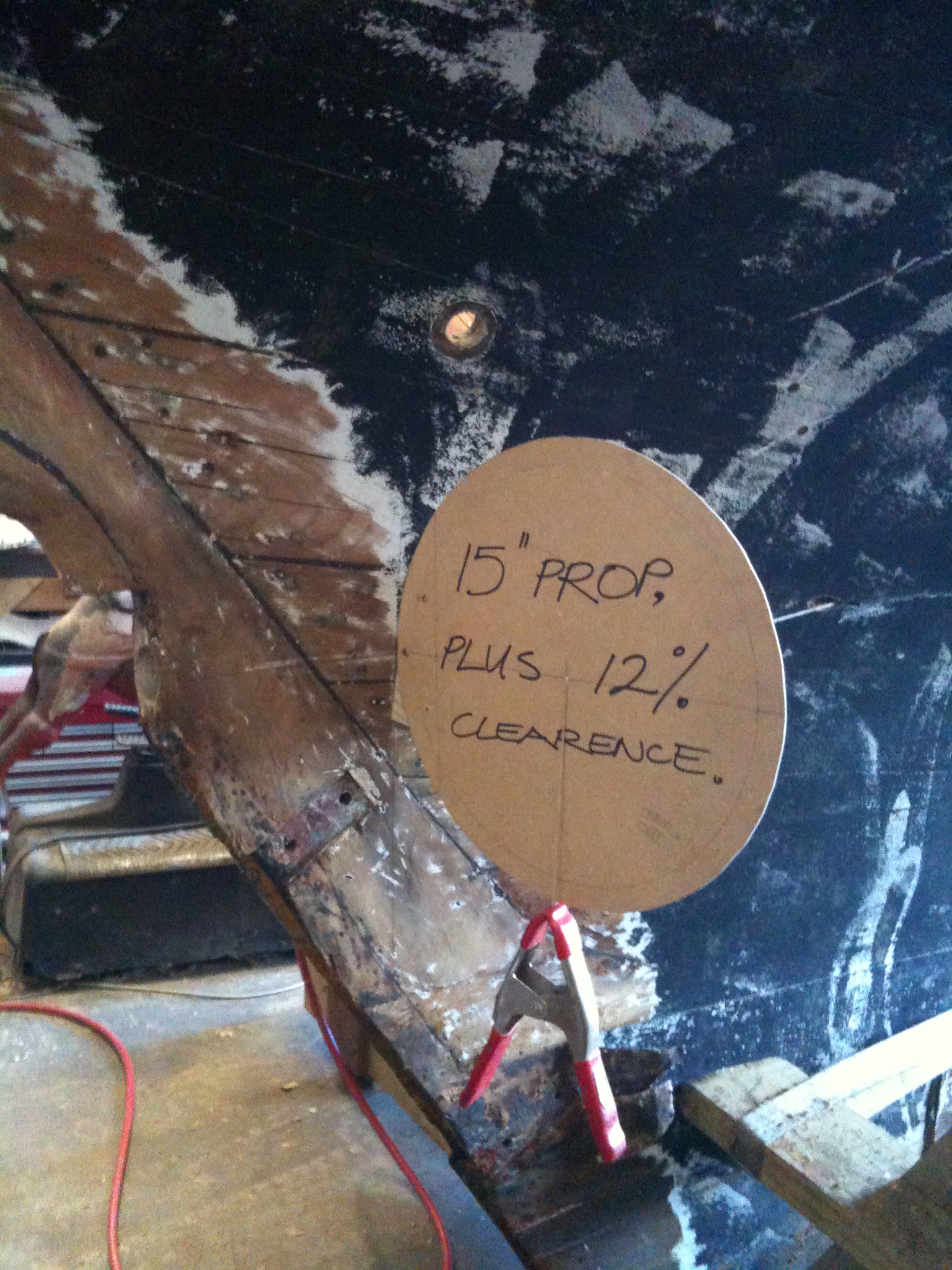 Lift engine, remove mounts, and cut clearance into engine beds. Measure offsets. Make jigs and bore pilot hole for prop shaft through hull. Mock up engine/shaft propellor arrangement.
