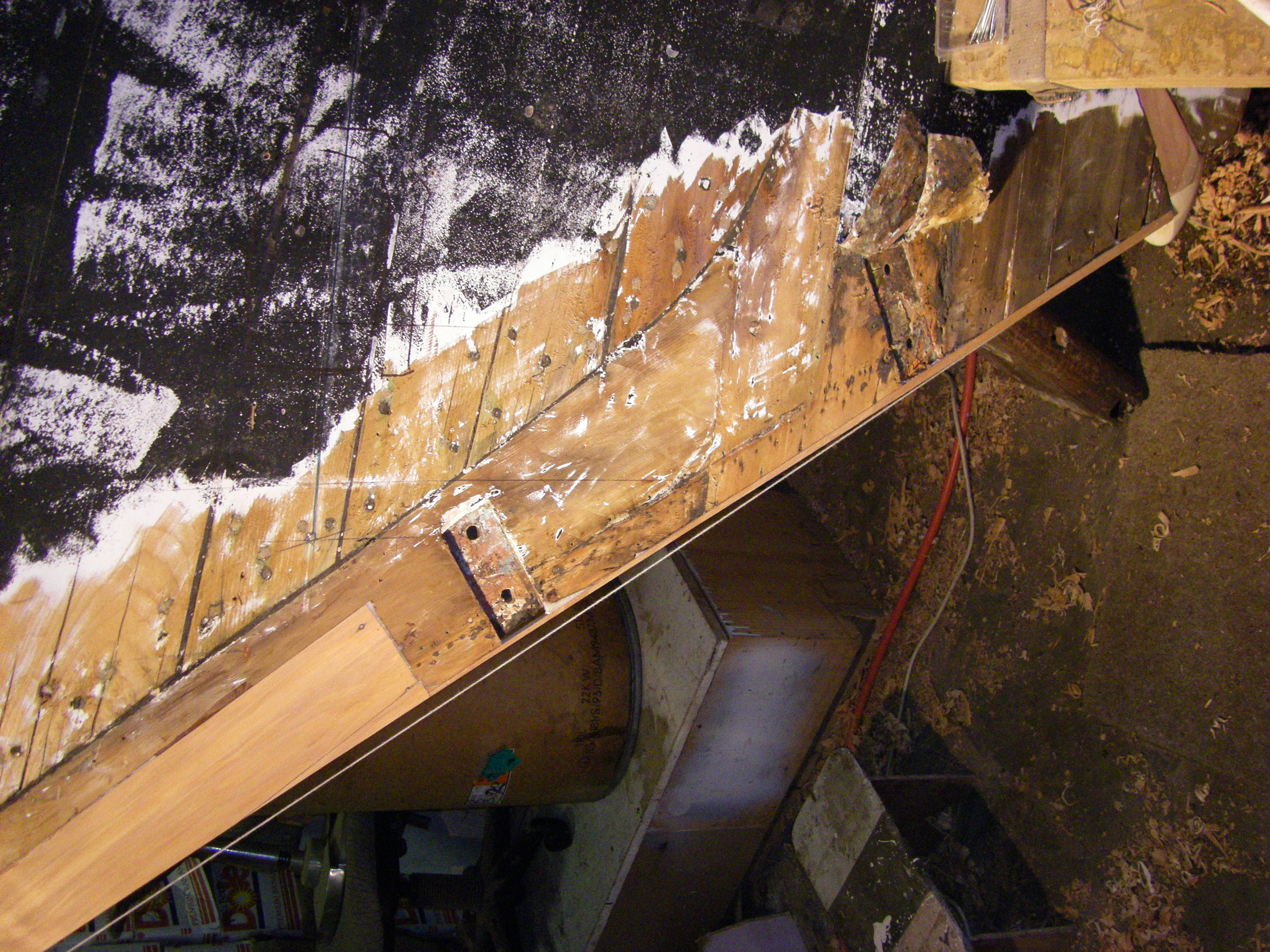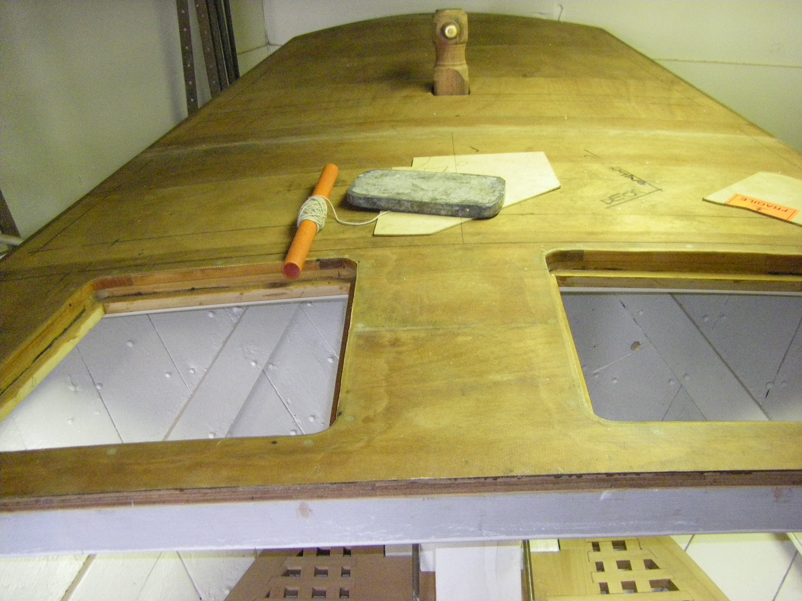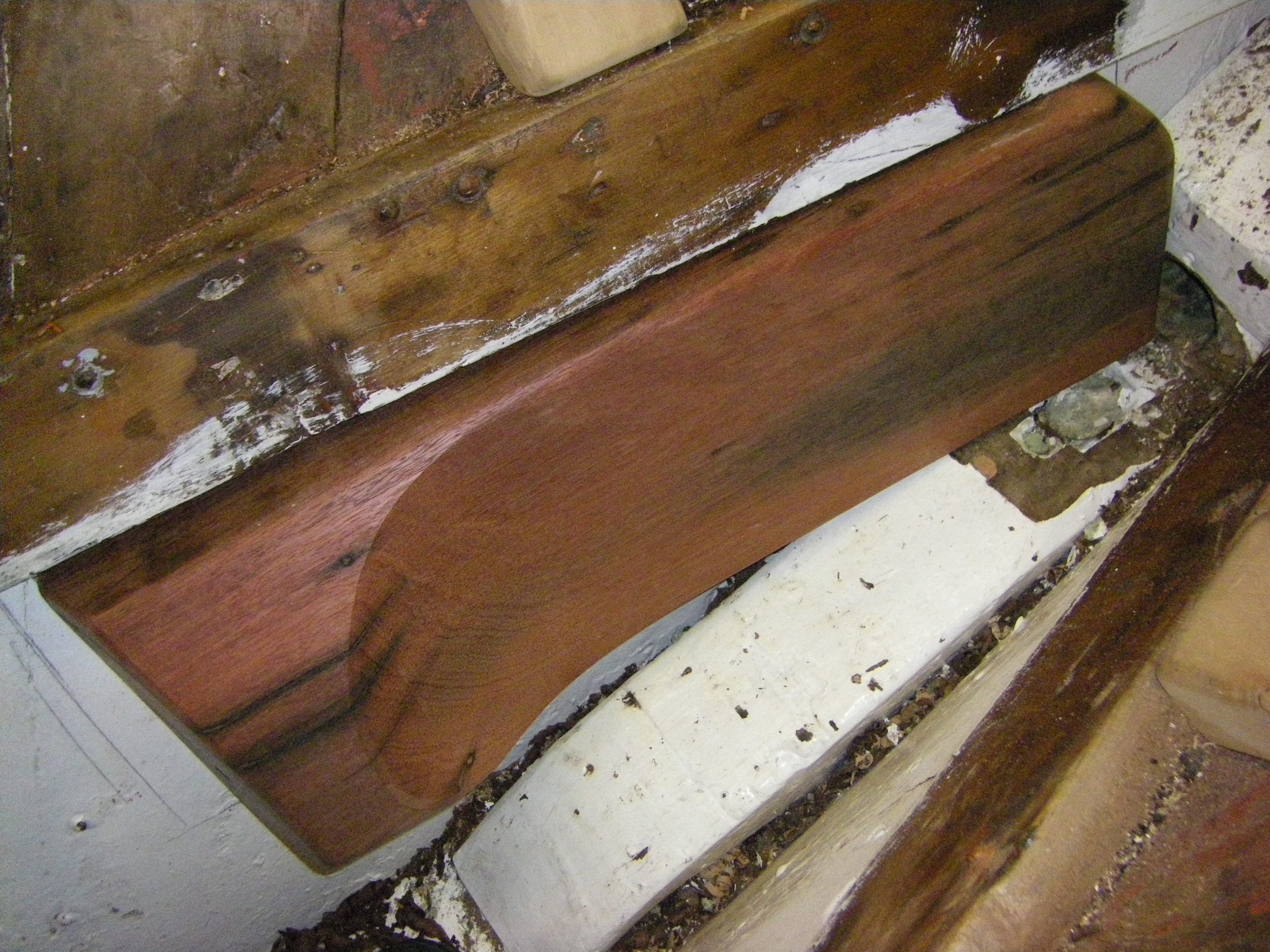Mark out and mock up new rudder and rudder stock. Make rudderstock cap casting pattern. Straighten, drill for, and mount mainsheet traveller hoop. Turn infill for old stern tube hole. Prepare hole and glue in. Clean up old shaftlog end, make cap, and glue on aft new shaftlog to cap. Fibreglass and bed shaftlog on grott. Temporarily attach shaftlog. Prepare boring bar and cutter. Make cutlass bearing for boring bar. Bore hull and shaftlog for stern tube. Remove shaftlog and varnish on same timber for maststep.