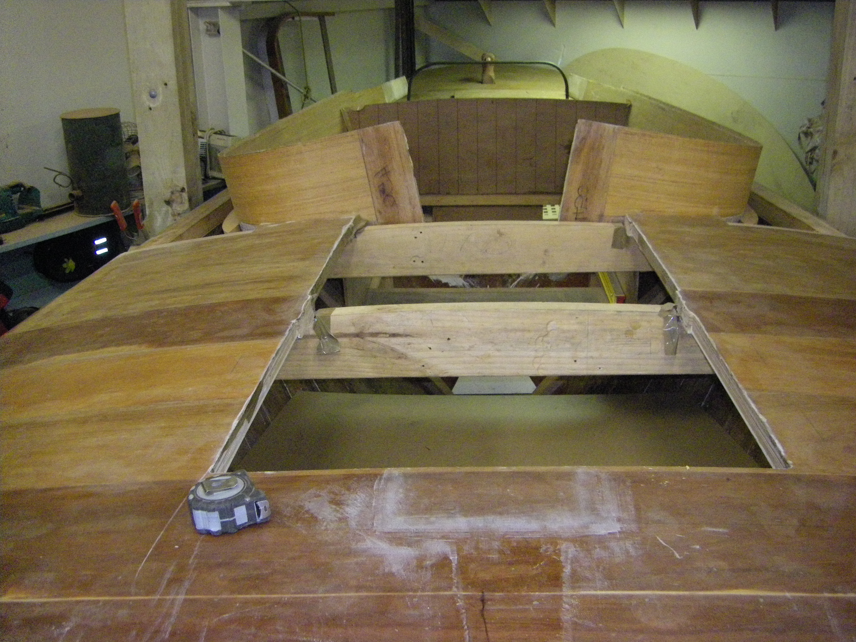 Refine seat templates. Fit seat blanks to hull and stringers. Machine and shape seats. Fit and glue on ends. Reinforce edges with fibreglass. Clean up shaping and ends.