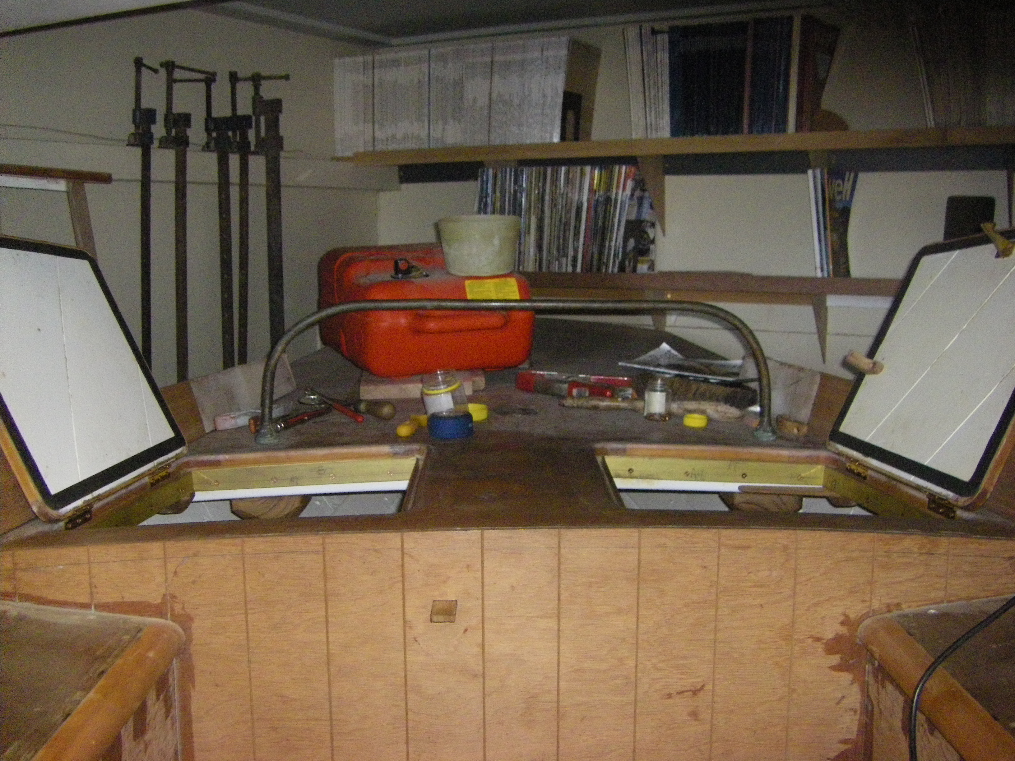 Make under cockpit doublers for support posts and fit mock up panels to posts. Drill and screw on cockpit transom support blocks. Make and fit cleats, upstands and location pins for lazarette gratings. Make and fit blocking to locate bottom of cockpit transom. Centre lazarette lids in their apertures. Make and fit gutterings. Rebate in sealing subbers. Make and fit lid hold down/spring up arrangements.