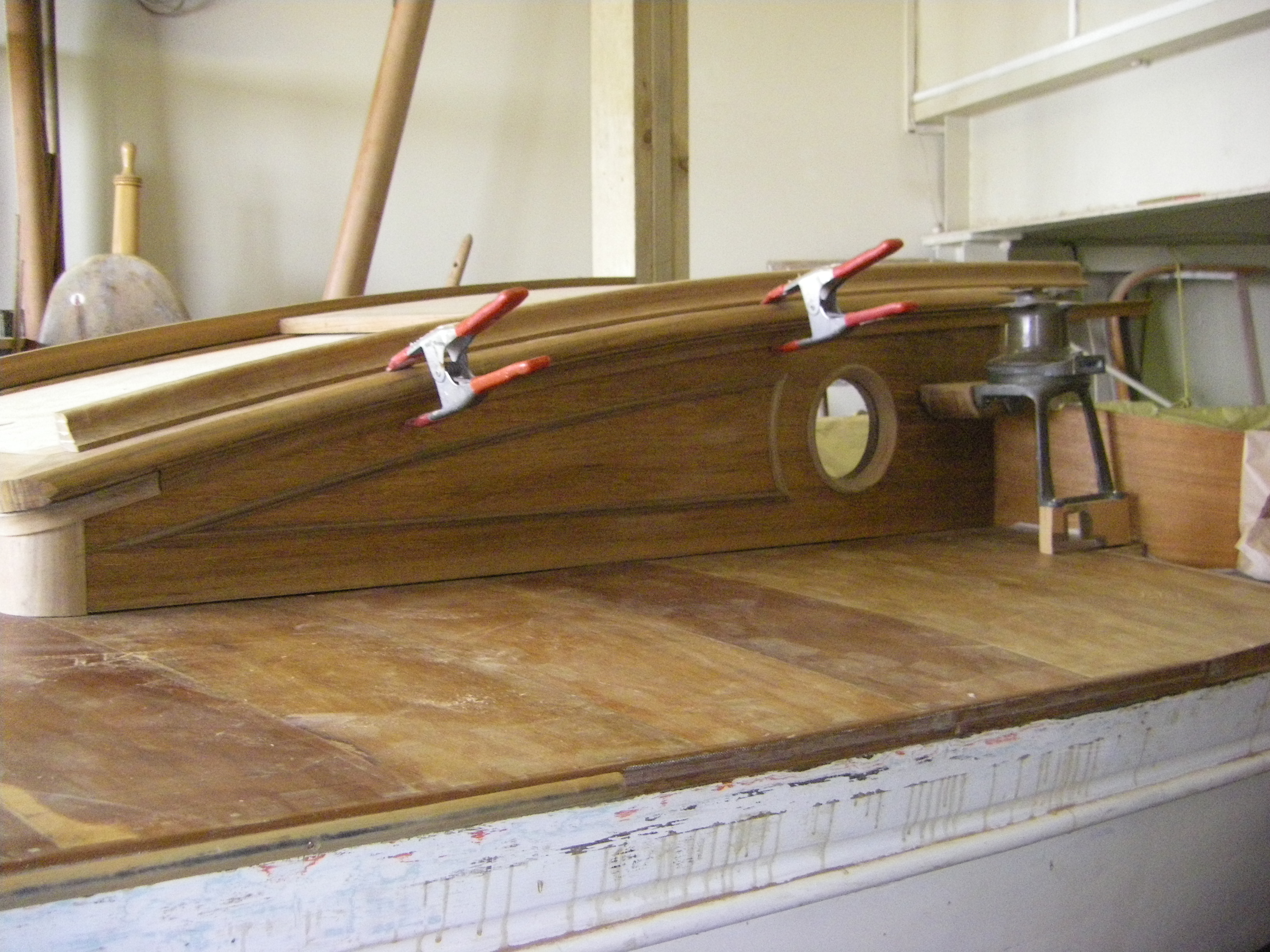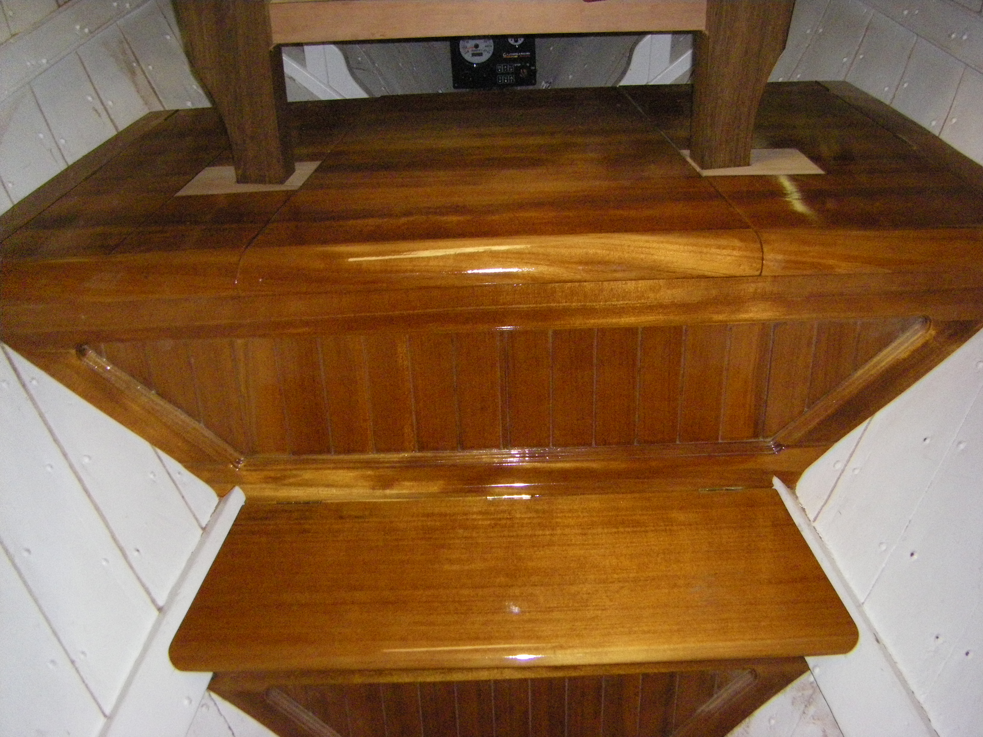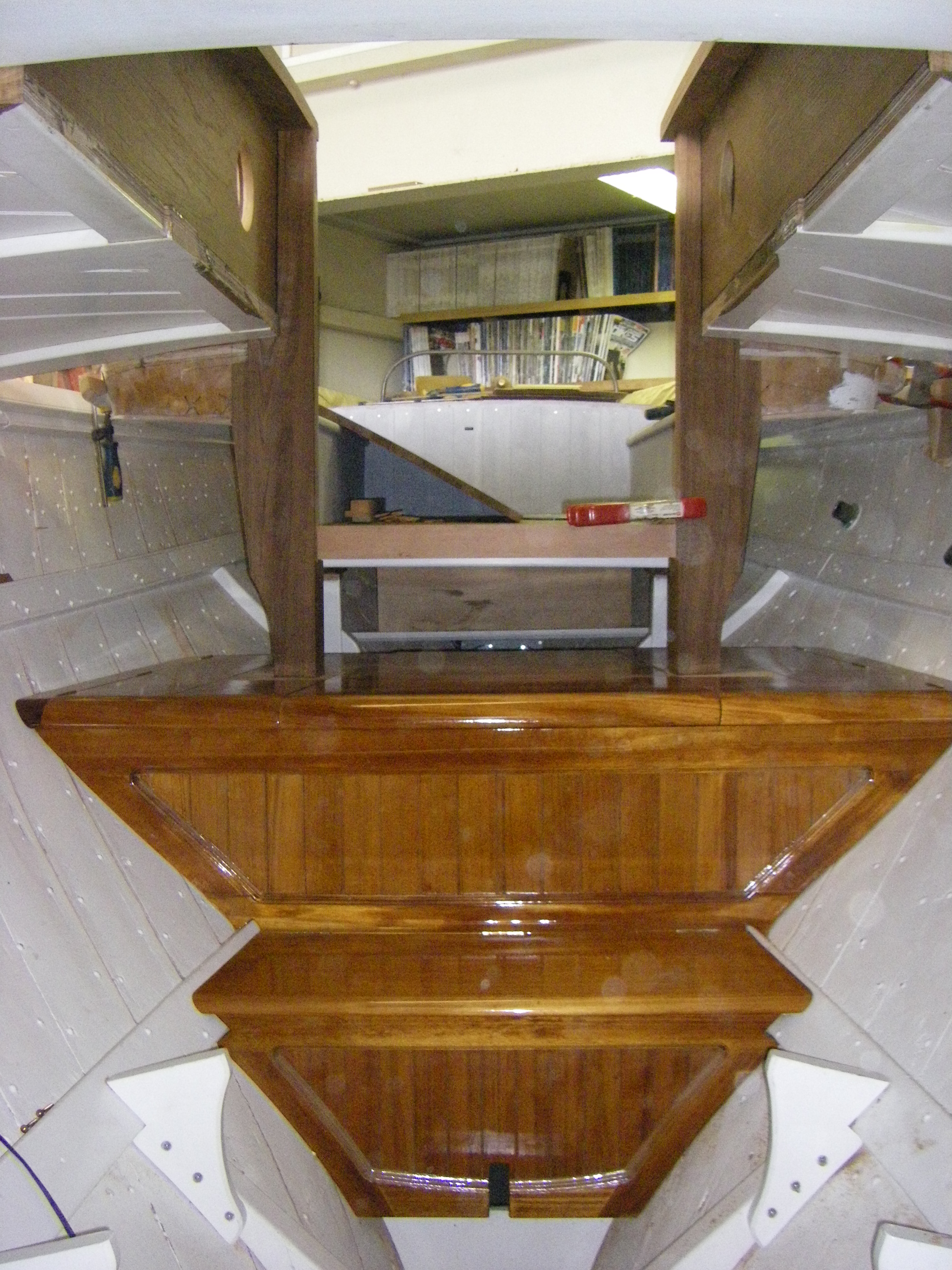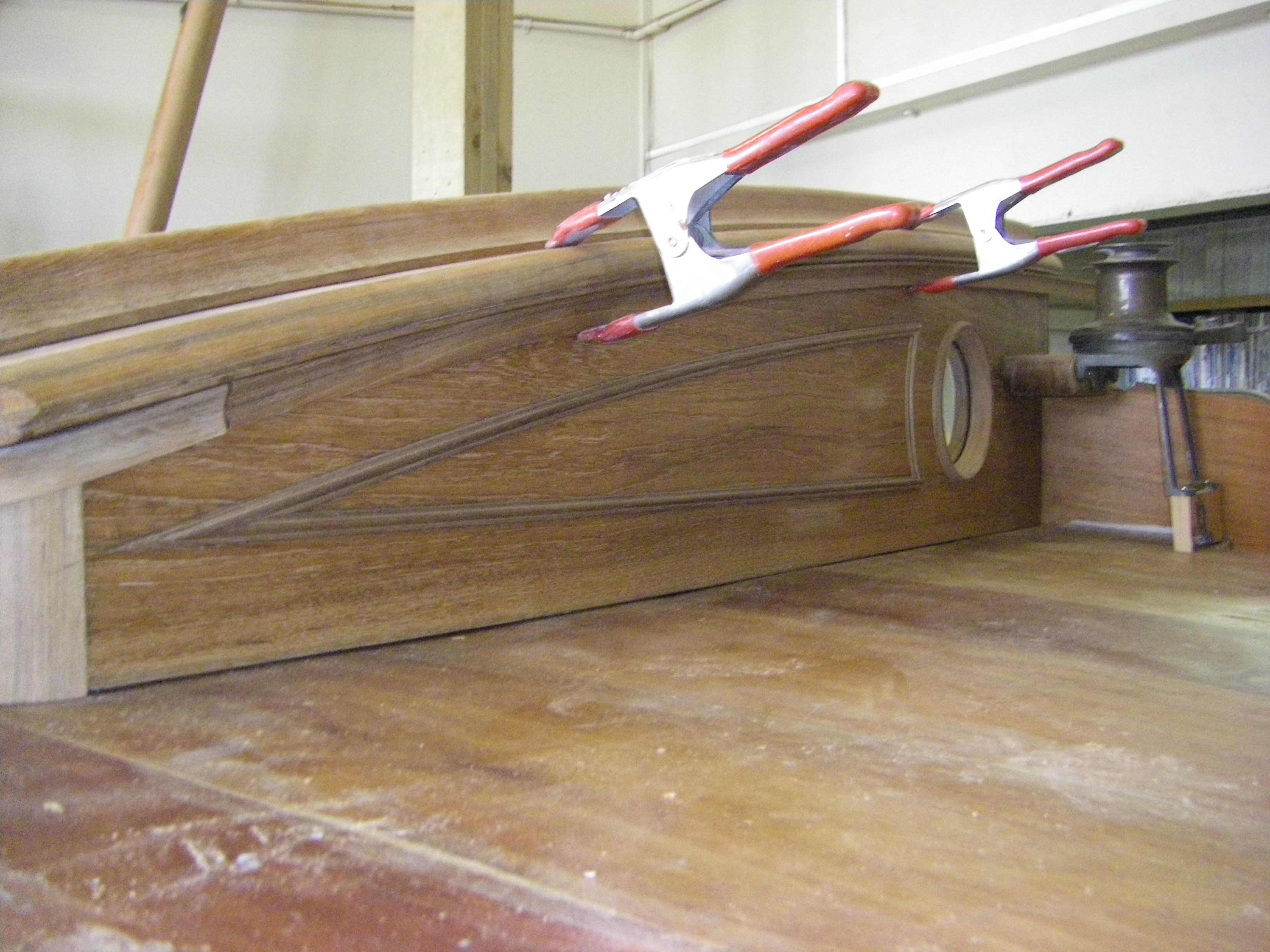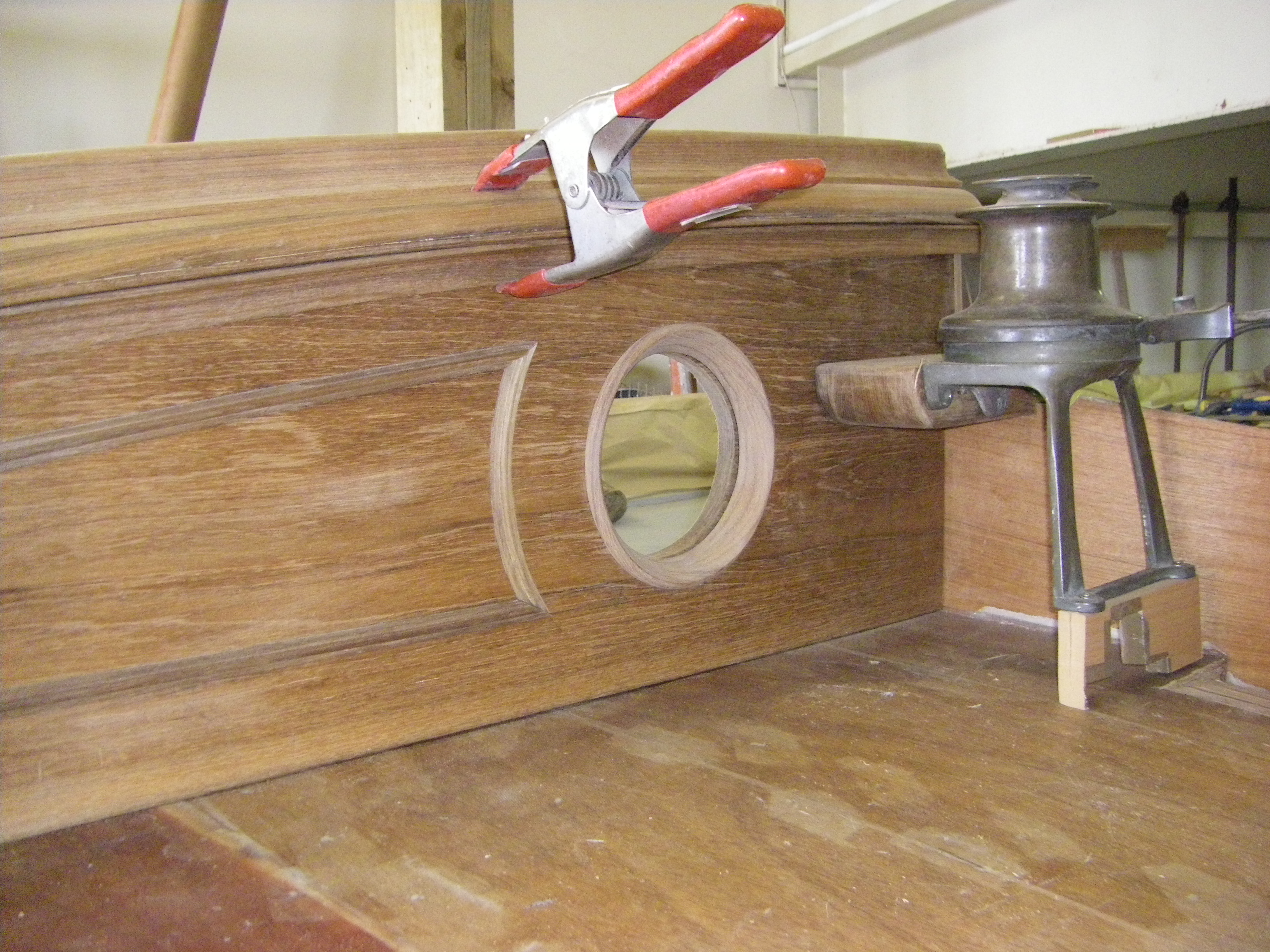 Machine timber for, and laminate on teak veneer to hatch top panel. Make and fit handle to hatch slide. Glue in and finish mouldings to hatch sides. Sand and scrape both sides of hatch top, front and sides. Make and fit forward corner internal pieces. Make and fit sill to companionway. Carve beadings around inside face of portlights.