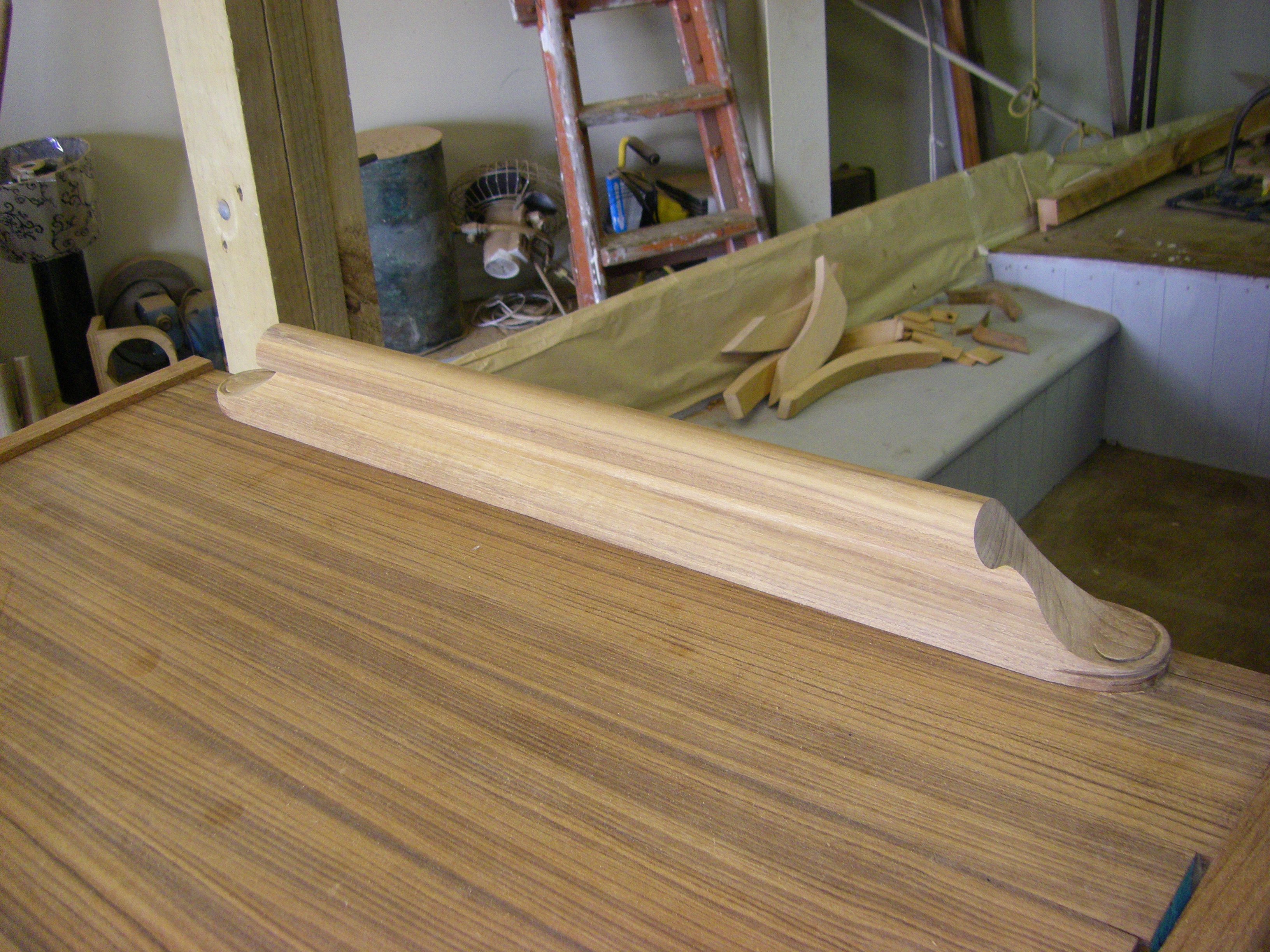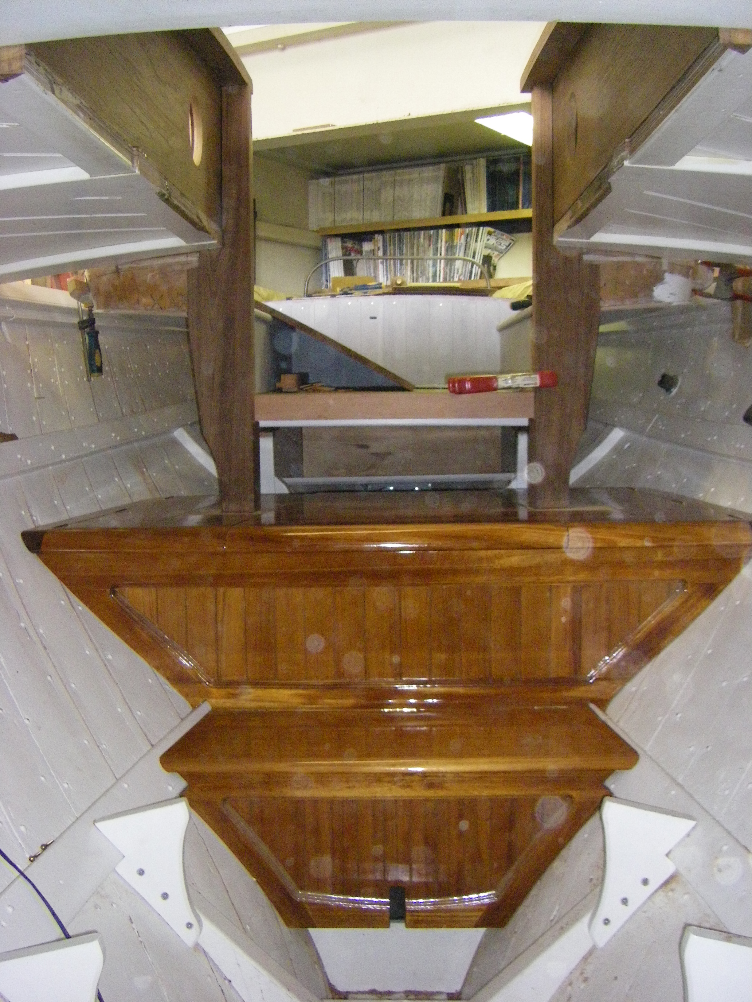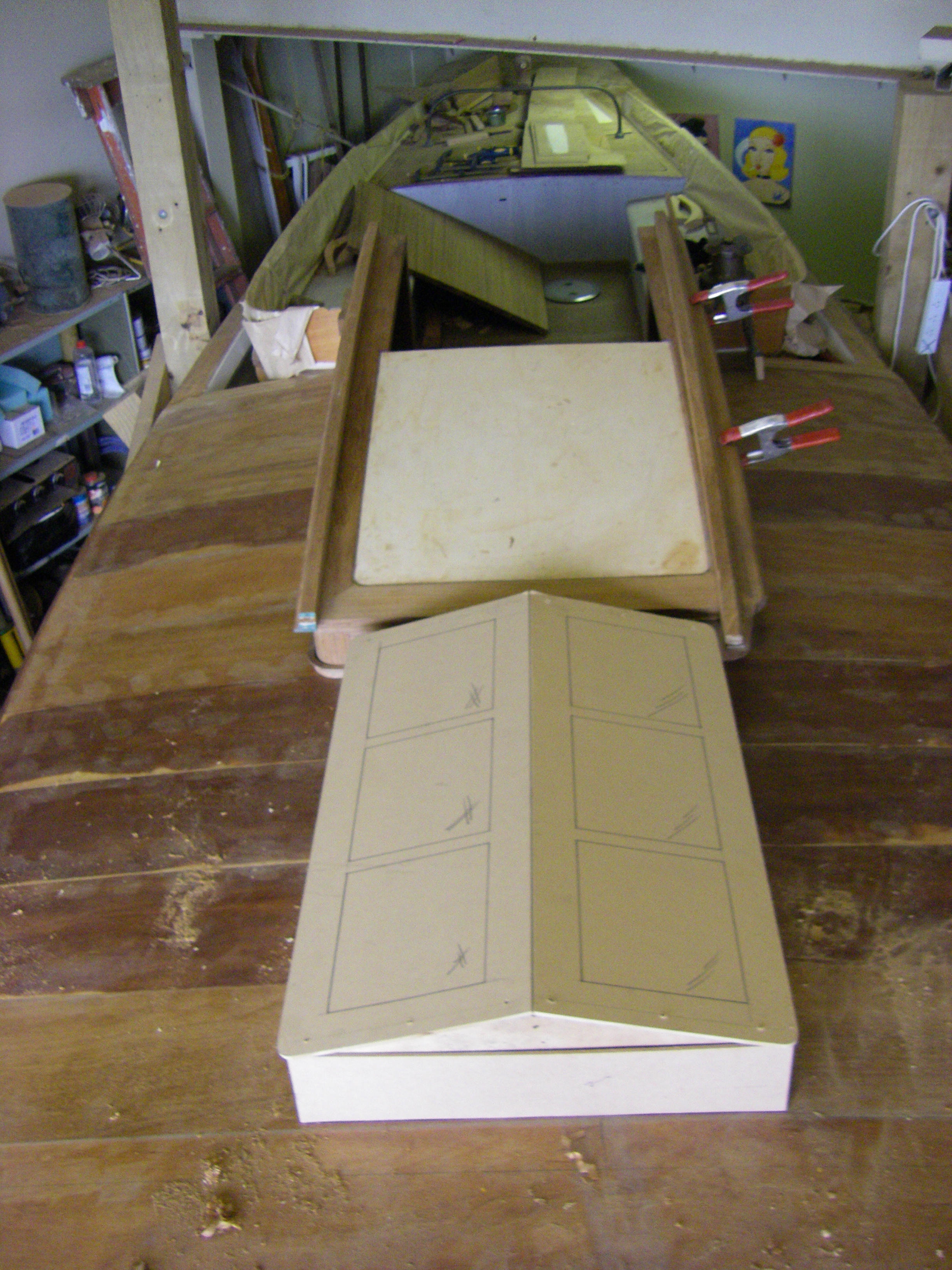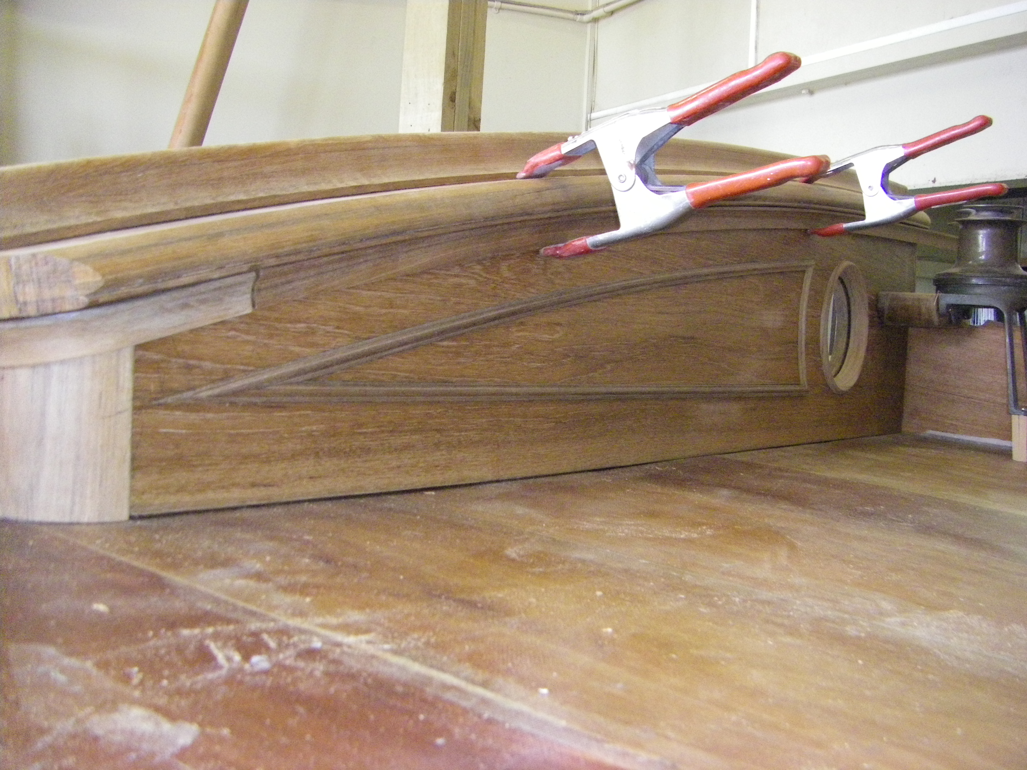 Machine timber for, and laminate on teak veneer to hatch top panel. Make and fit handle to hatch slide. Glue in and finish mouldings to hatch sides. Sand and scrape both sides of hatch top, front and sides. Make and fit forward corner internal pieces. Make and fit sill to companionway. Carve beadings around inside face of portlights.