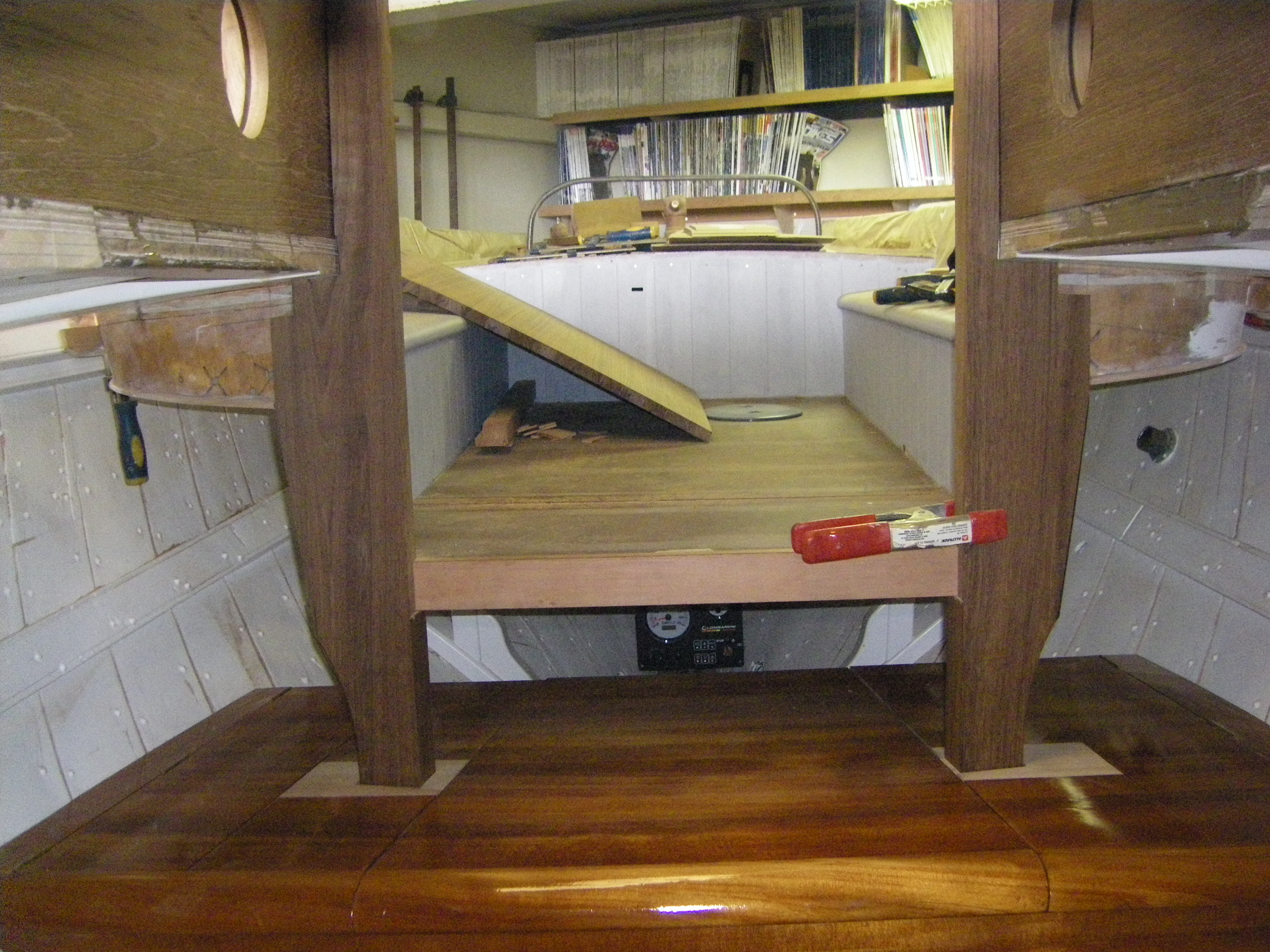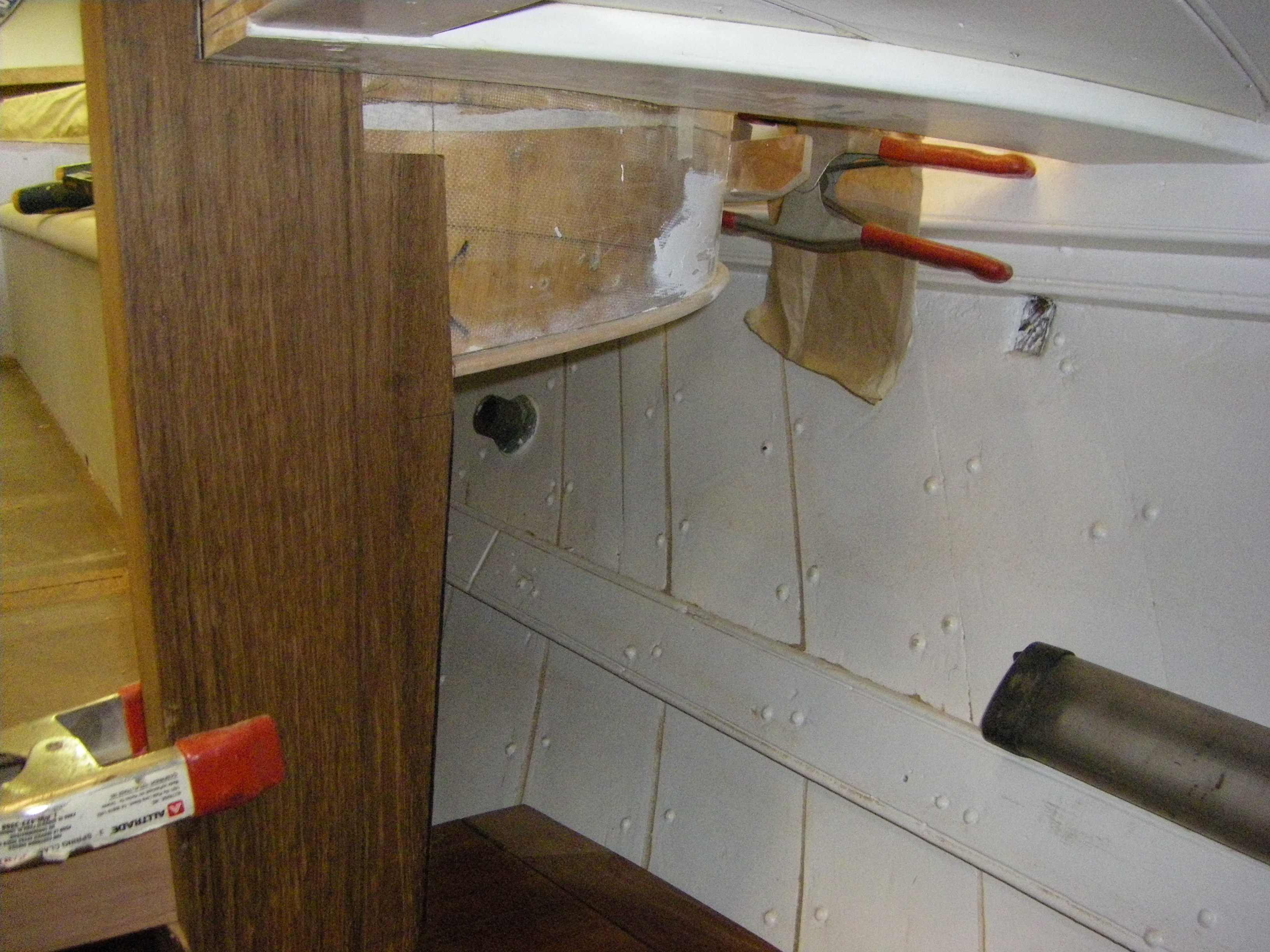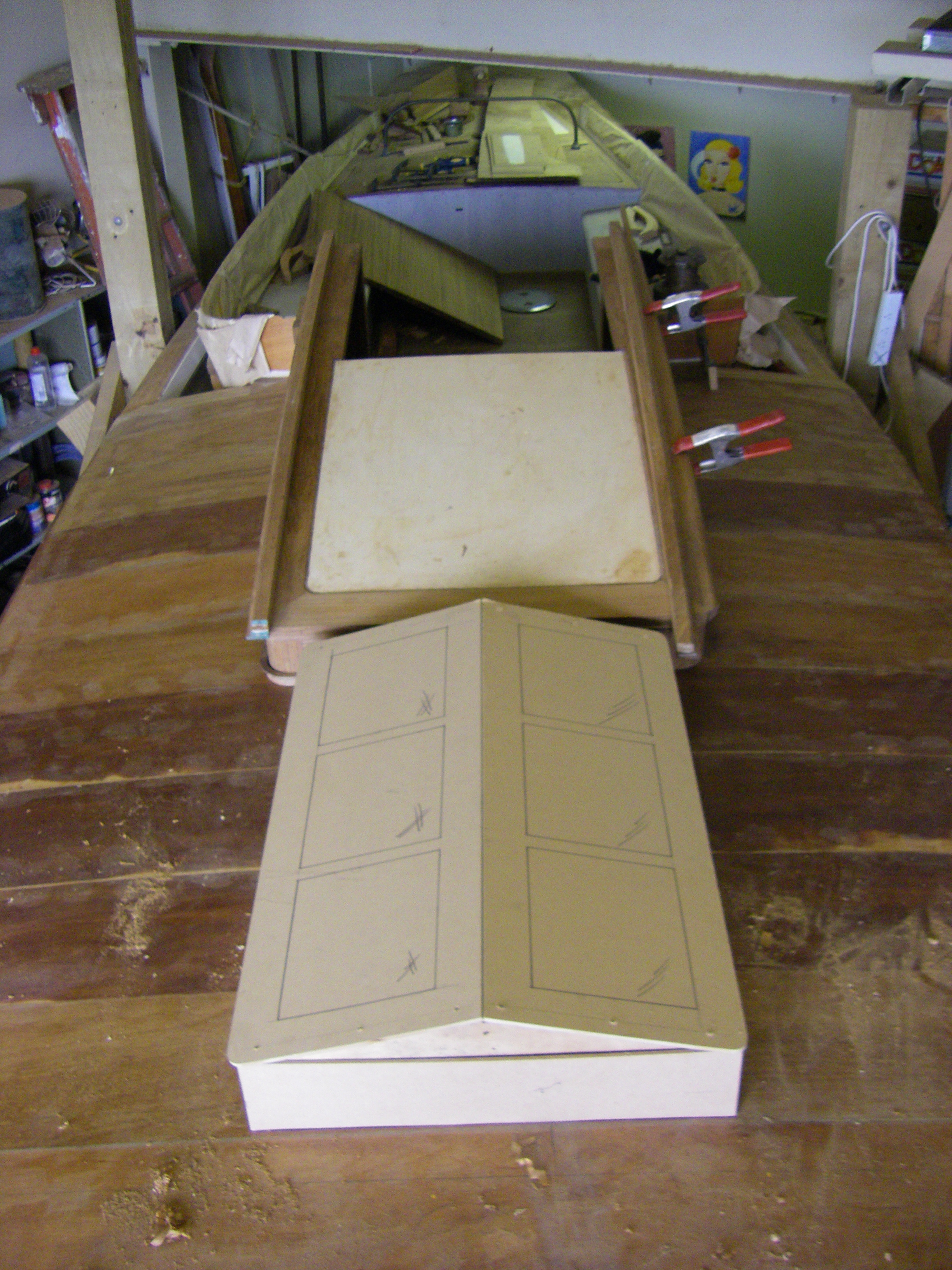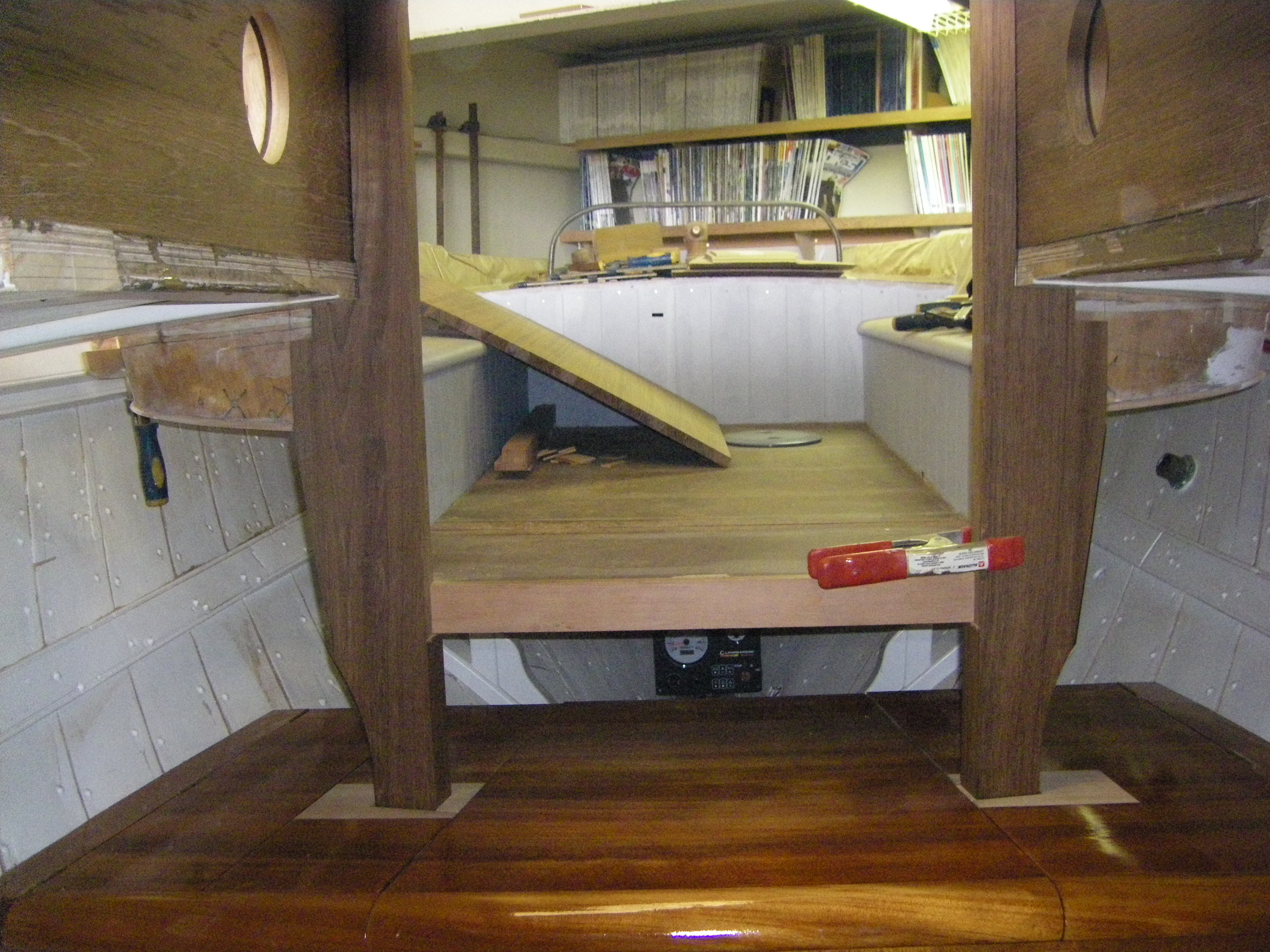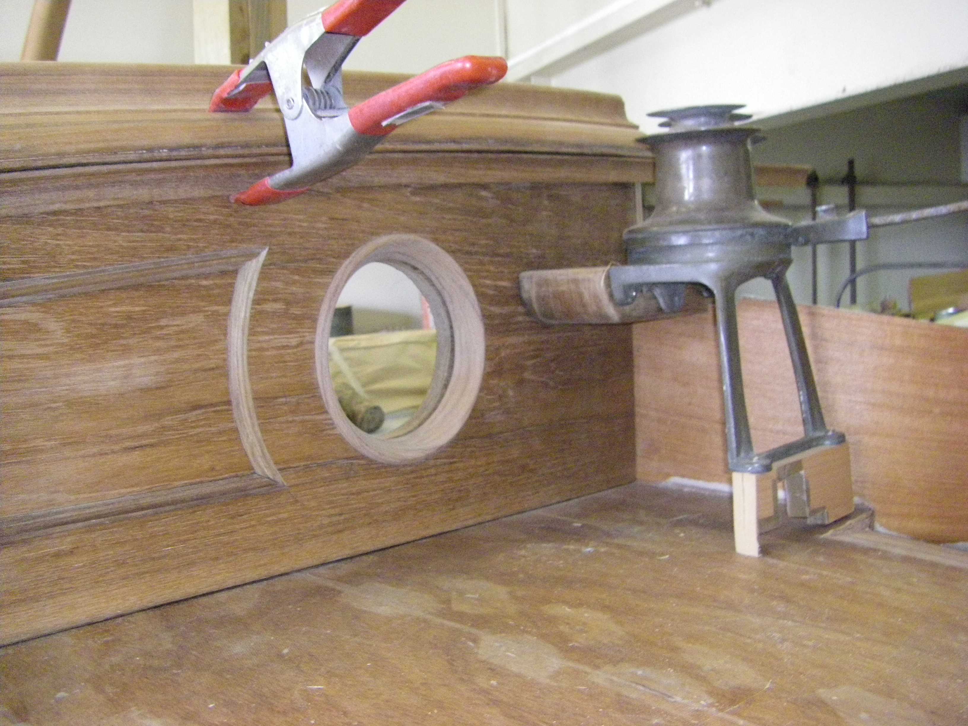 Machine timber for, and laminate on teak veneer to hatch top panel. Make and fit handle to hatch slide. Glue in and finish mouldings to hatch sides. Sand and scrape both sides of hatch top, front and sides. Make and fit forward corner internal pieces. Make and fit sill to companionway. Carve beadings around inside face of portlights.