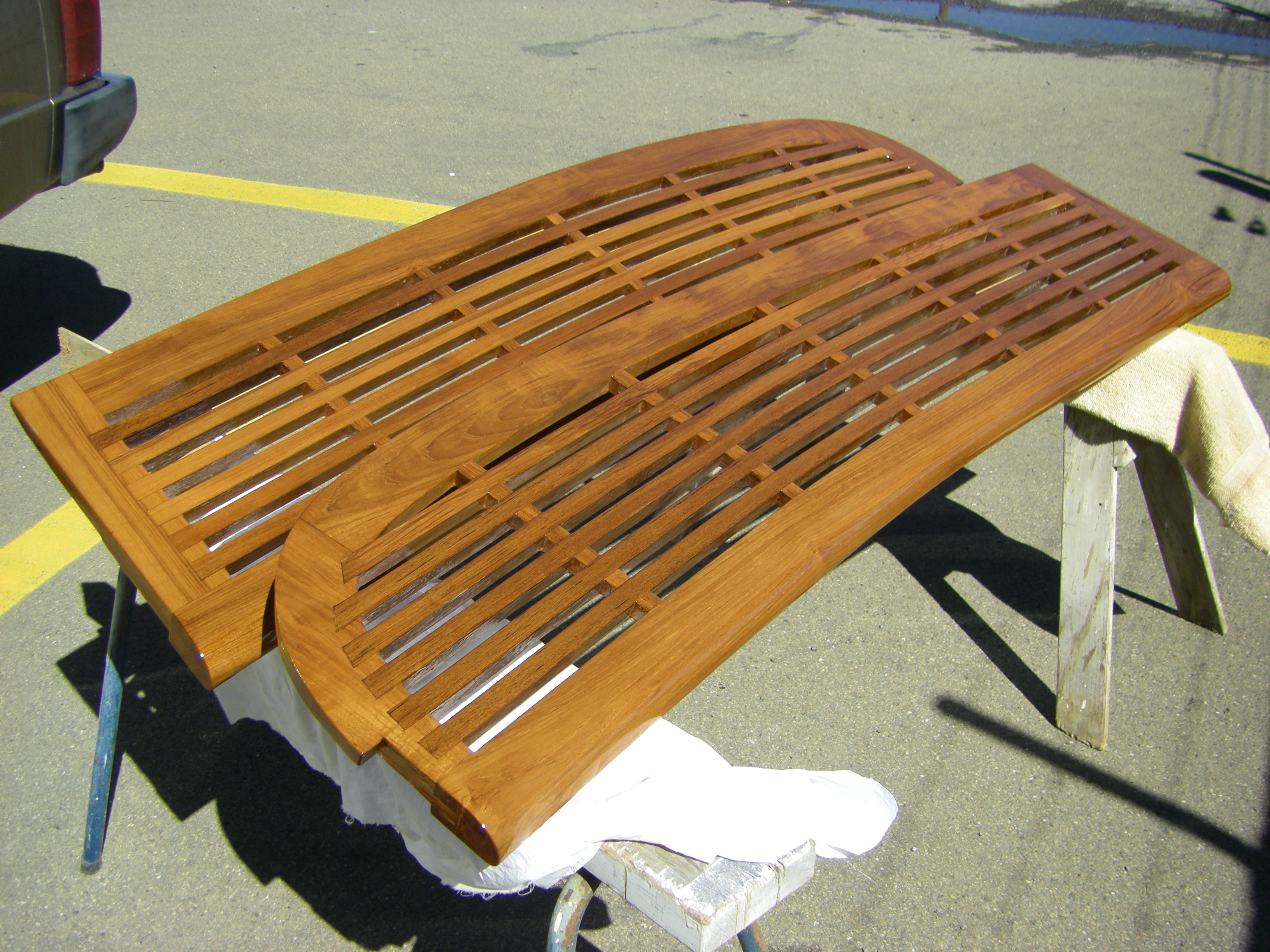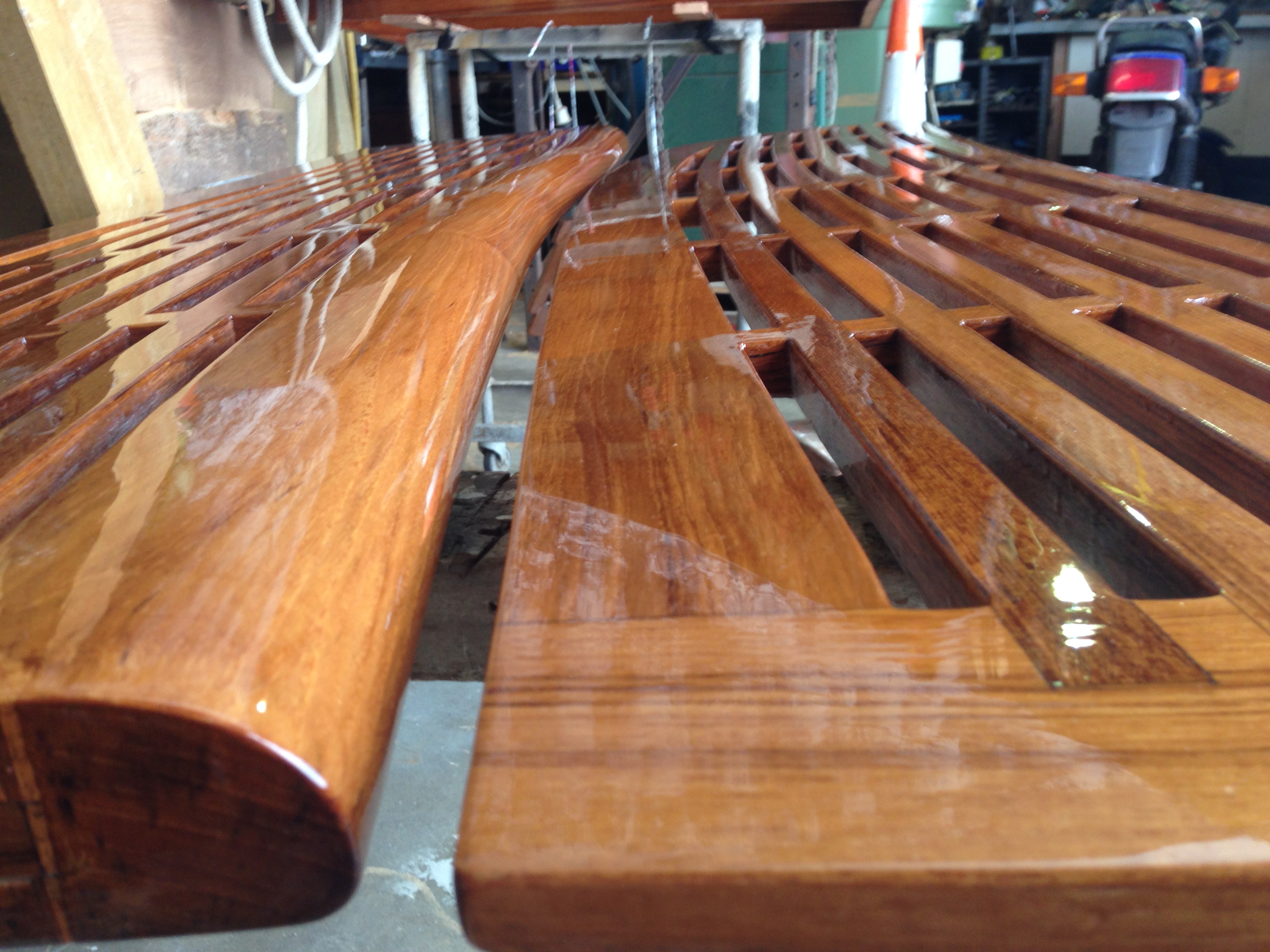 Dismantle skylight. Glue, screw and bung centre rail together; cut bead into lower edge. Sand and seal frames, leaves, case and centrerail. Denib and coat with Uroxsys. Sand and recoat to give four coats to all, except centre rail (two coats).