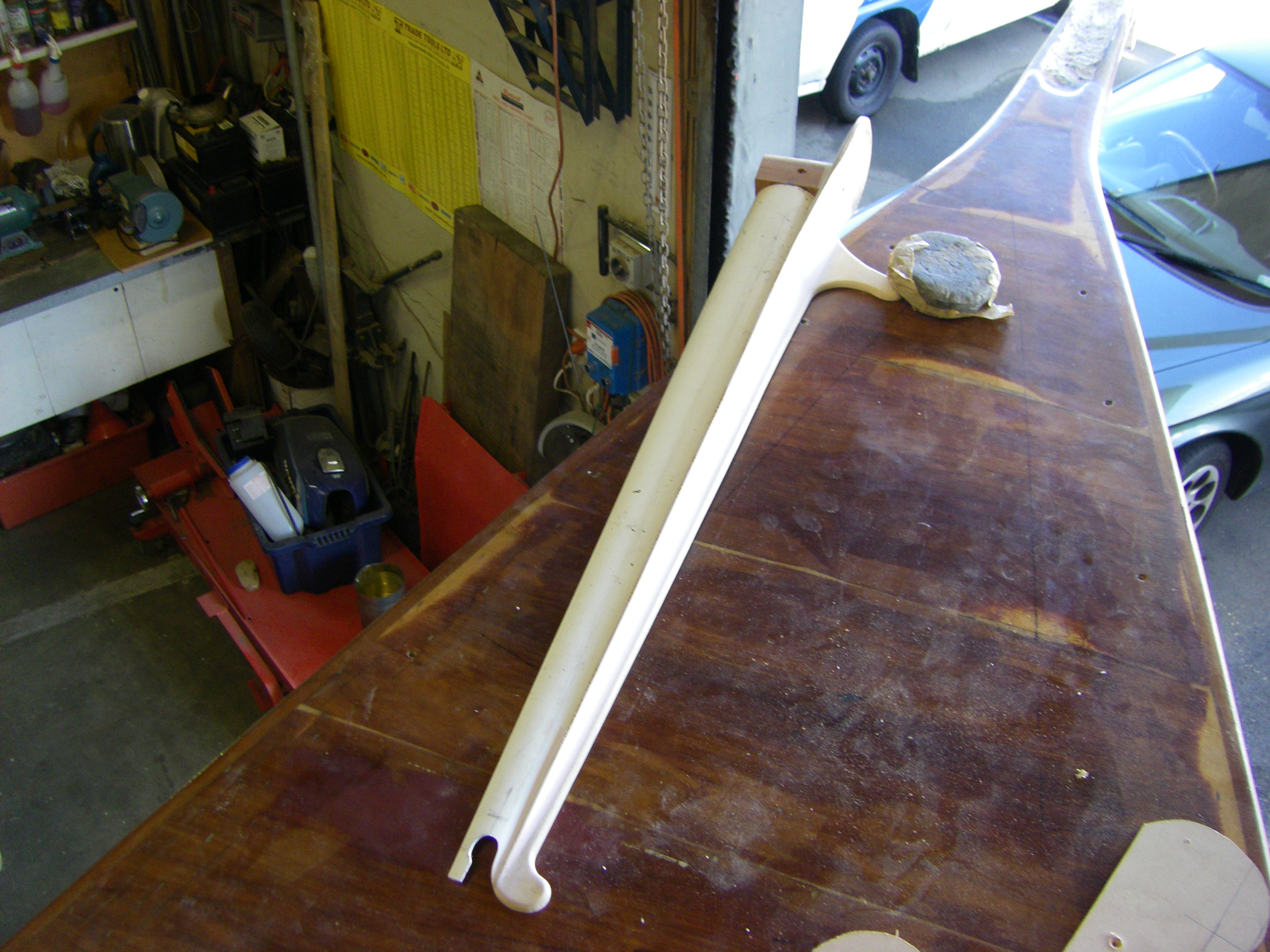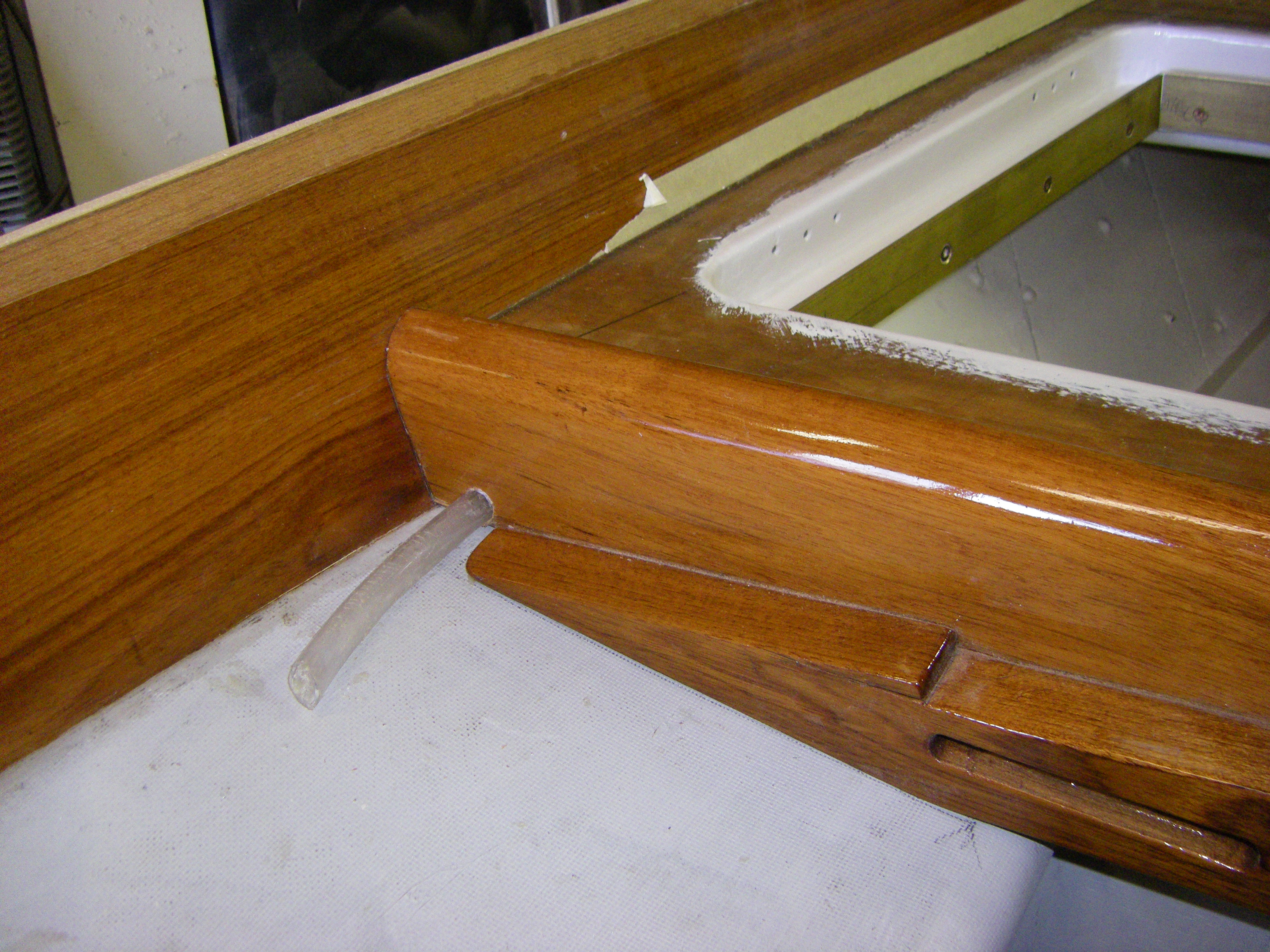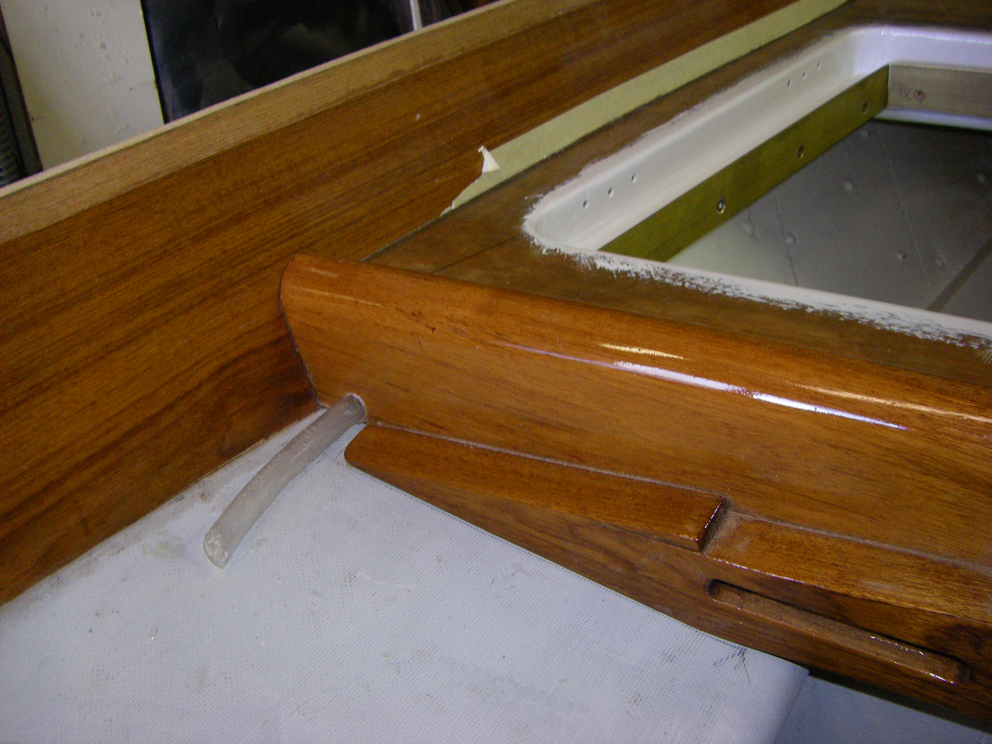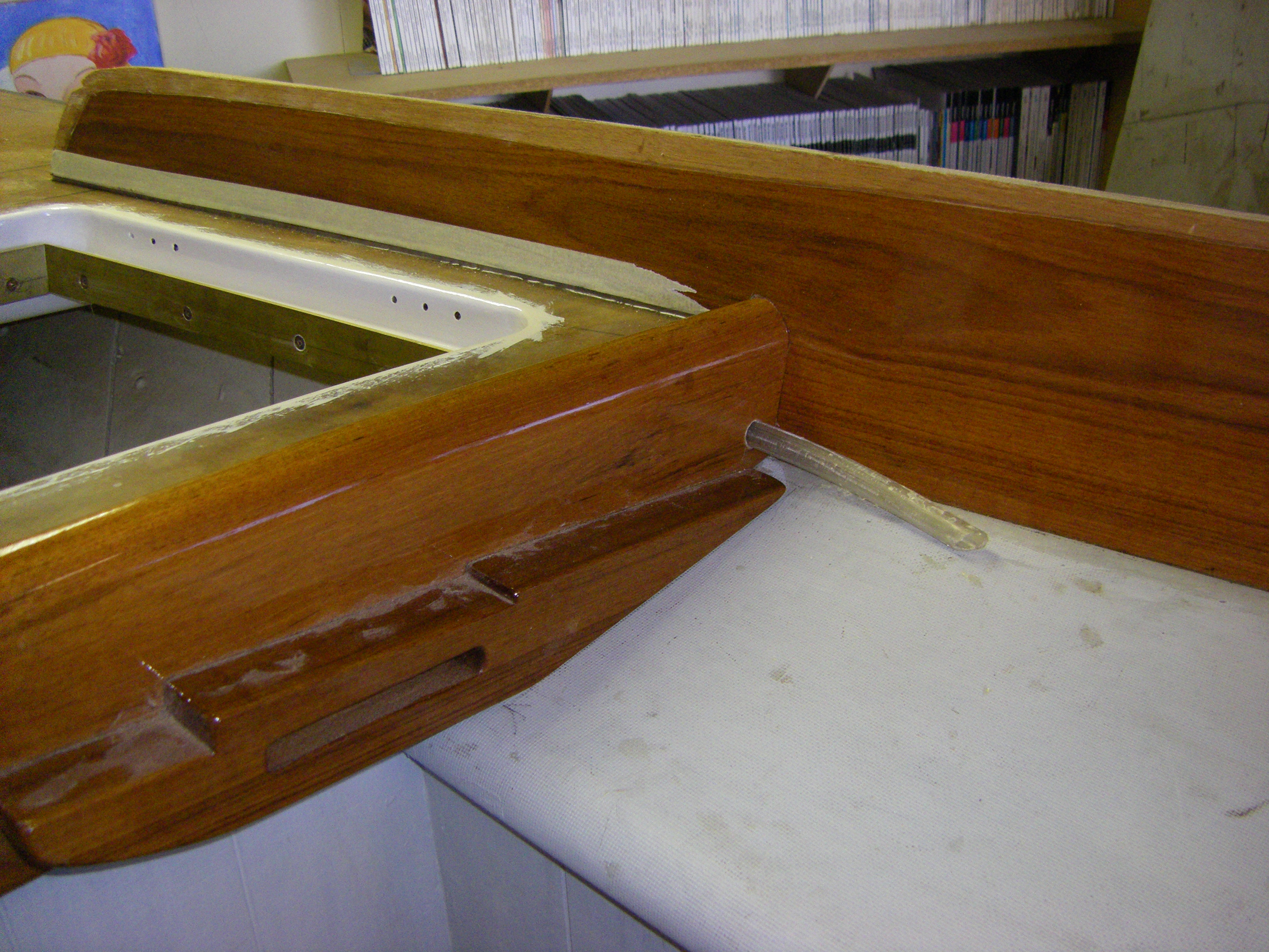 Apply four coats of Uroxsys to toerail bottoms and cut scroll into ends. Sand deck resin. Spot fill and fair deck as required. Apply second re-resin. Increase channel size in lazarette hatch lid returns. Size, bore for and glue in plastic tubes for drainage. Double resin, prime, undercoat and topcoat all channel framing. Refit and seal brass channel sides. Sand, everdure, prime, undercoat and topcoat (twice) lazarette hatch lids. Mock up bow roller.