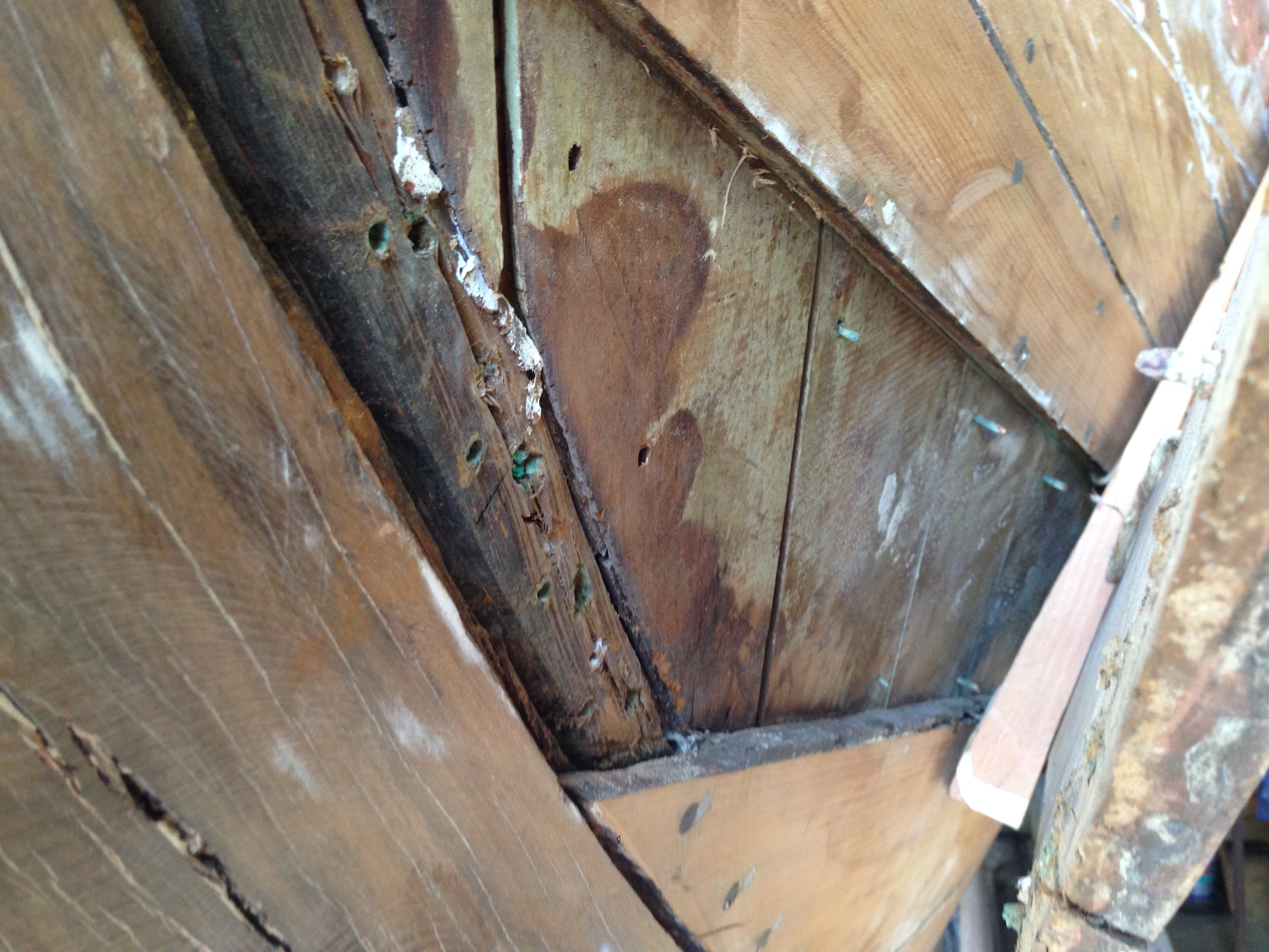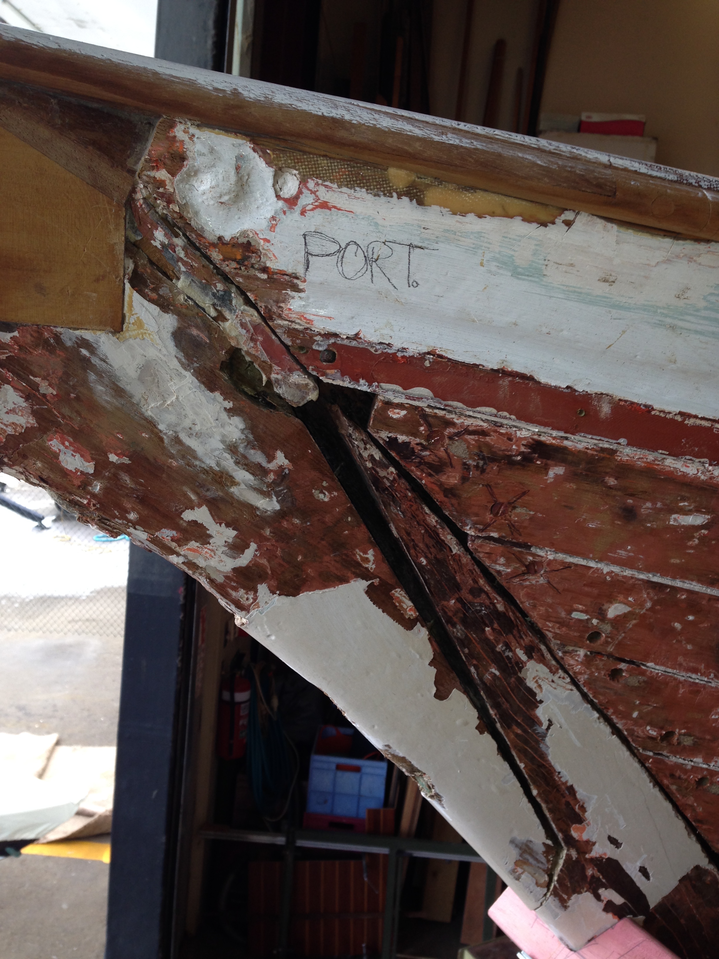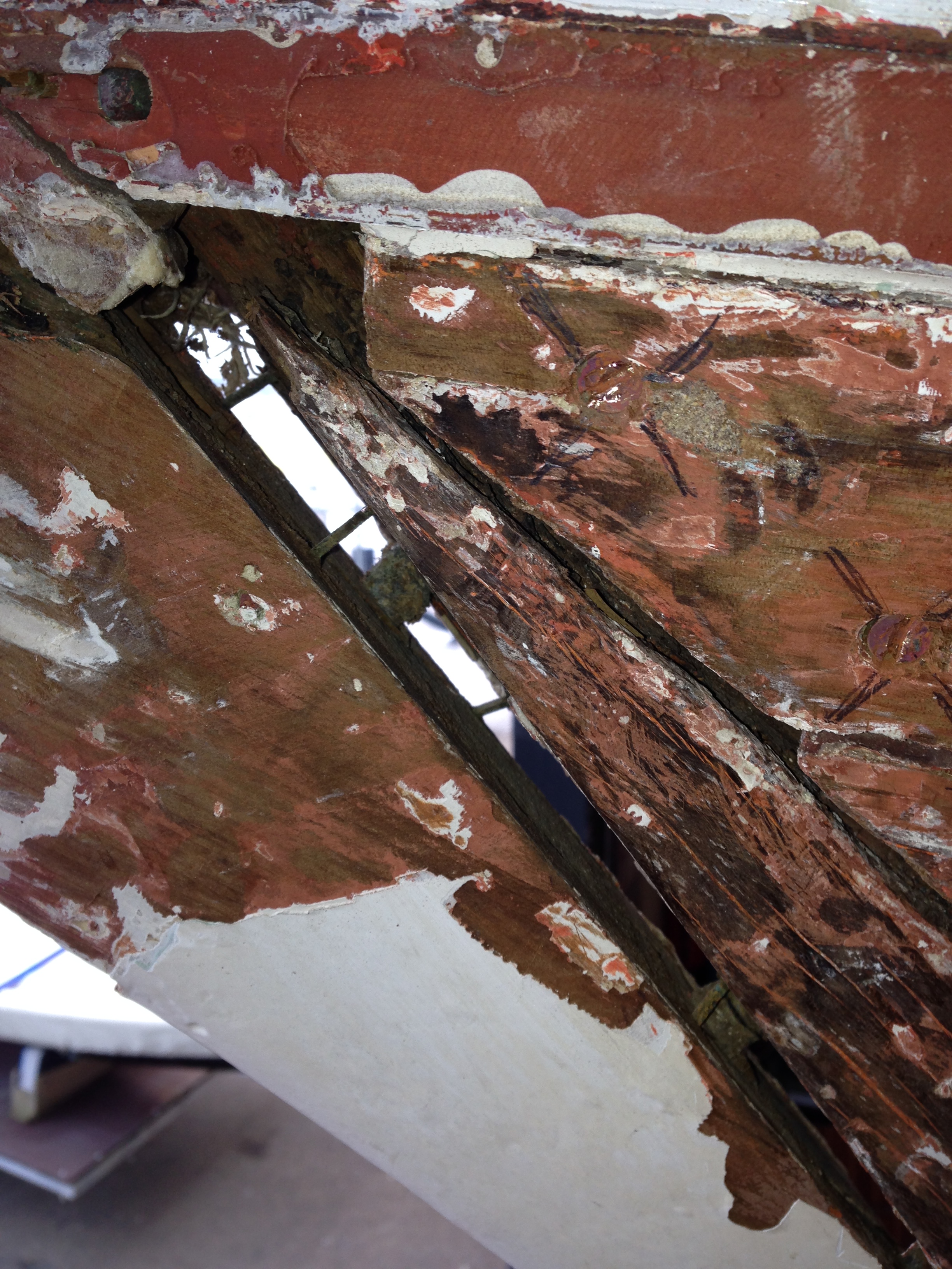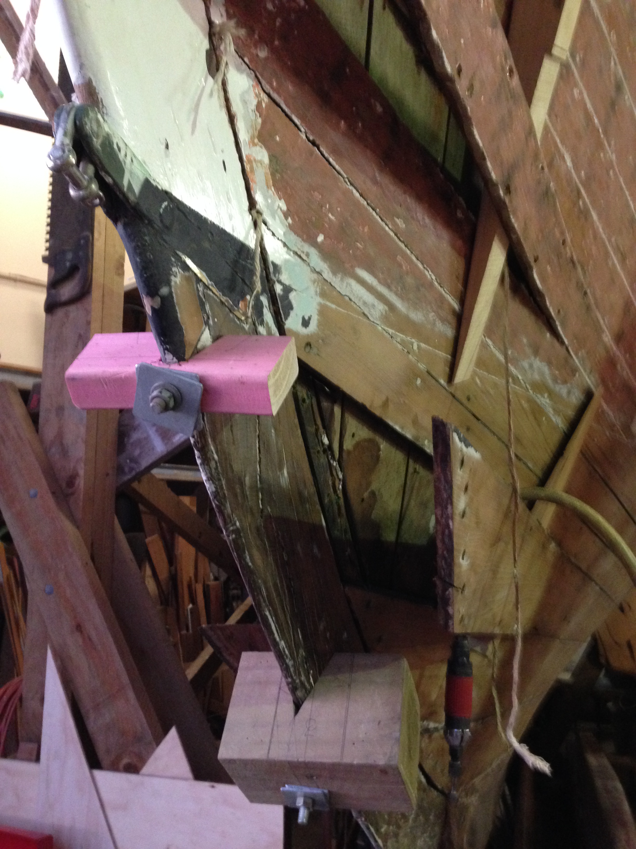 Release all port planking and garboard at stem. Drive out or cut remaining drifts. Remove false stem. Make patterns to guide further work on stem. Remove packing at billethead joint. Withdraw or cut drifts. Cut as required to remove billethead.
