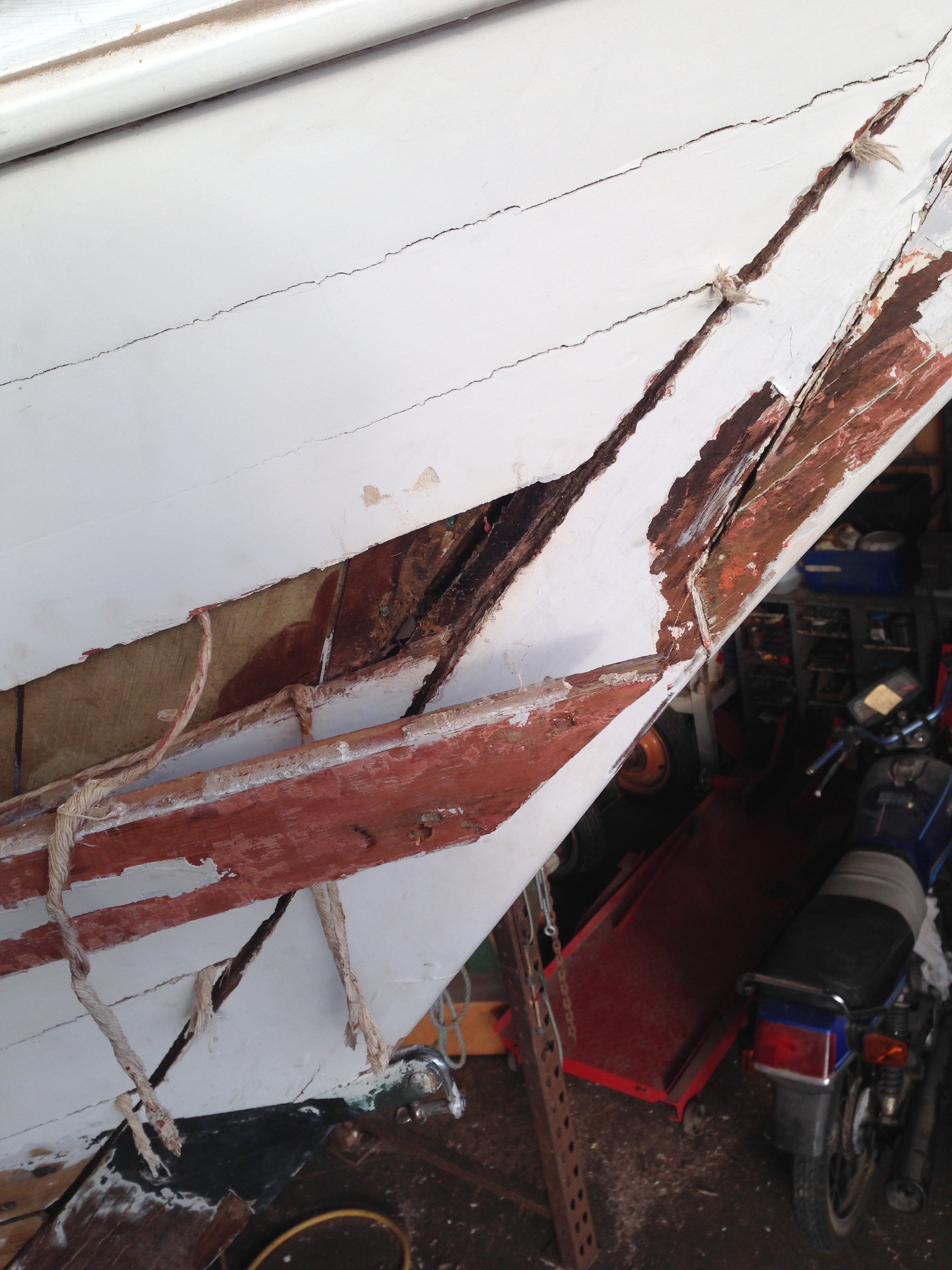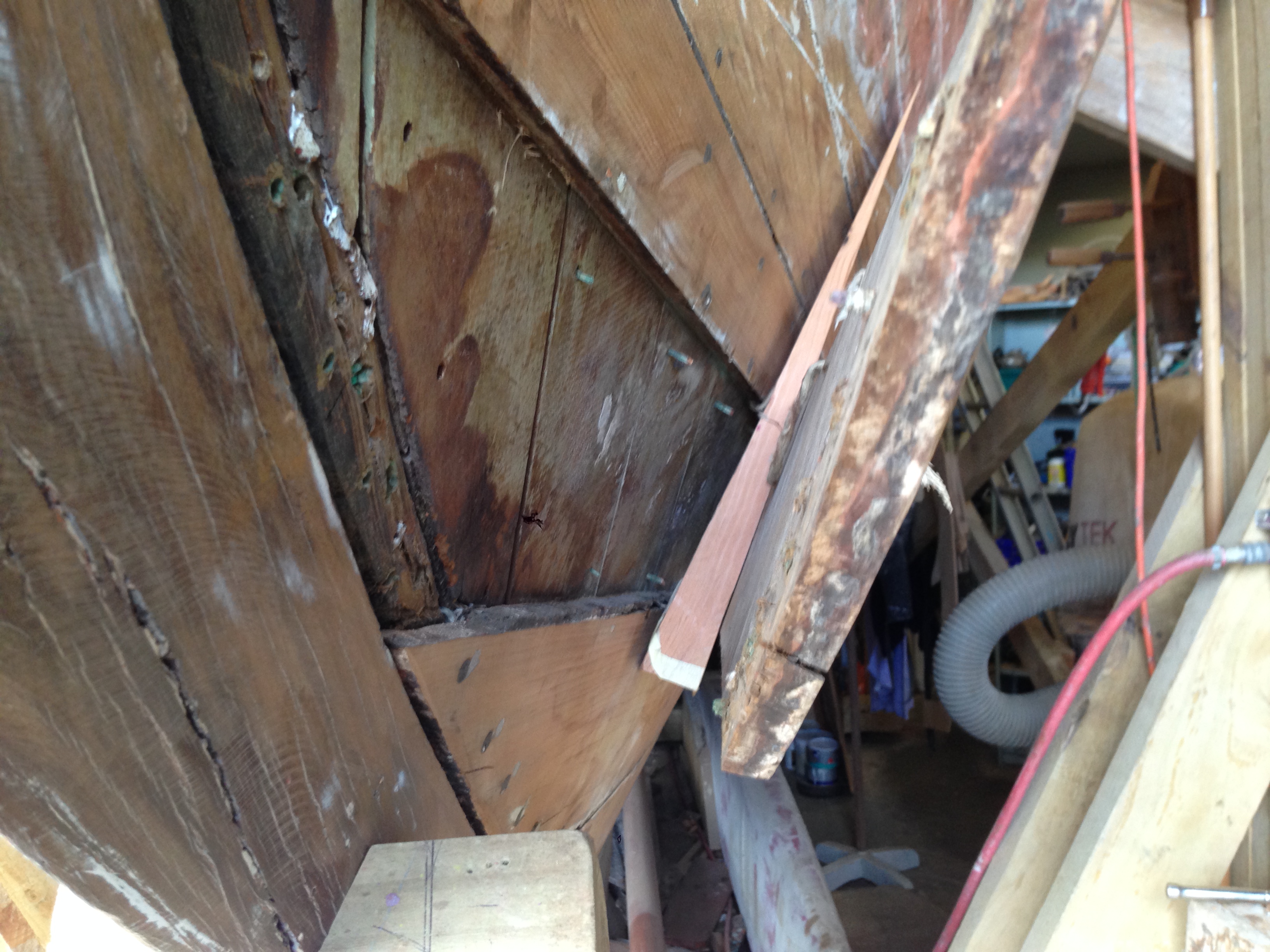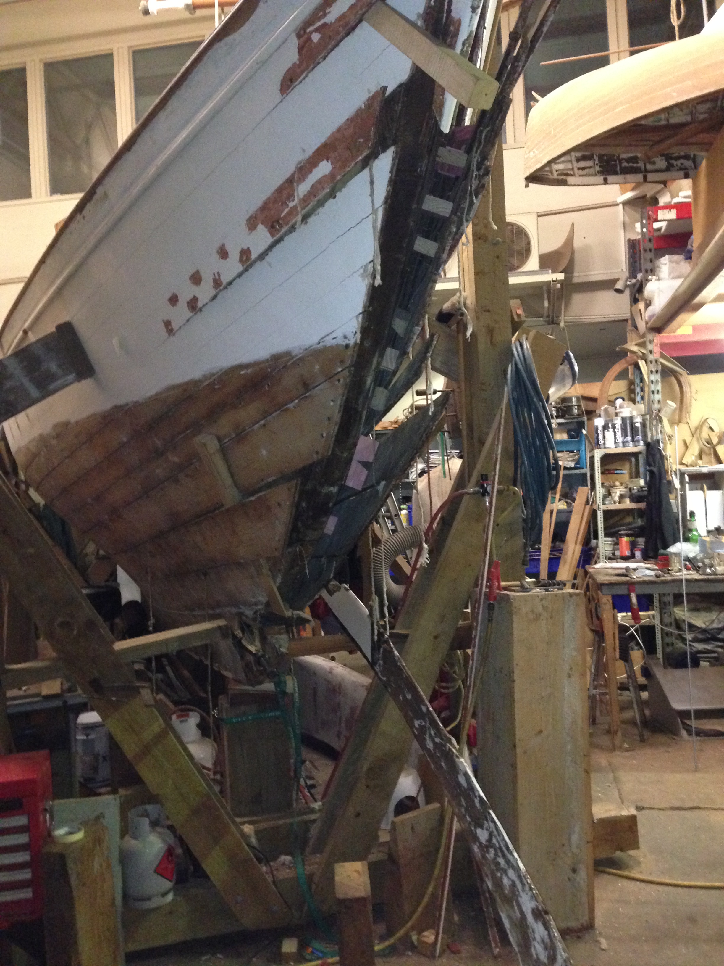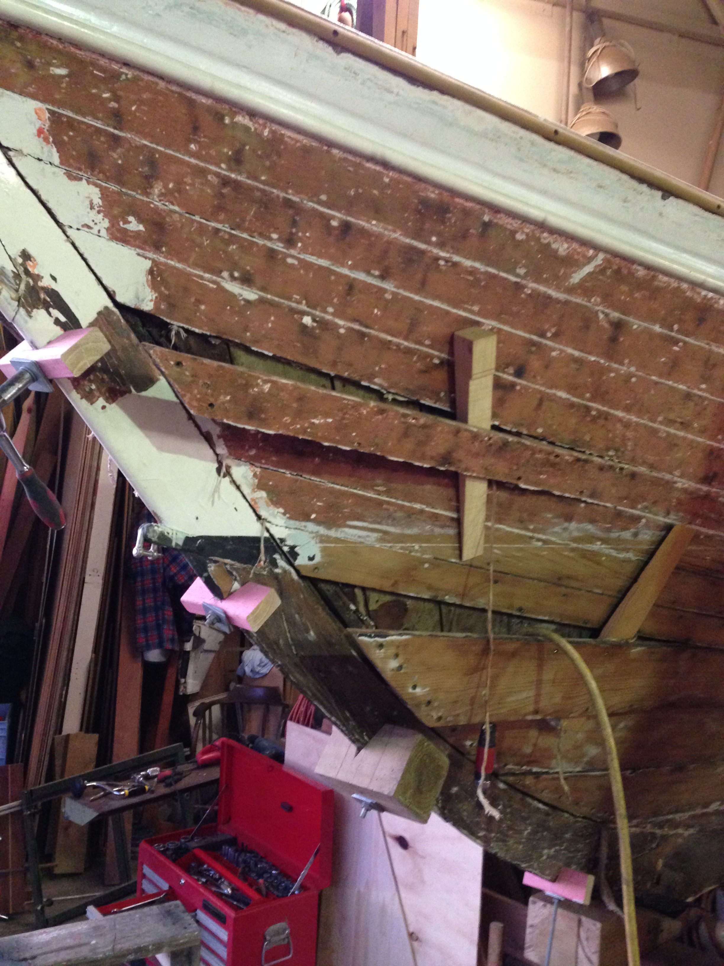 Release all port planking and garboard at stem. Drive out or cut remaining drifts. Remove false stem. Make patterns to guide further work on stem. Remove packing at billethead joint. Withdraw or cut drifts. Cut as required to remove billethead.