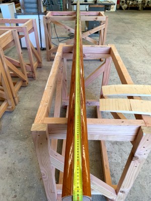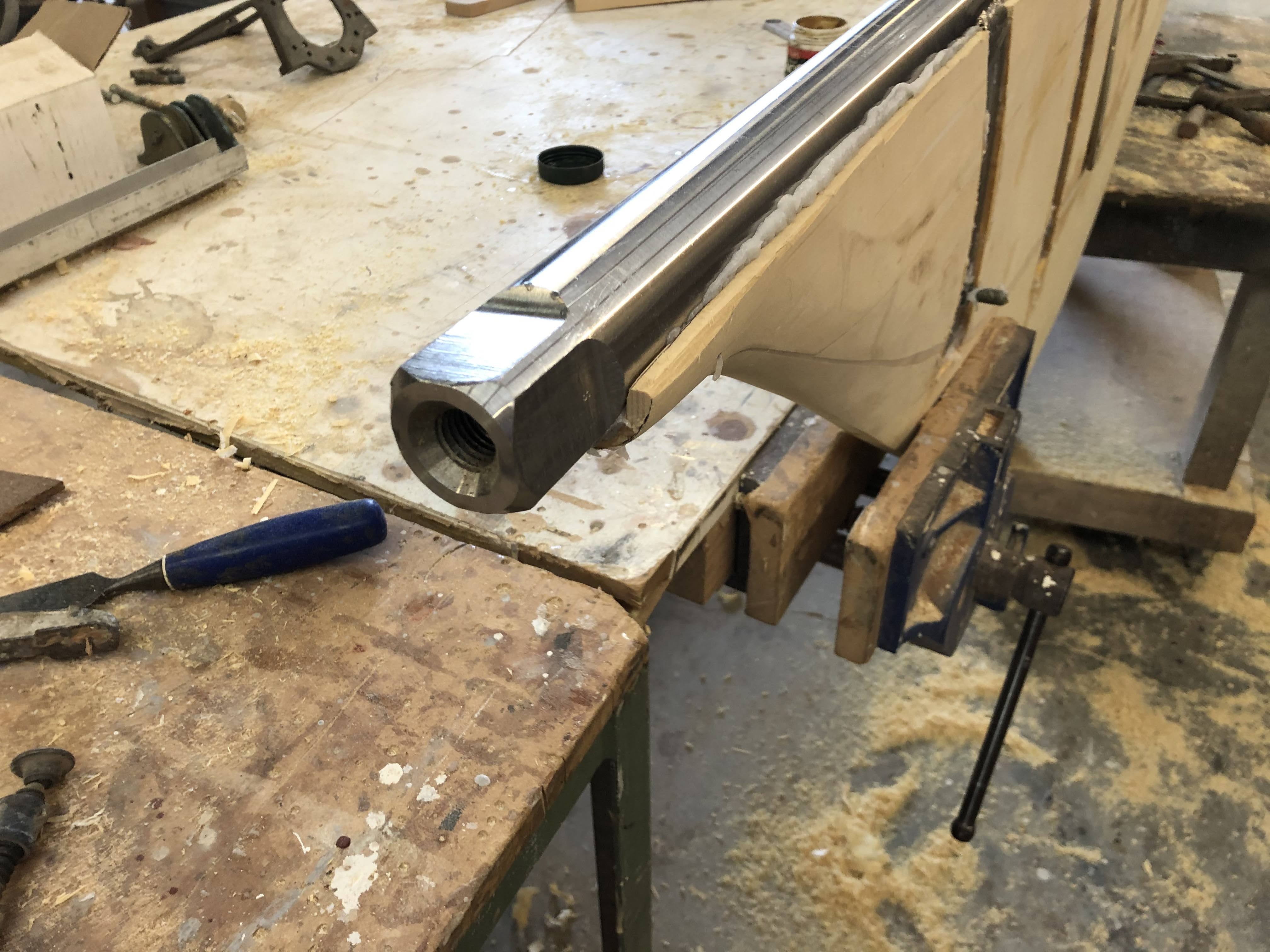 Ballast cast precisely in accordance with Bruce Askew’s design but, at 1425 kgs, 25 per cent light on his extrapolated 1900 kgs weight. Suggestions of error will be met by reference to excruciatingauthenticity.Pattern for forward end of toerails, to be extended by about 50 per cent.Rudder and rudderstock test-fitted.