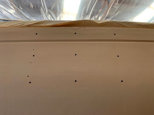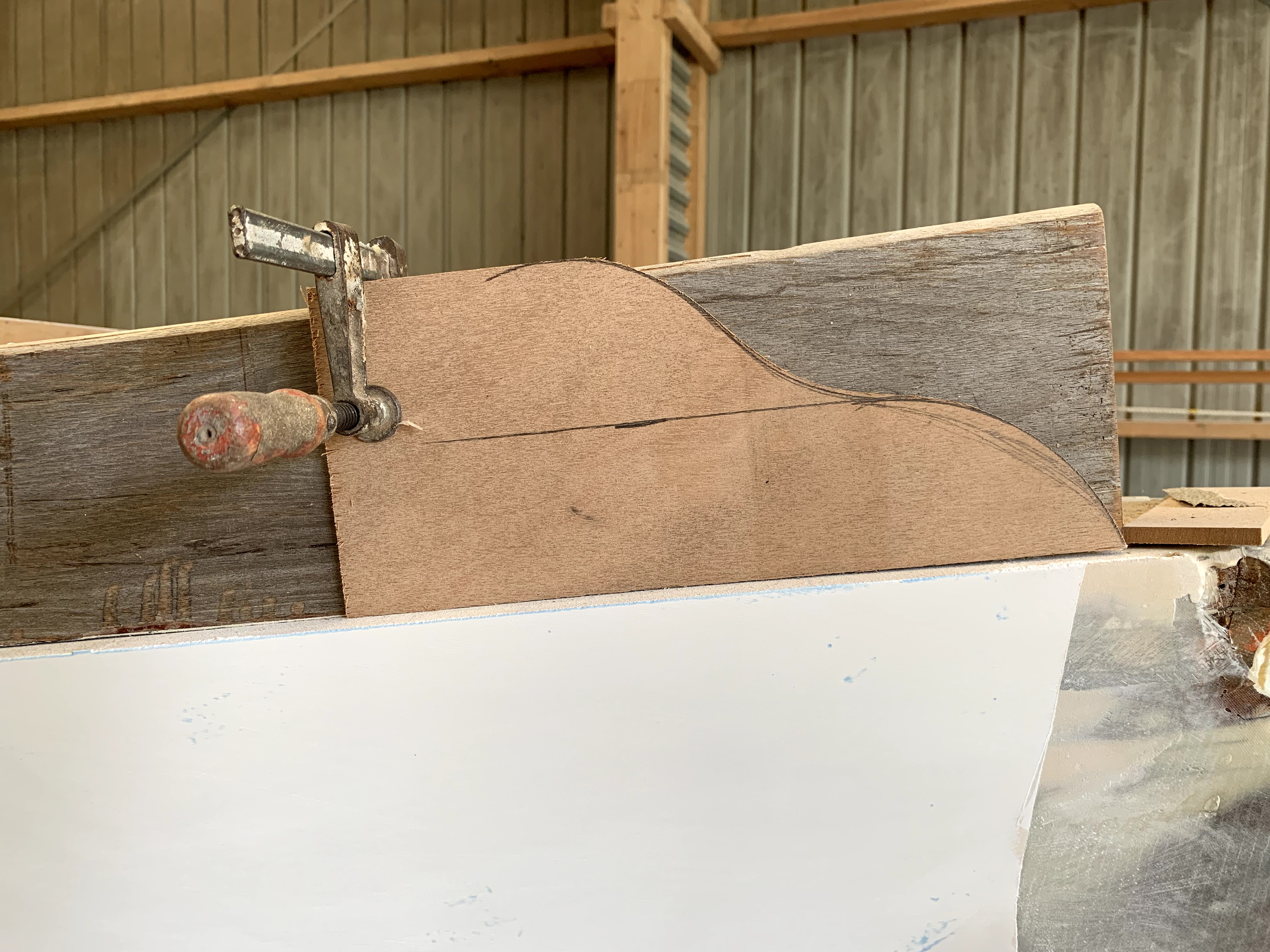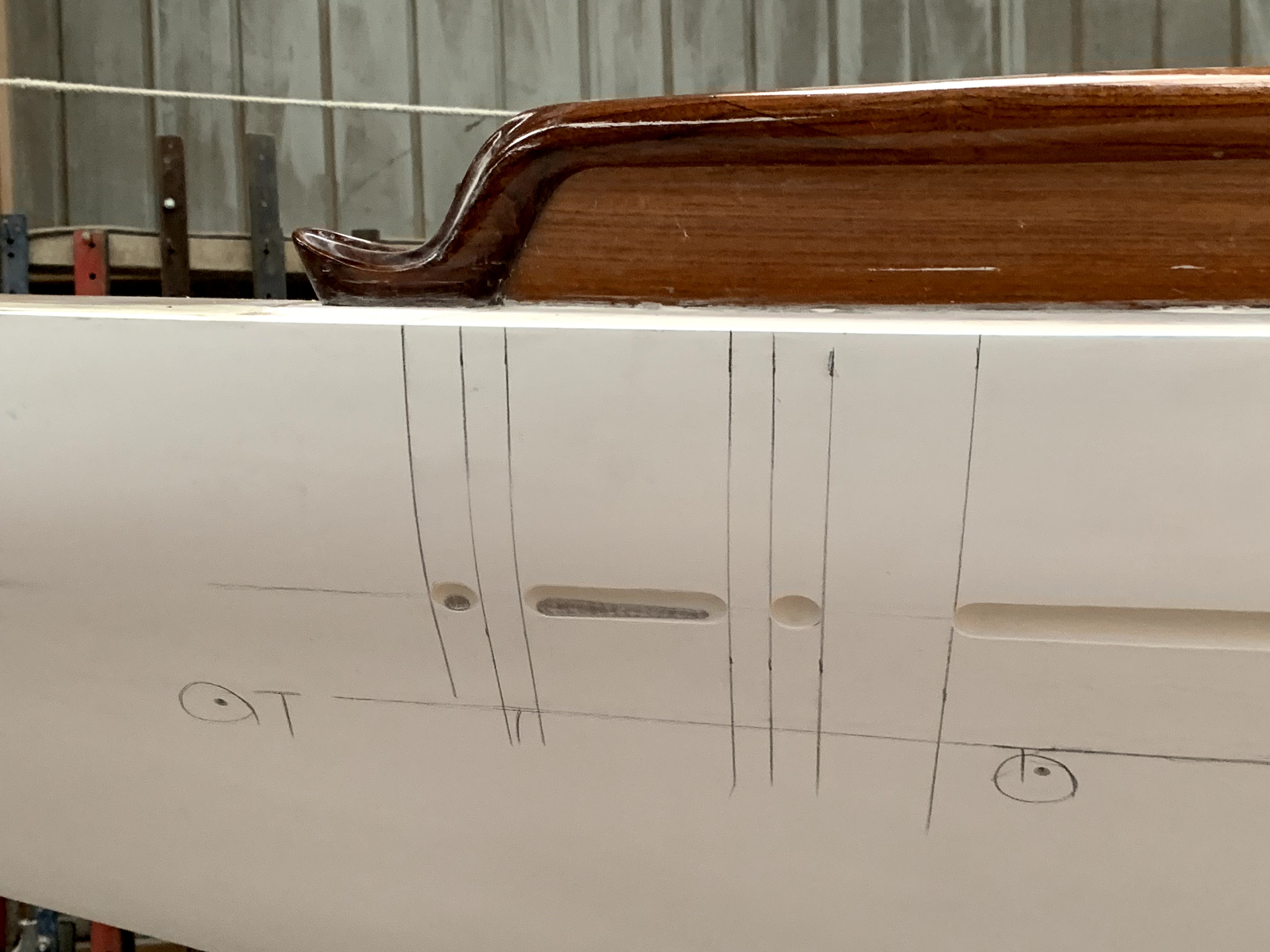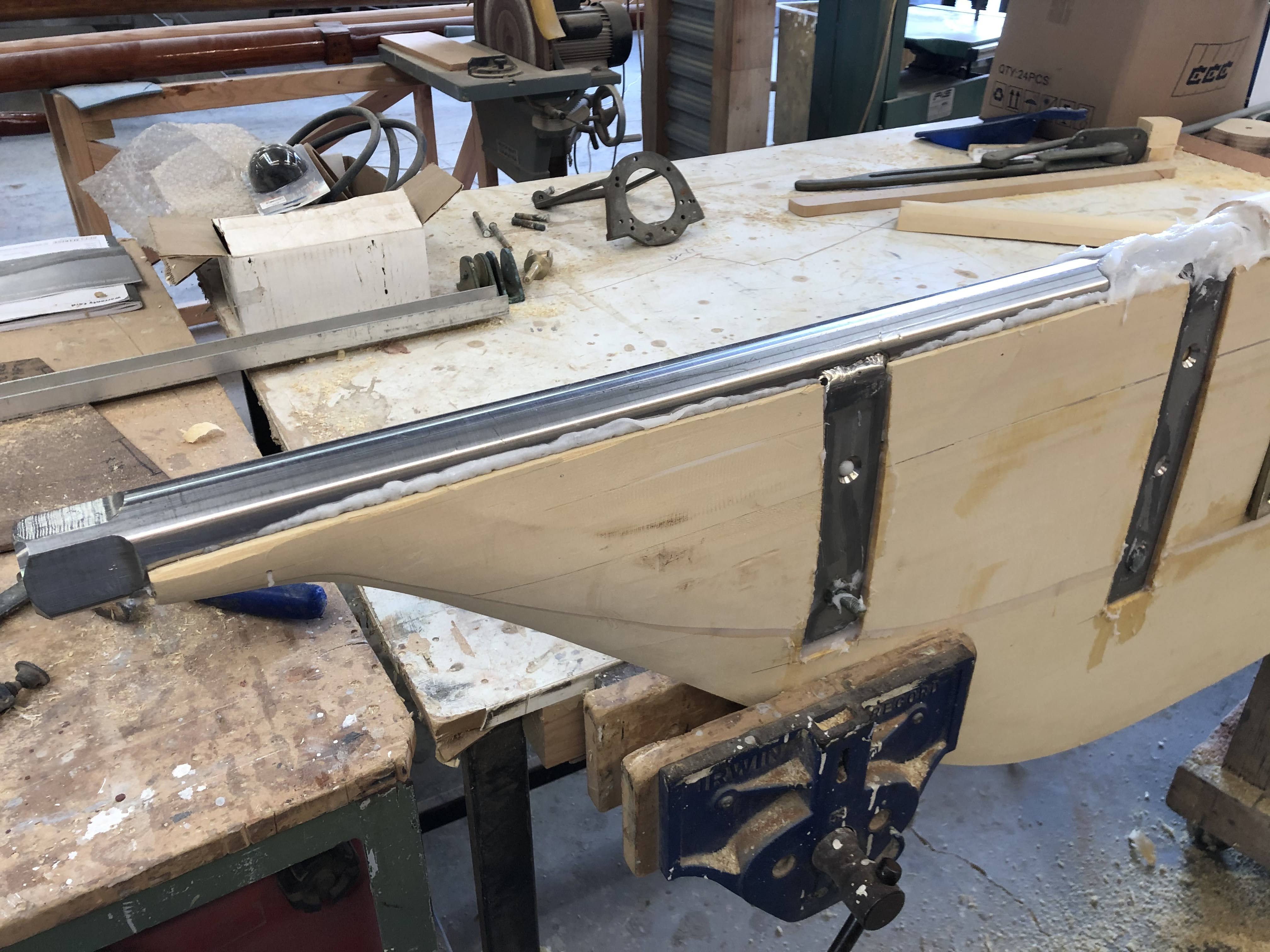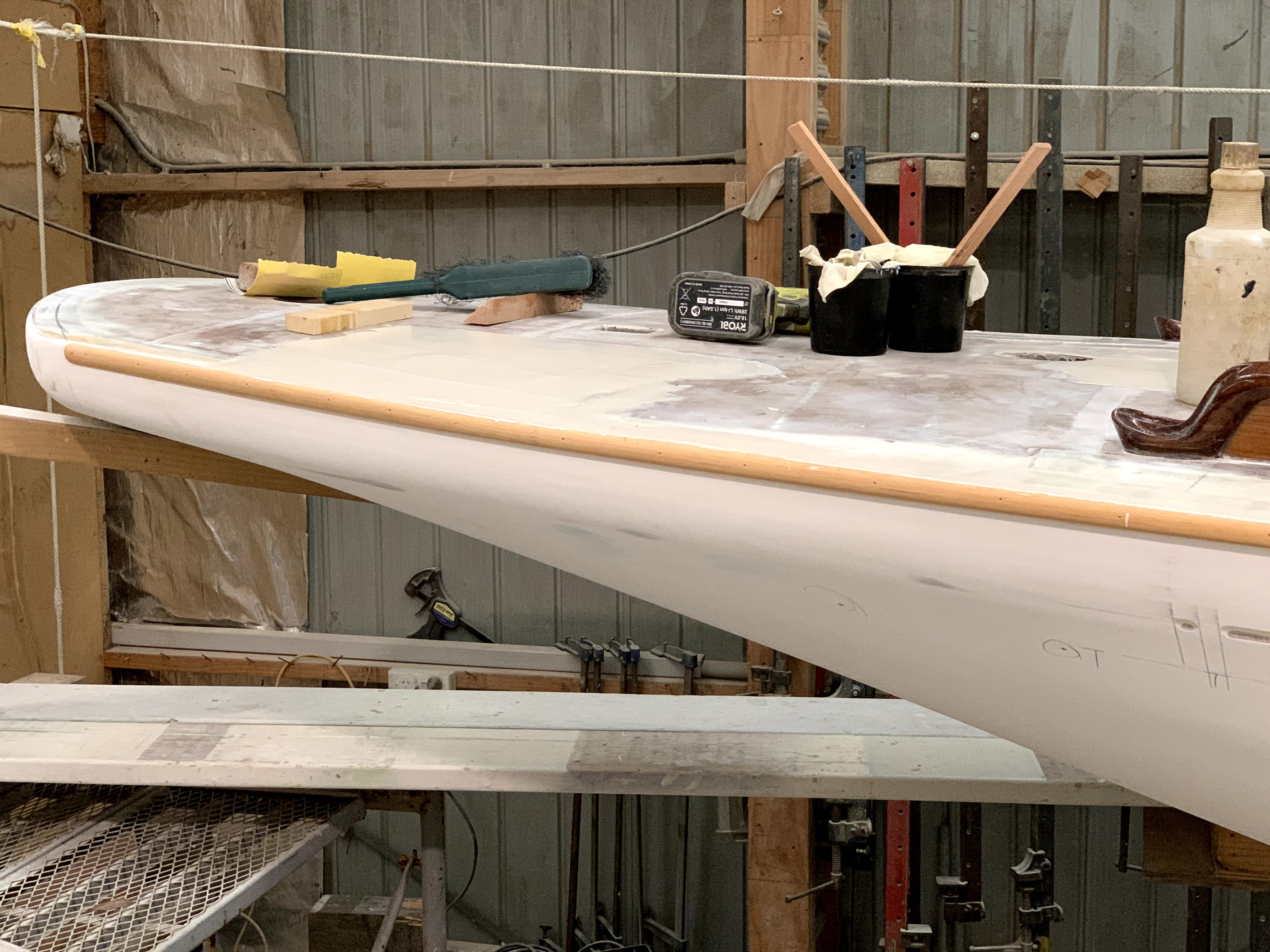 Hull undercoated; original waterline marked out.Test cove line routed at point of port chainplates.Hull/deck intersection augmented to sharp edge (for application of full length D moulding, integrating into chainplates), and toe rails test-fitted as far outboard as achievable.Oregon mast repurposed as 7.4m boom …… and 4.8m gaff.New bobstay pattern moulded on Rogue‘s stem, replacing the above.Final Auckland sailplan and deck arrangements.