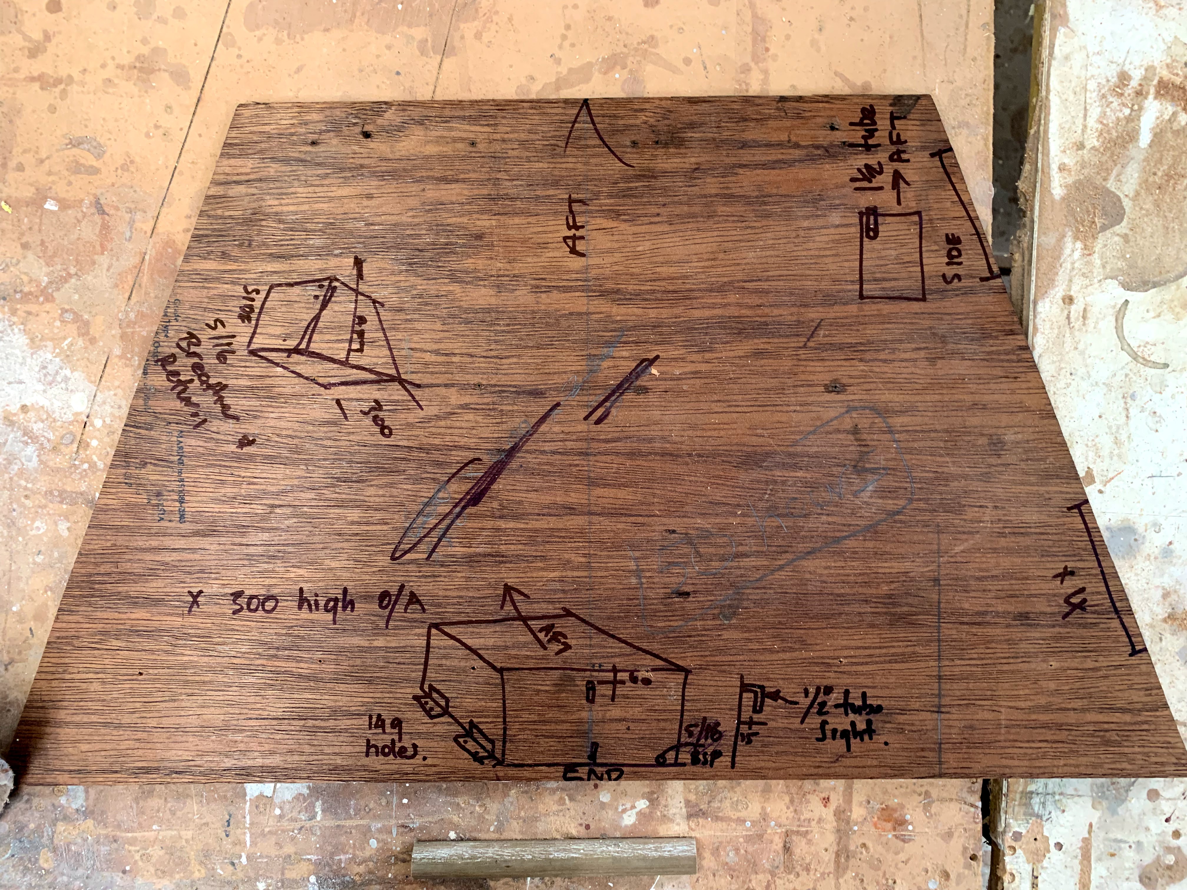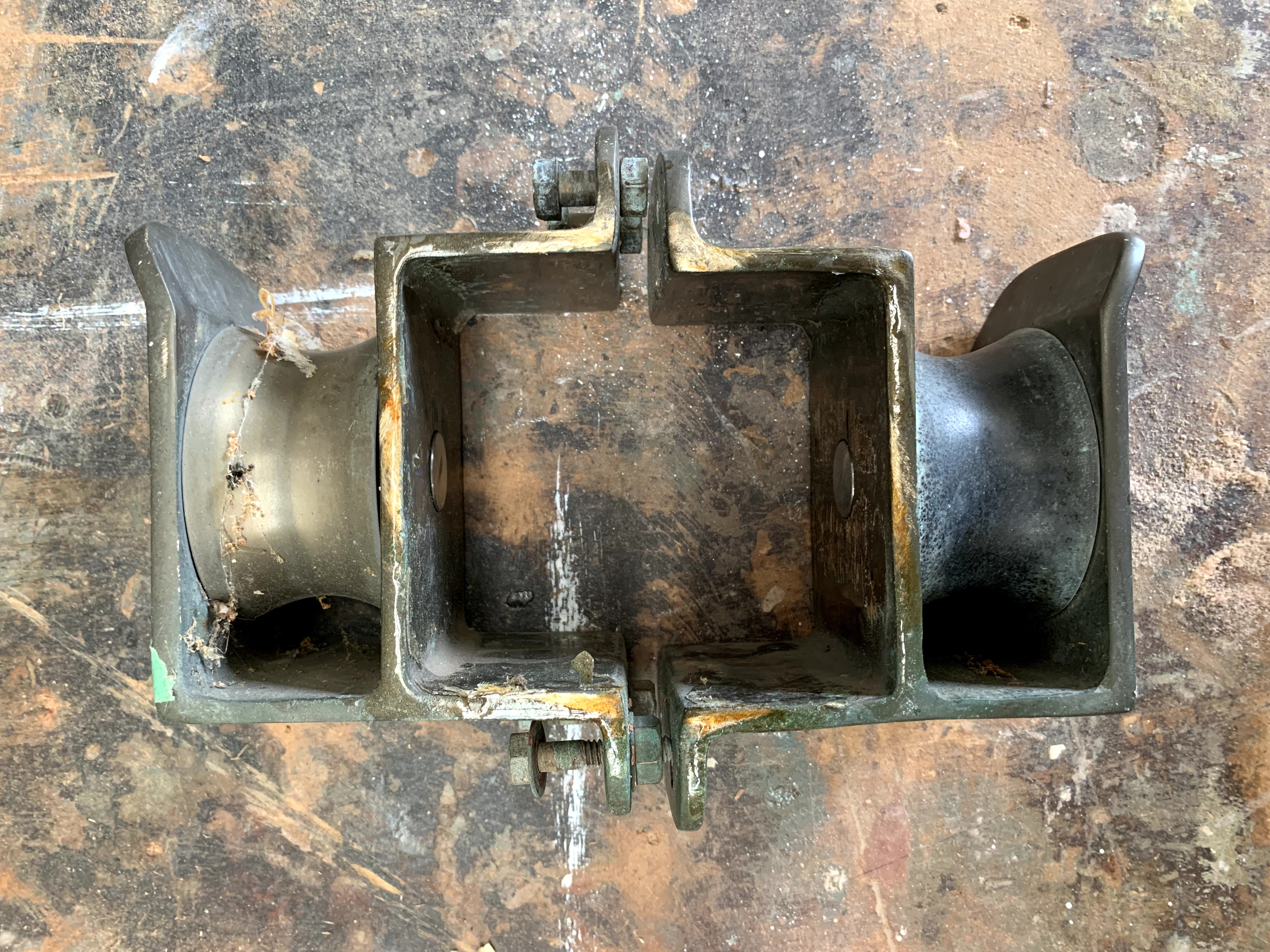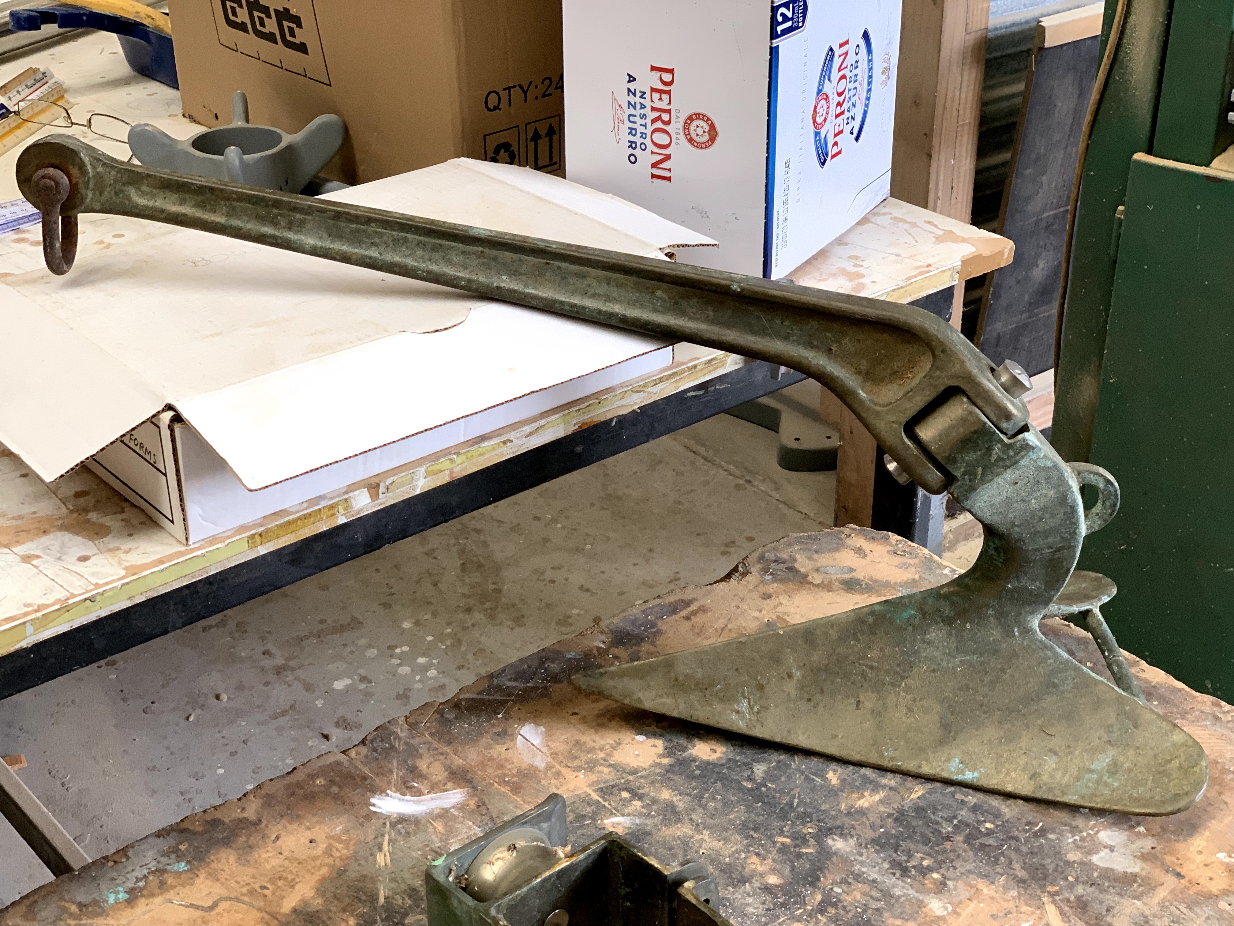 Exploded view of rudderstock internals.Bowsprit, butted up to sampson post, with cranse and gammon iron patterns fitted.Mooring line block patterns (actually, Gloriana’s) for casting and fitting to bowsprit, forward of figureheadNew ringframe, beam, knees and floor at point of mast insertion from deck to maststep (and note uroxsysed fitted ceiling planks) …… aligning with forward shroud, and pads for aft shrouds.Electrics box (to support also switchbreaker, voltmeter, and VHF radio).And a new (to Rogue) 12.5 kg bronze CQR anchor, likely manufactured at the RNZN Devonport Base.