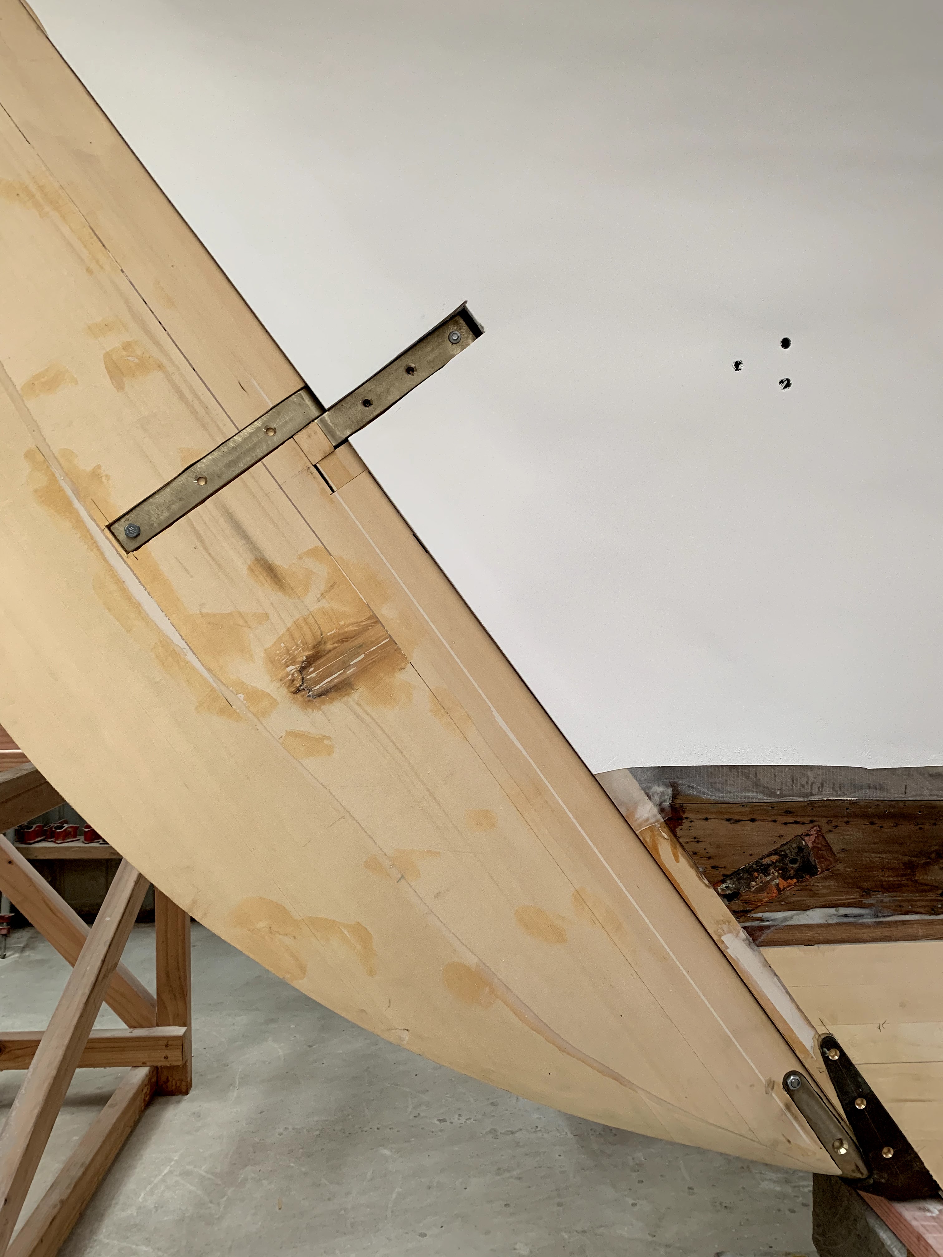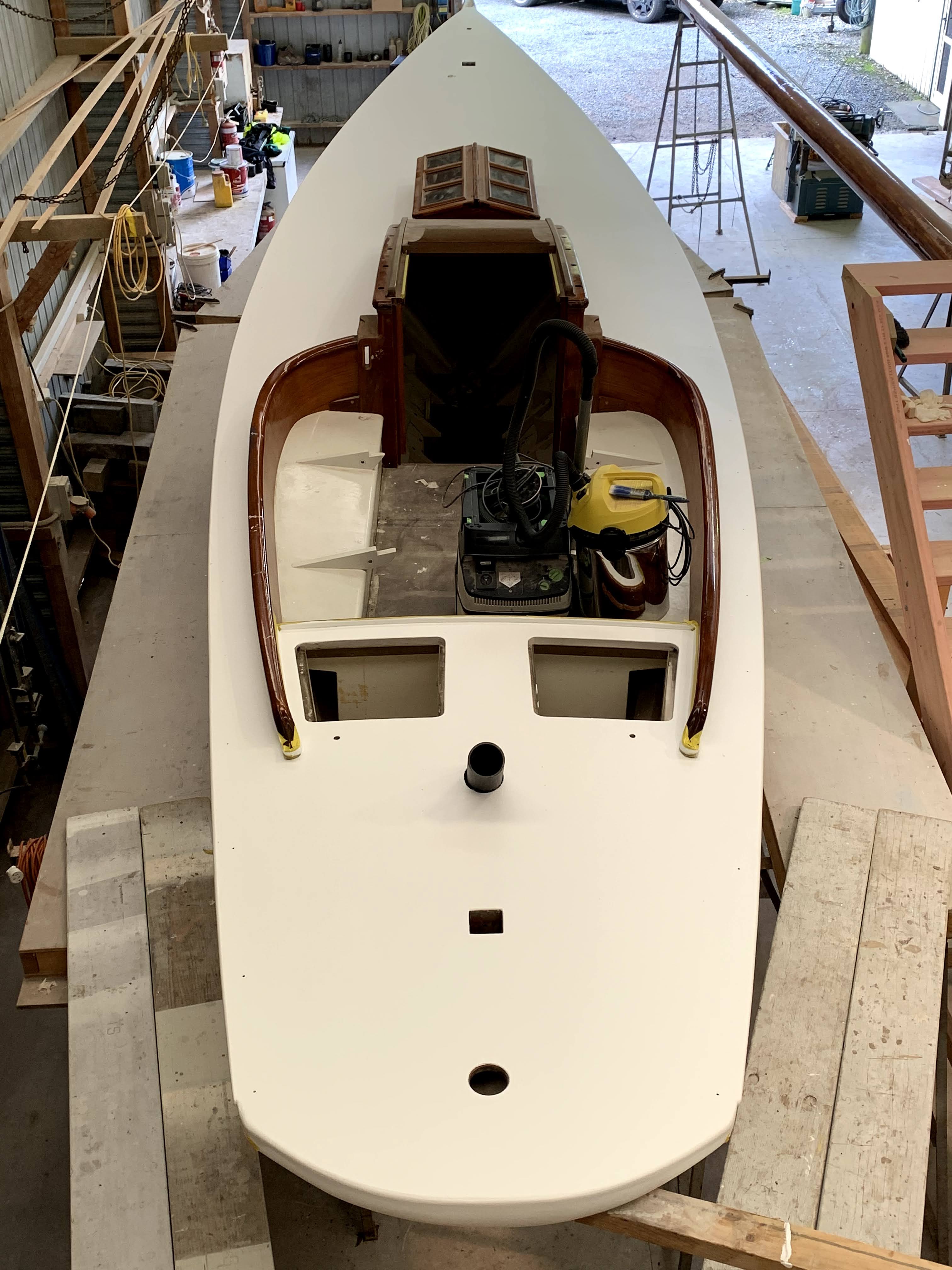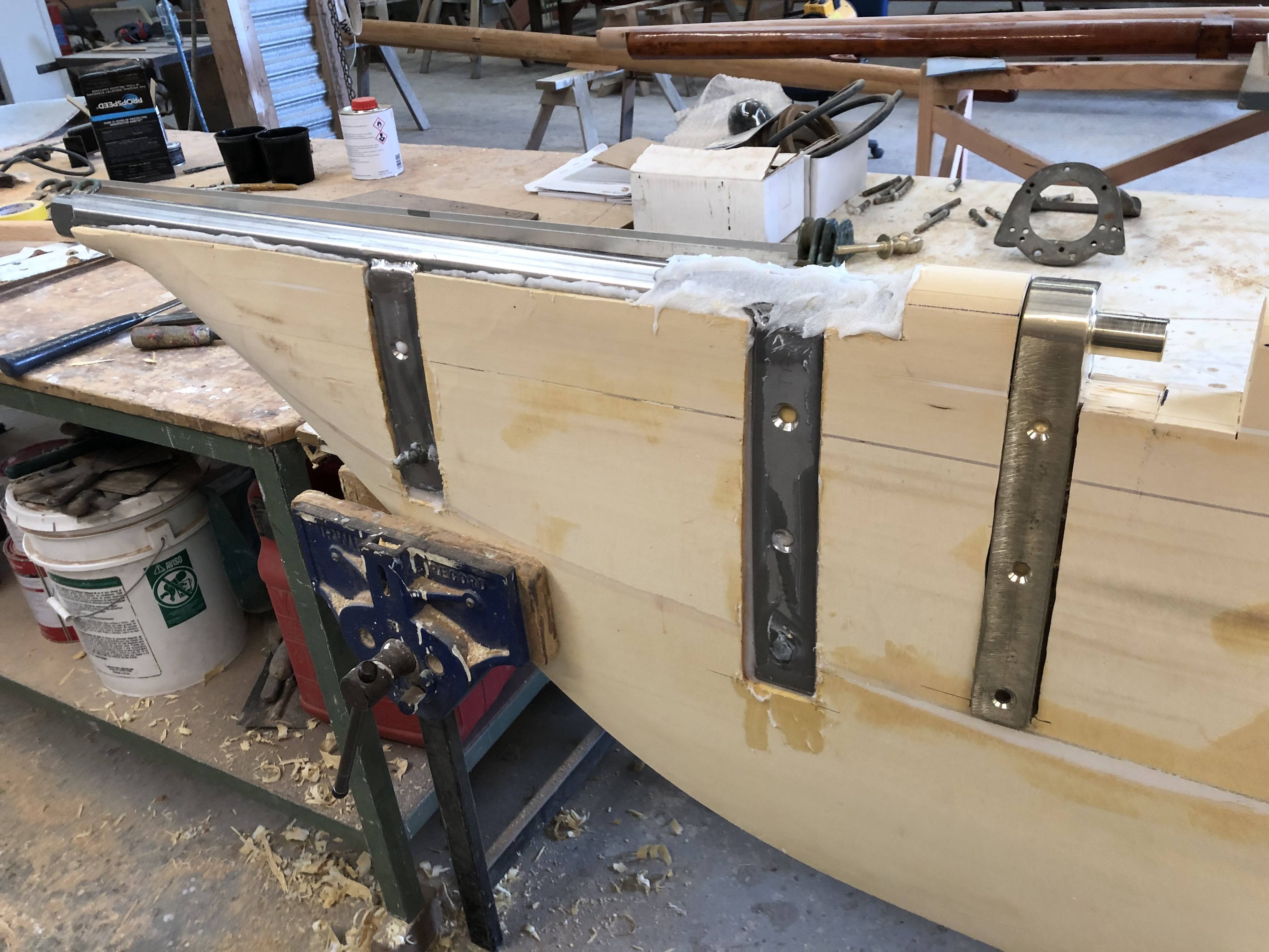 Integration of rudder with rudder stockEye bolts for running rigging and mainsheet horse, together with source patterns.D-beadingD bead let into headpiece, cove line below rising to carved koru for restorationDeck, reglassed over hull intersection …… and refaired and undercoated.