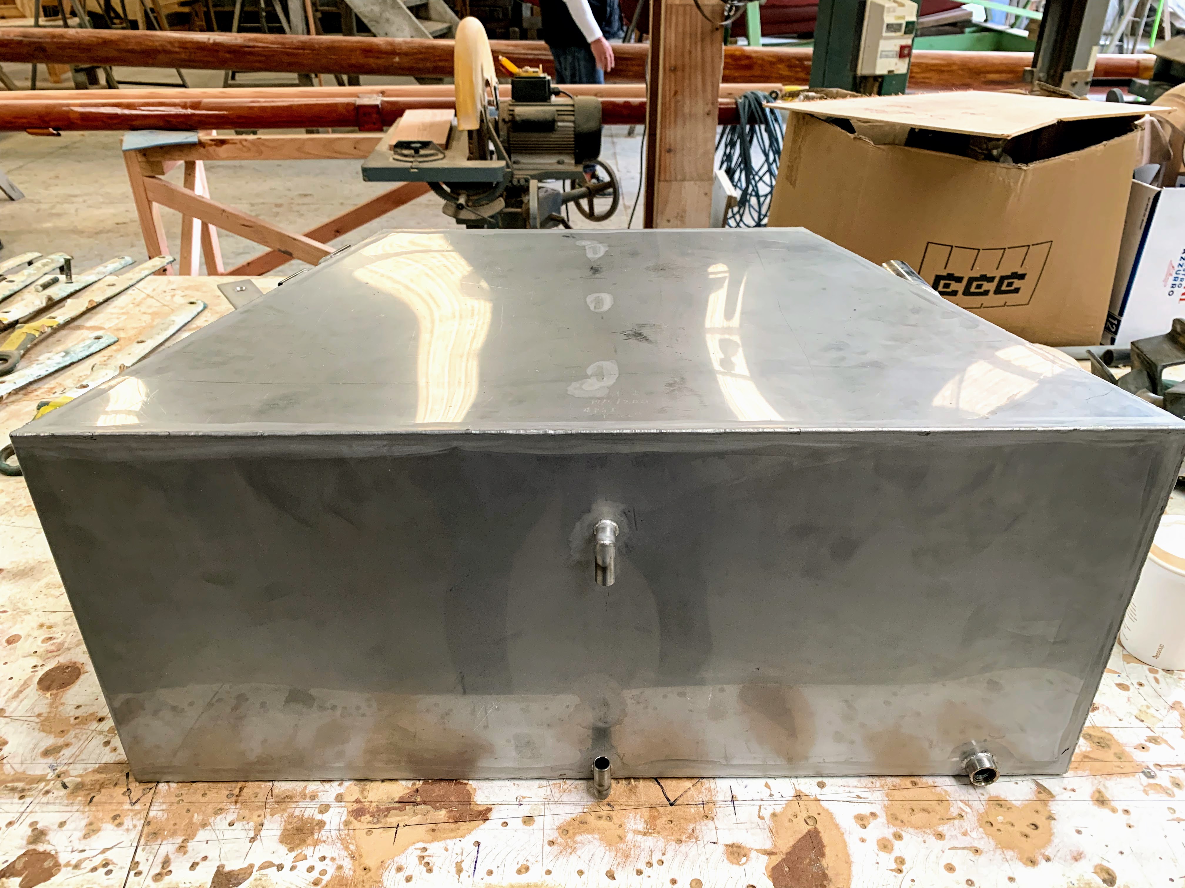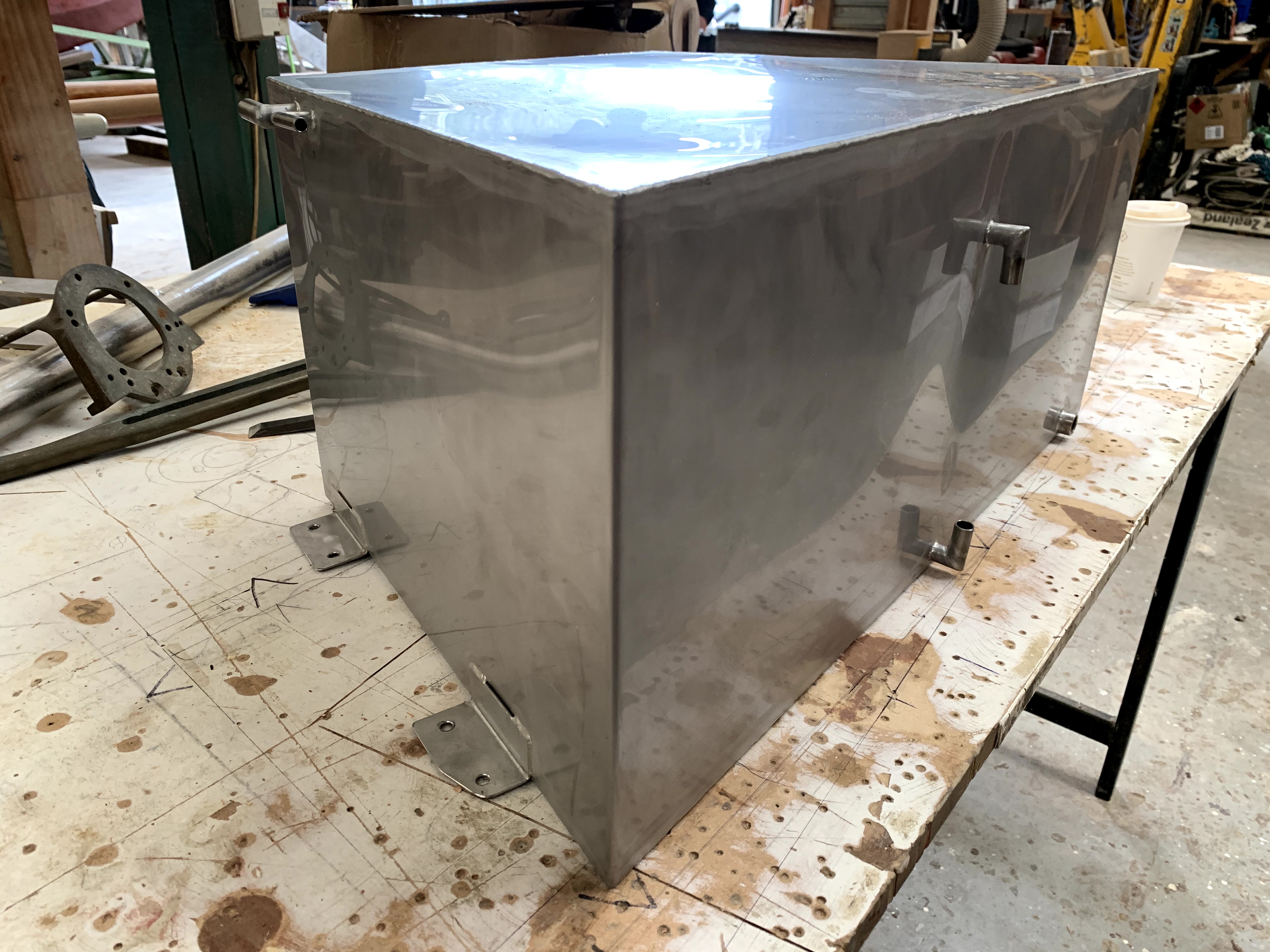 Not in Wellington now, Dr Ropata. Need more fuel than merely to get in and out of the berth. So, in place of the intended tote tank under the cockpit floor, this template for a baffled tank in its place.And here it is, 67 litres of goodness. Sightglass and outlet to engine on front panel; port aft, fuel supply to deckfiller; starboard aft, return and breather. Reduced height forward sampson postGammon iron supportCove line termination: with a hat-tip to the Sangermani Sahib for her dot-dot-dot, dot-dash-dot – Morse for R(ogue).