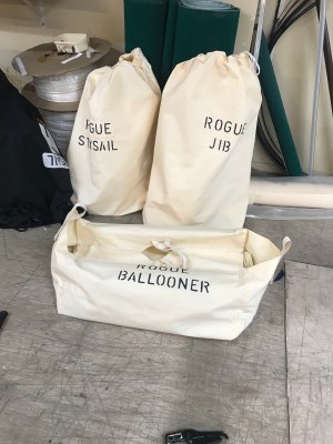 Mainsail and topsail to come. All but ballooner of Haywards’ Clipper Canvas (“the only stable polyester cloth in the world designed specifically for traditional and classic sails”) Light (7.2 oz). Looks, feels, and sounds like canvas. And the ballooner is from the excess of the Contender Superkote 130 light cream special run made for Ariki.