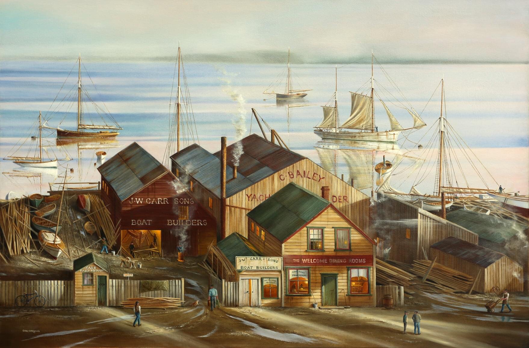 Sean Garwood, a Nelson-based artist, presently has a New Zealand maritime-themed exhibition — “A Painted Voyage” — at Parnell’s Jonathan Grant Gallery. It includes a representation of the Bailey Boatyard at Auckland’s Freemans Bay …