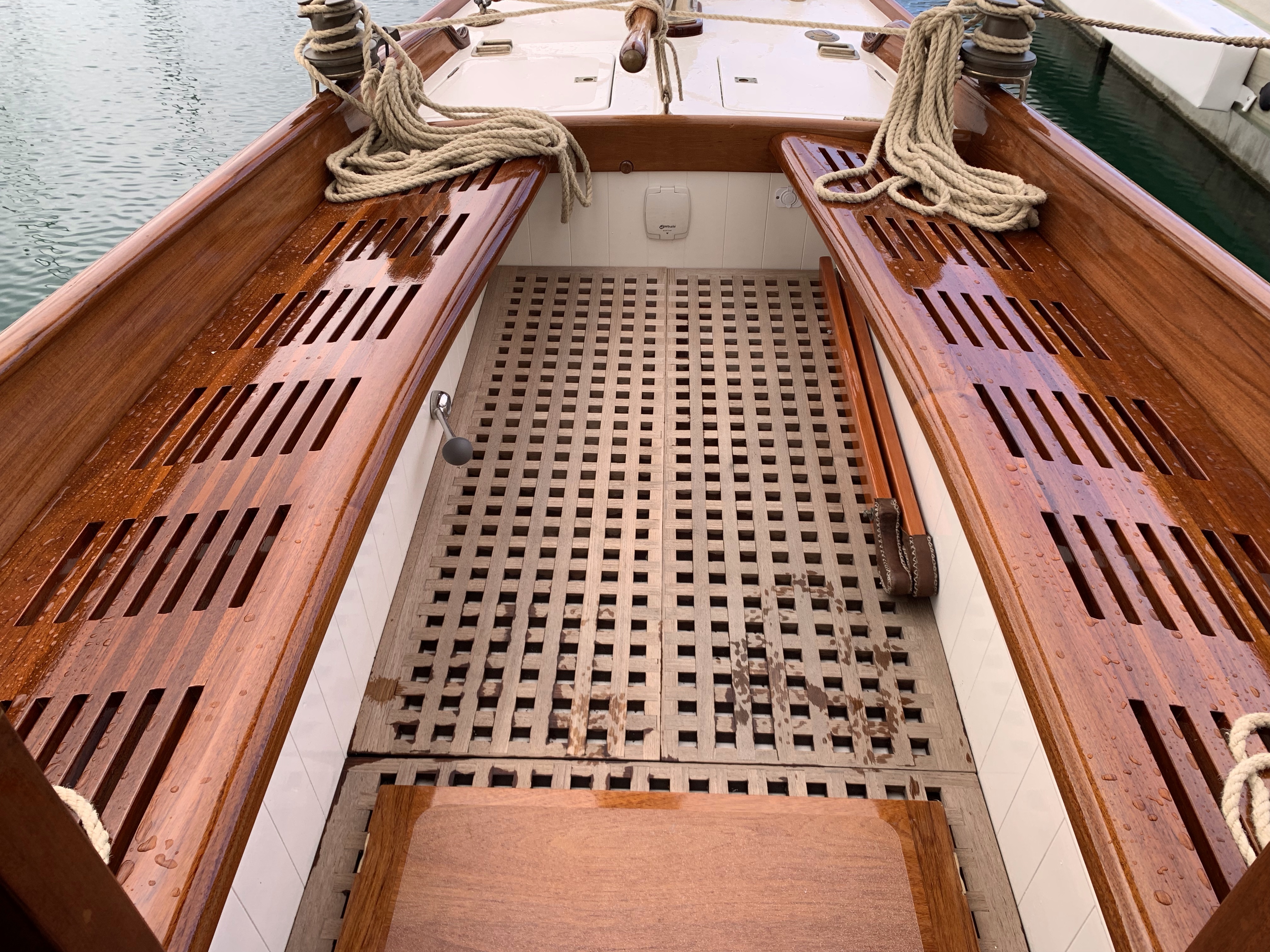 Muscled-up cockpit seats are back in, as are the backstay runner levers on realigned bases, and safety bars fitted to the butterfly hatch (necessary for crew safety, as everyone automatically places a bracing foot there when working around the mast, but regrettably obscuring Sarah Maxey’s etching). Below, dogs finally have been sourced to secure the butterfly hatch closed.